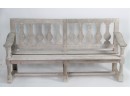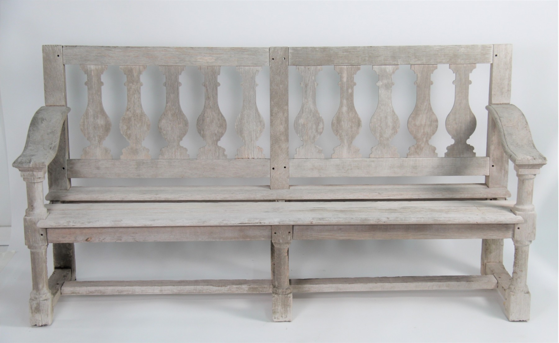 One of the center slats are missing as seen in the photos ant the bottom of the legs have wear as seen in the photos . A fantastic heavy outdoor piece