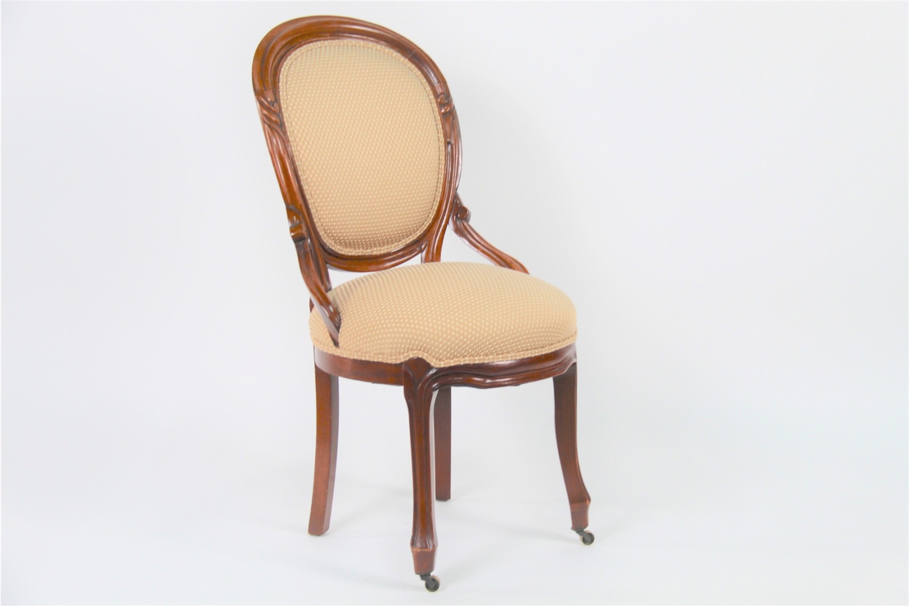 This chair is covered in a caramel and white fabric and in excellent condition