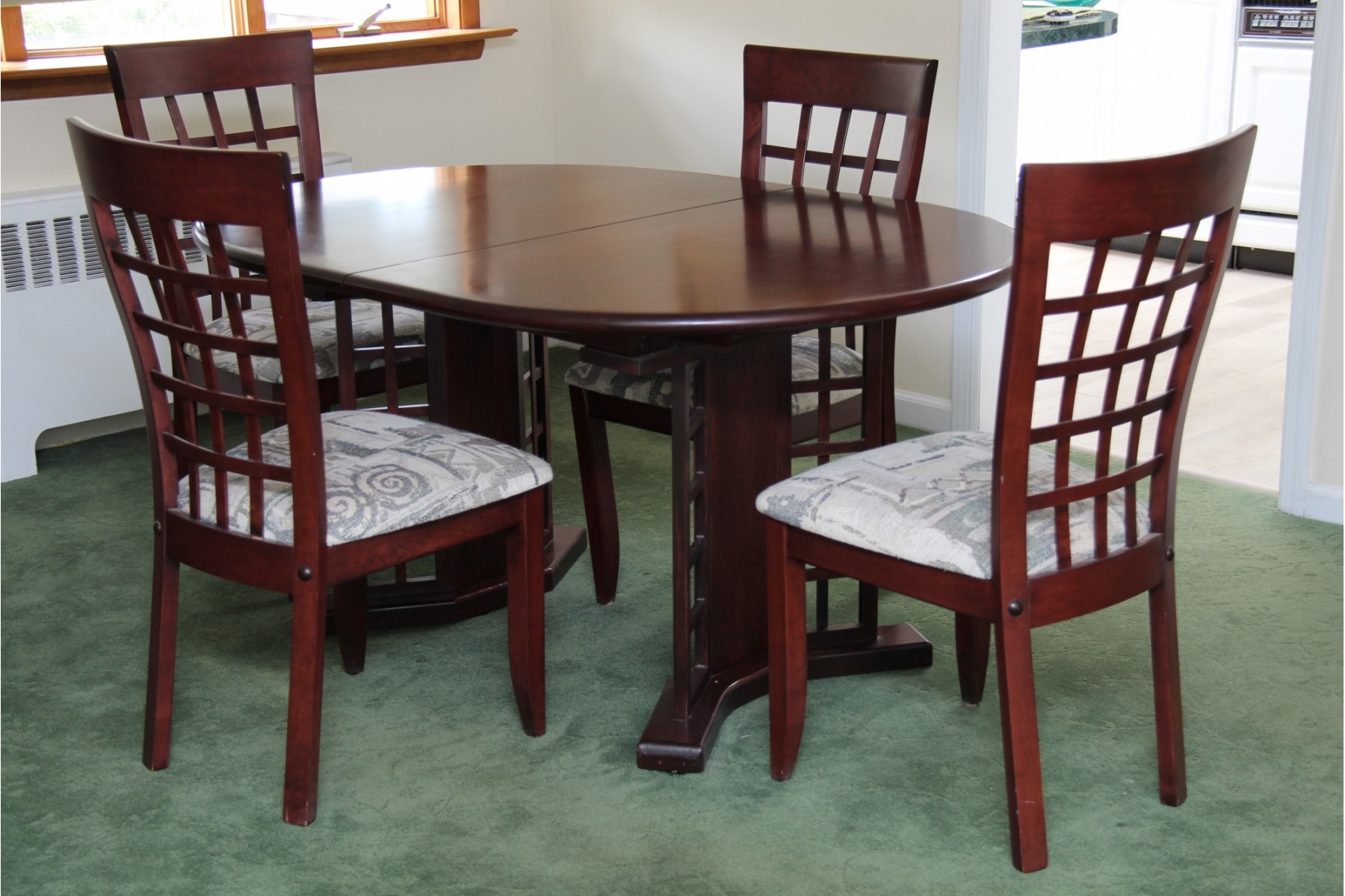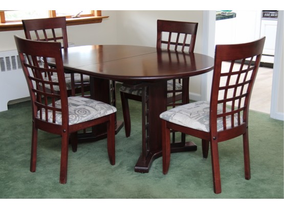 Beautiful dining set in excellent condition that include four upholstered seat chairs with a crossing back pattern