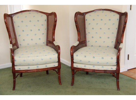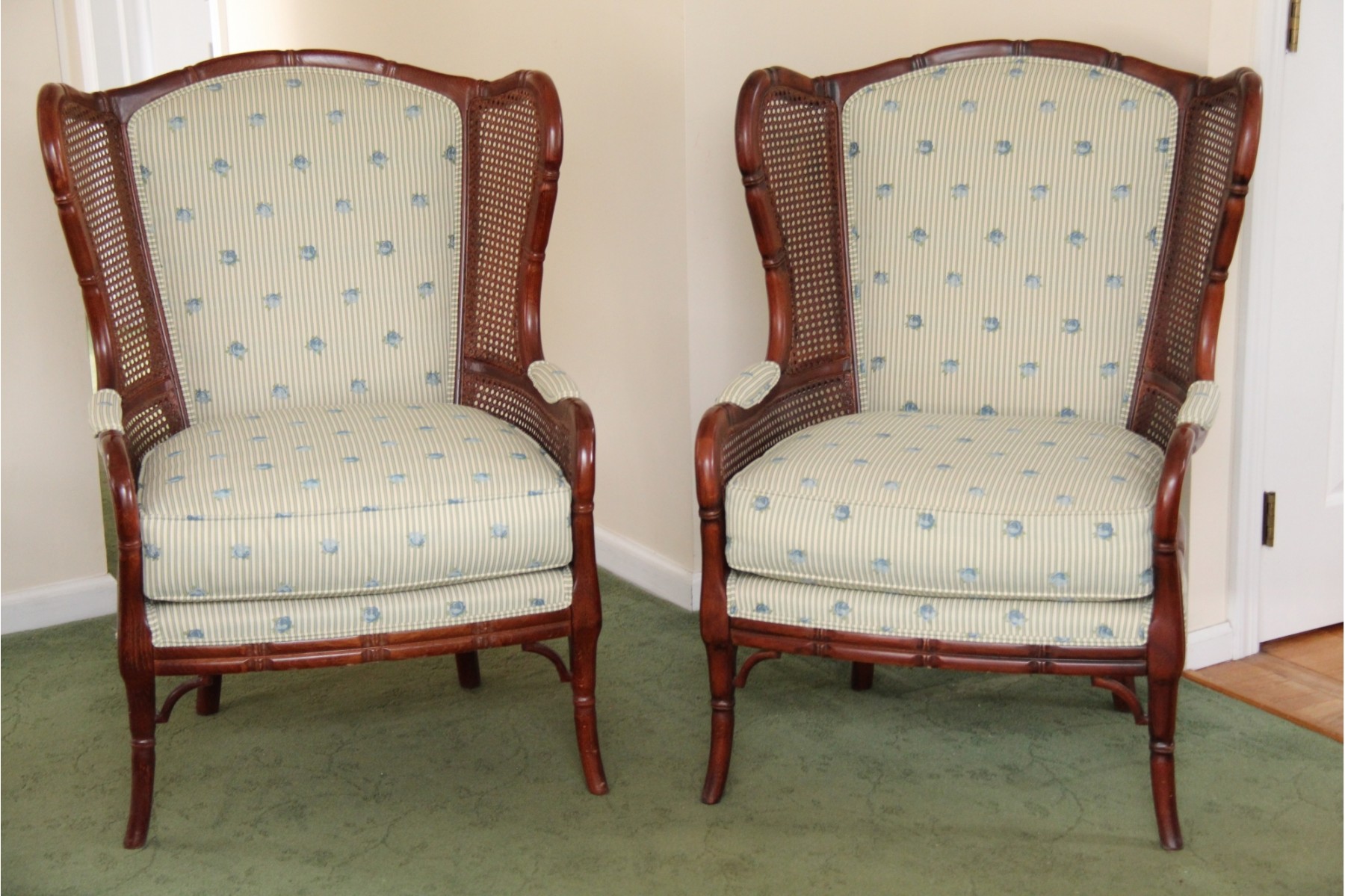 Beautiful set of chairs covered in a light green and white fabric with blue floral accents. The chairs feature a cane back and bamboo style accent