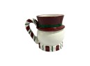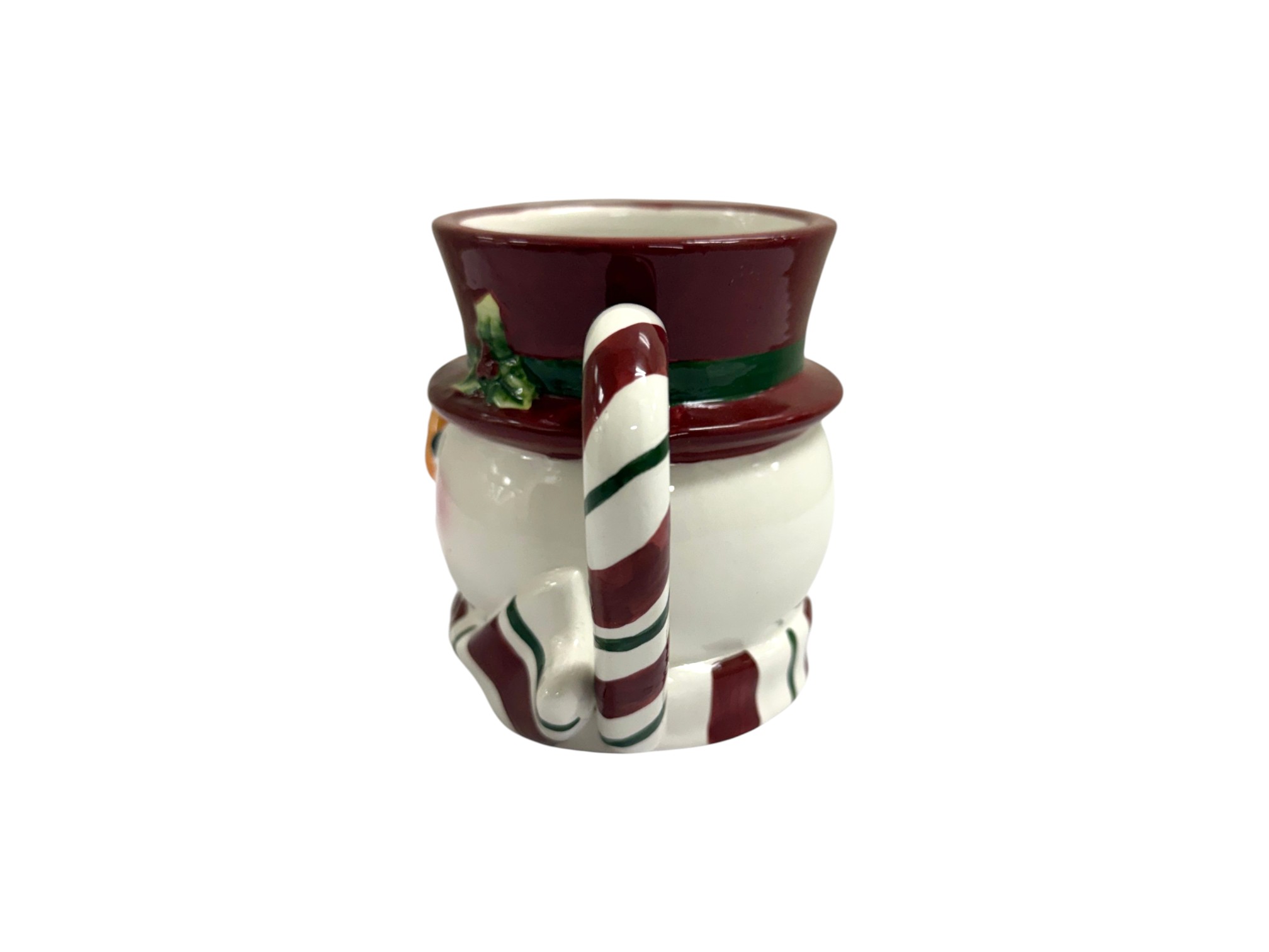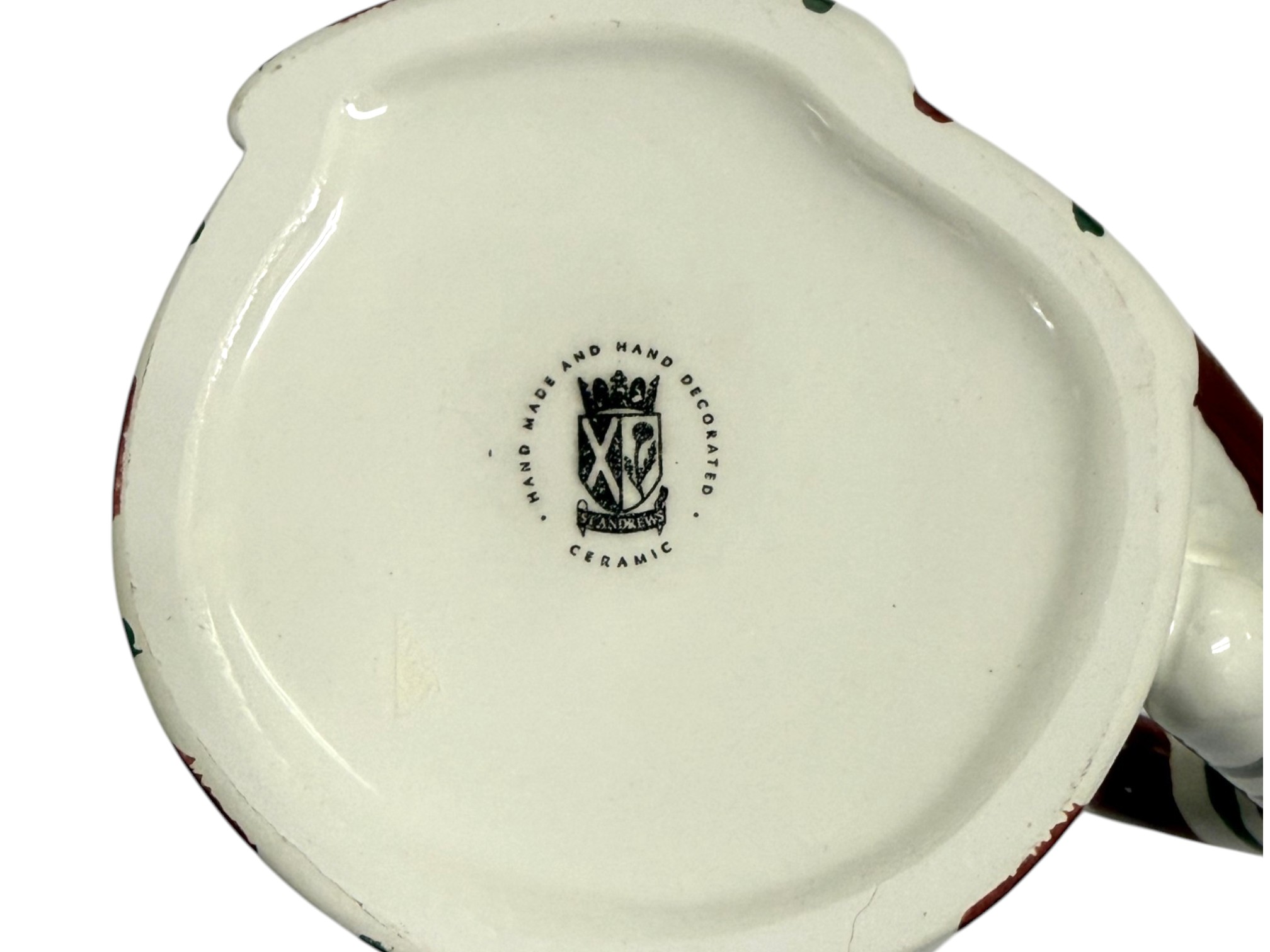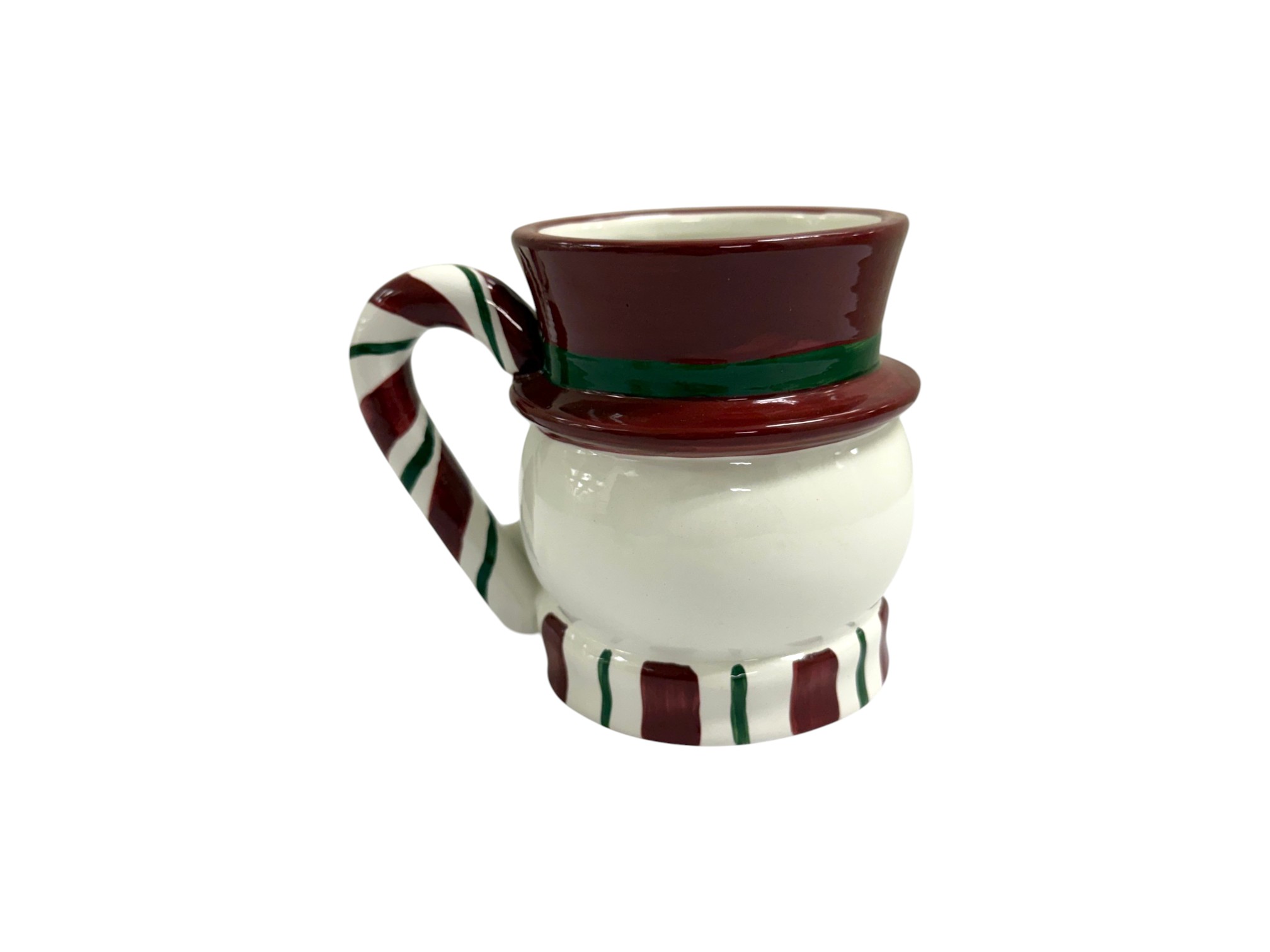 Handmade and hand-decorated ceramic mug in the shape of a whimsical snowman with a red hat and a striped candy cane handle. Maker's mark on underside reads: "St. Andrews Ceramic," featuring a crest with a Scottish thistle and a crown.