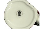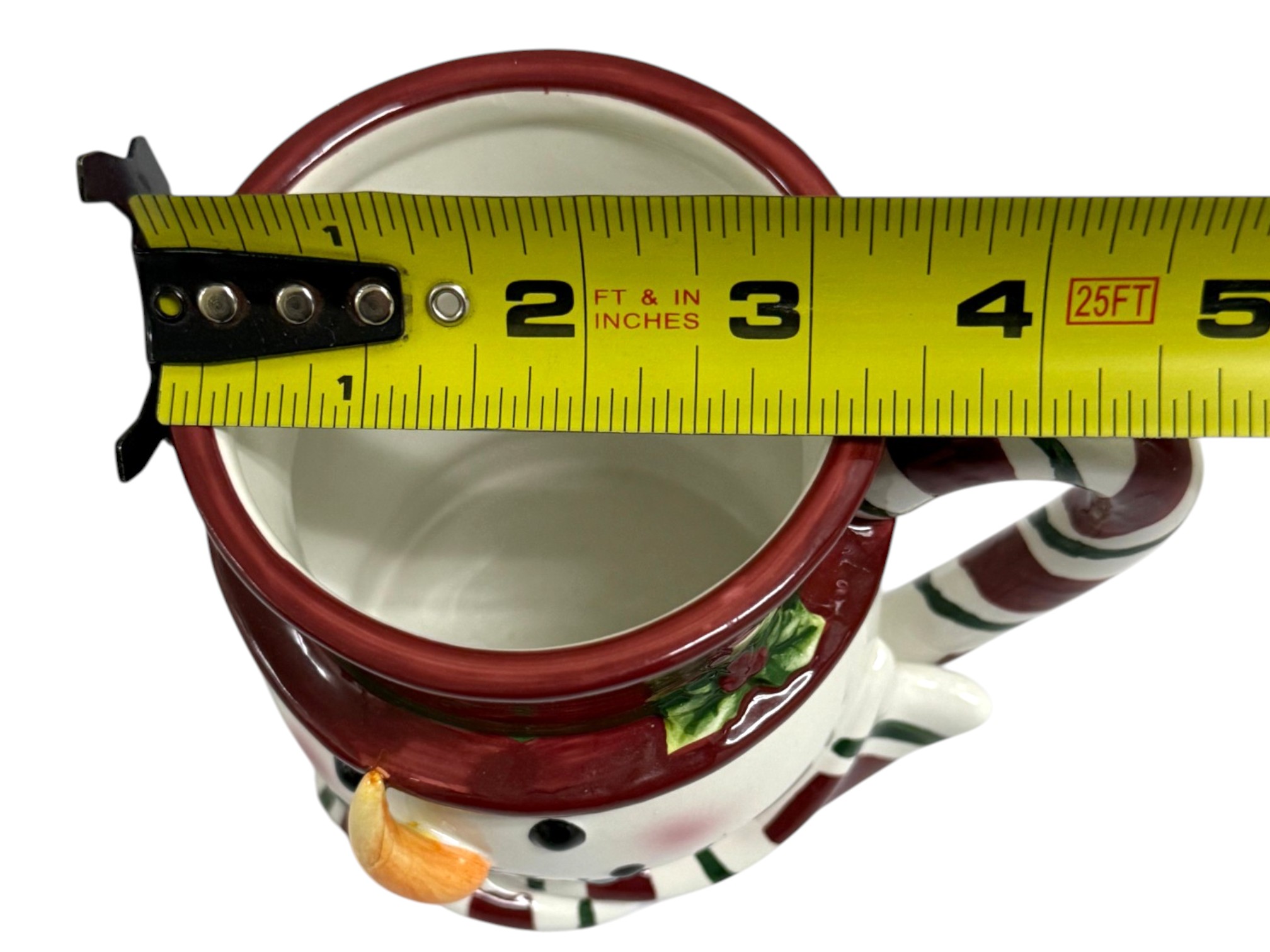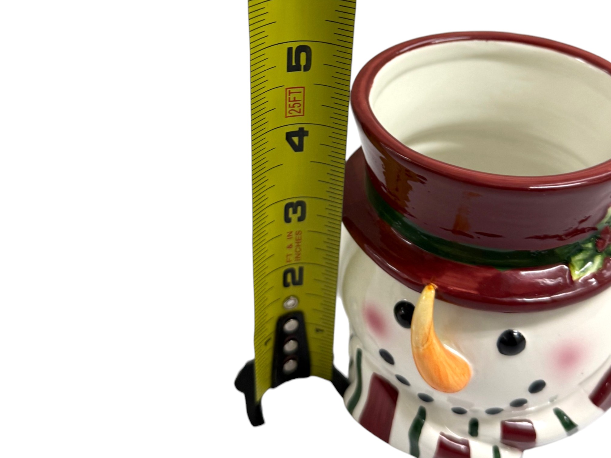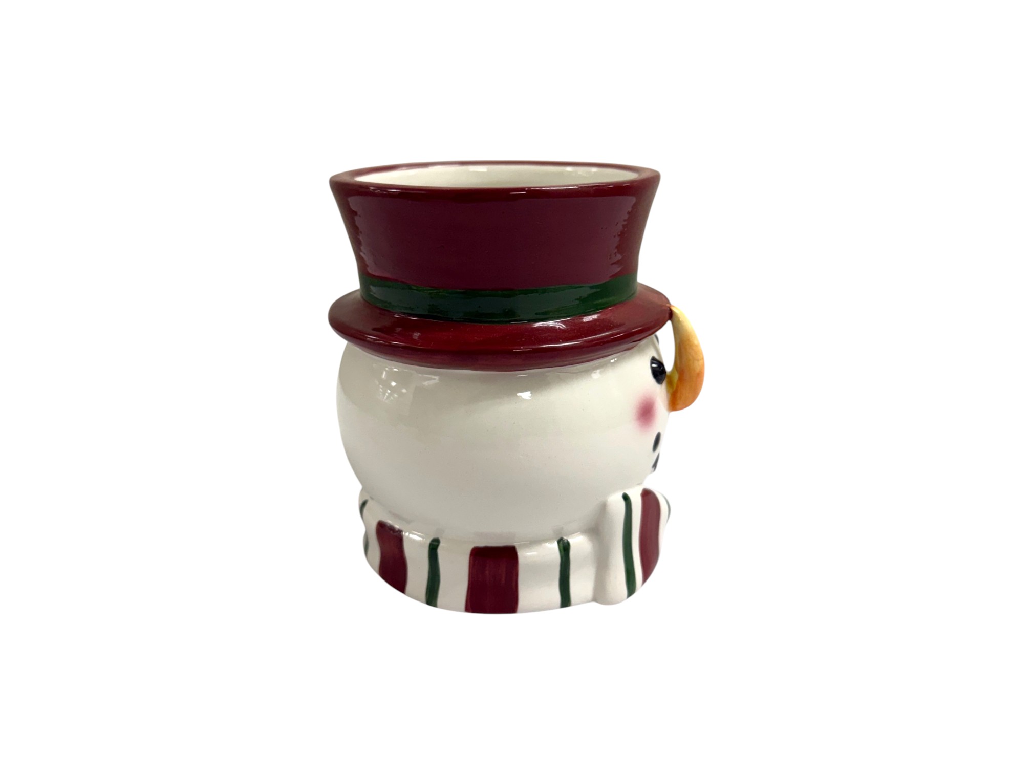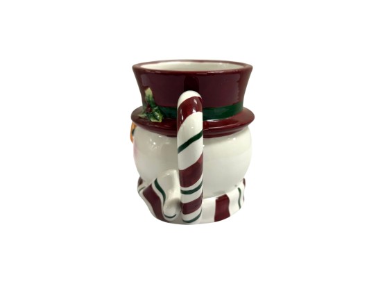 Handmade and hand-decorated ceramic mug in the shape of a whimsical snowman with a red hat and a striped candy cane handle. Maker's mark on underside reads: "St. Andrews Ceramic," featuring a crest with a Scottish thistle and a crown.