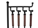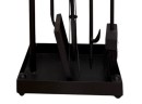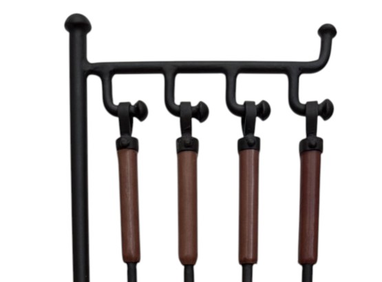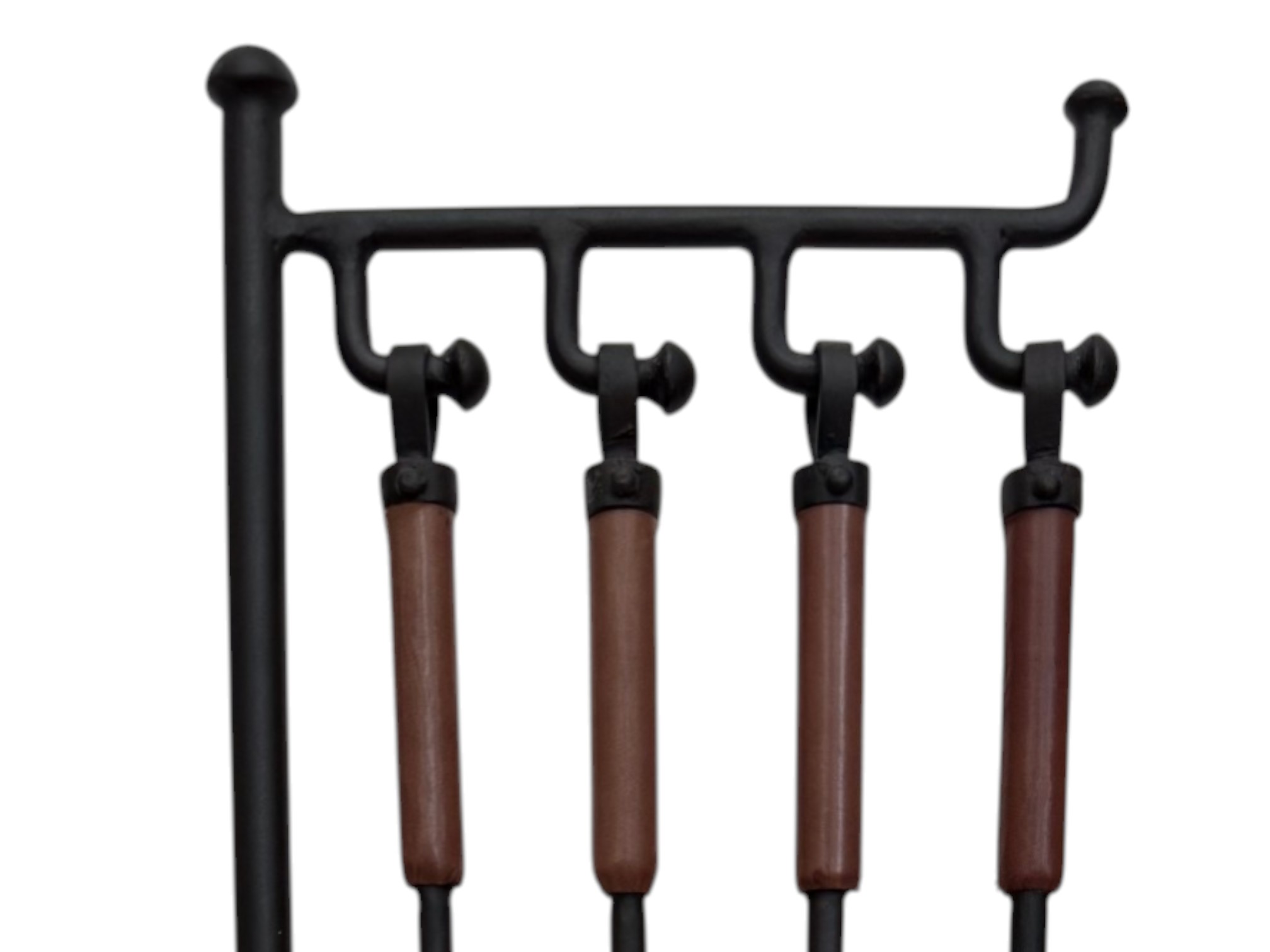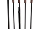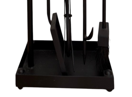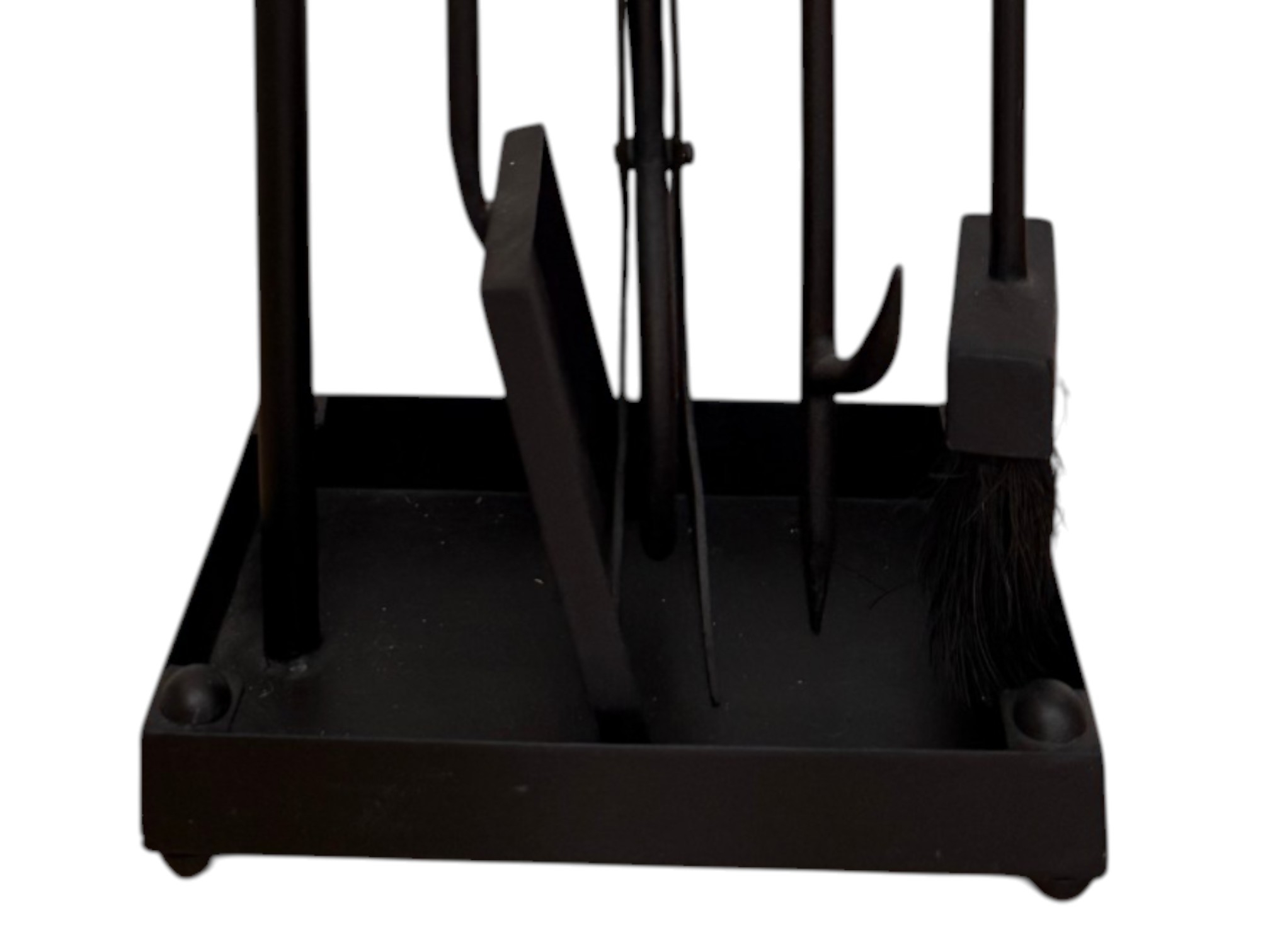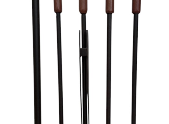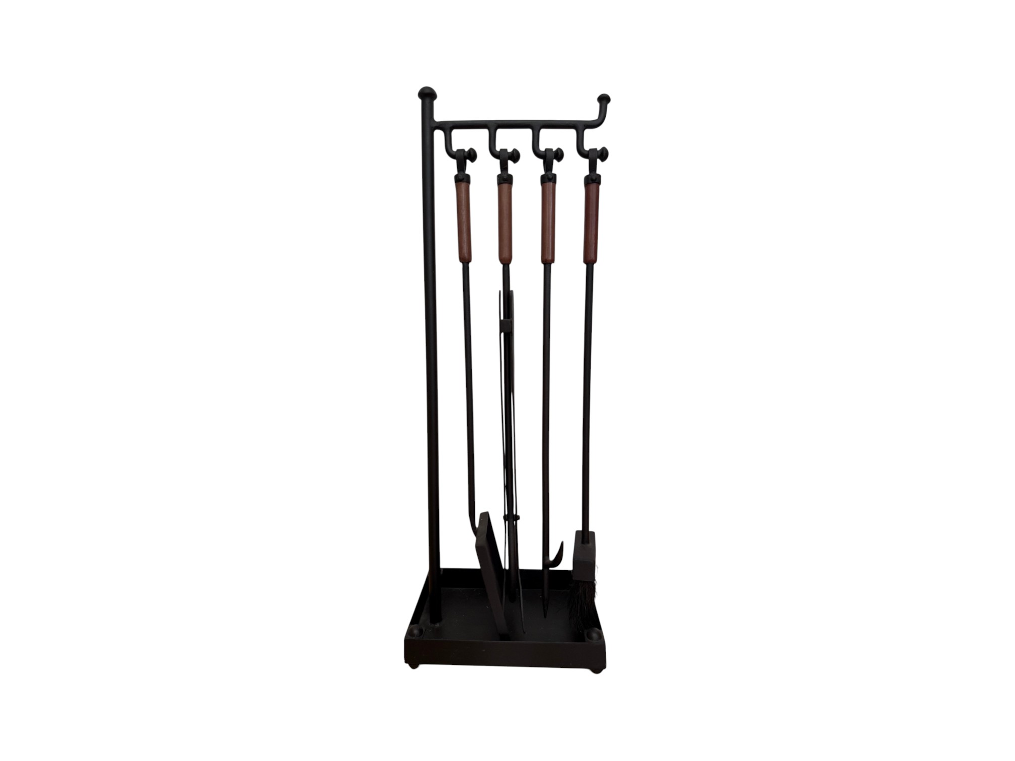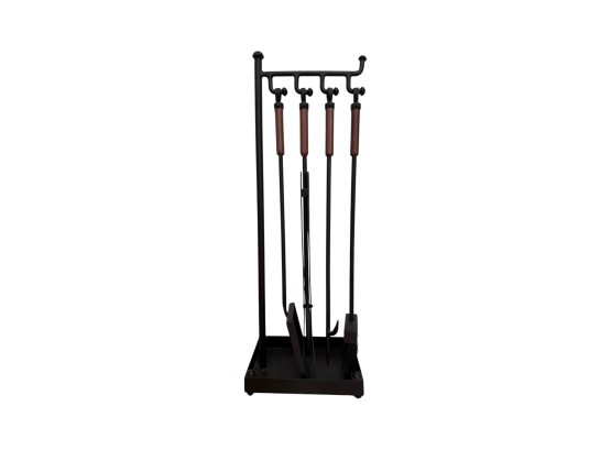 Pottery Barn industrial 5-piece fireplace tool set with a blackened finish and leather-wrapped handles, including a stand, shovel, poker, brush, and tongs.