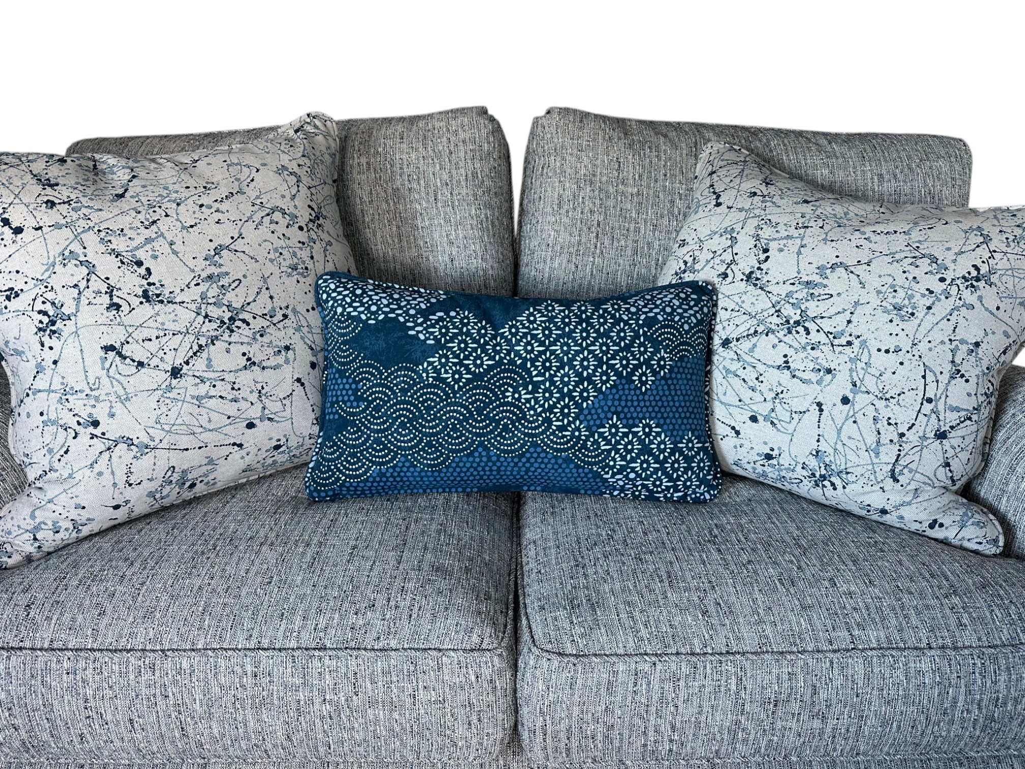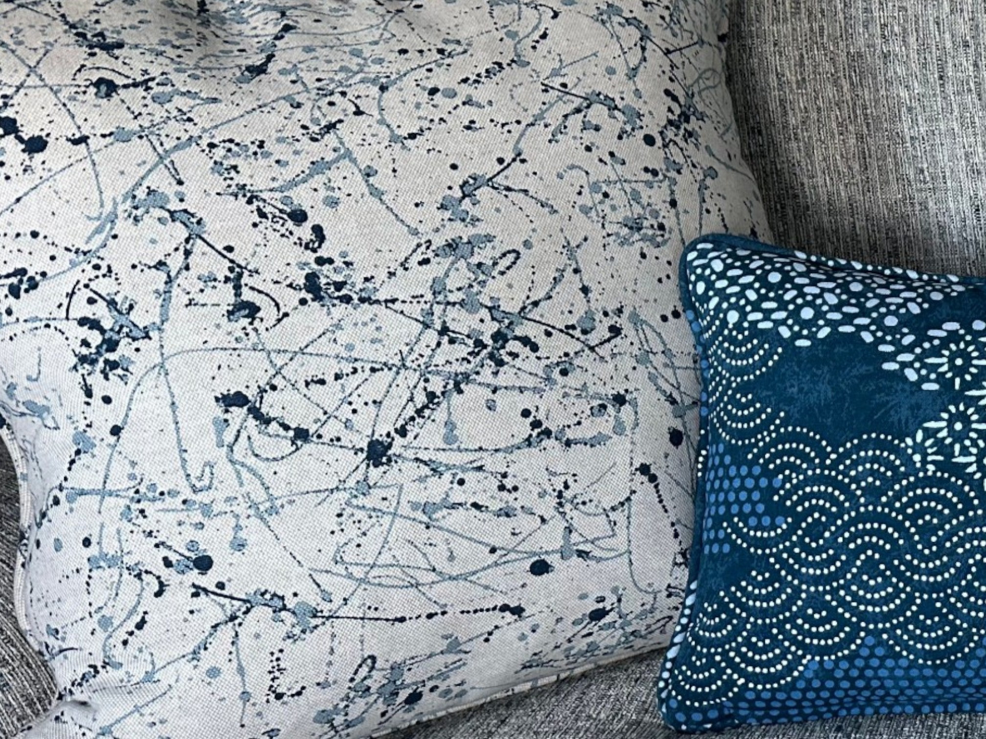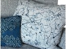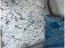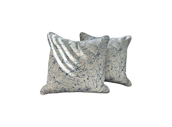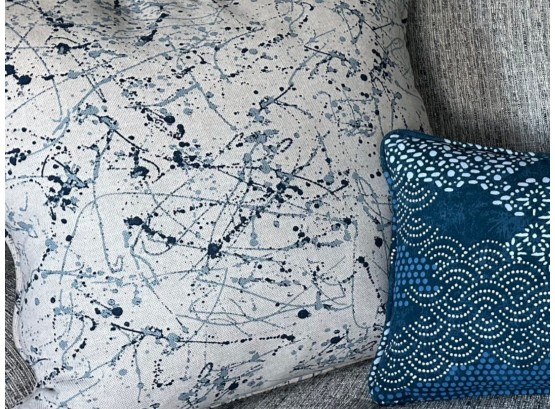 Throw pillows featuring an abstract paint‑splatter pattern in layered shades of blue, from deep navy to soft cornflower blue, creating a dynamic, artistic texture.
