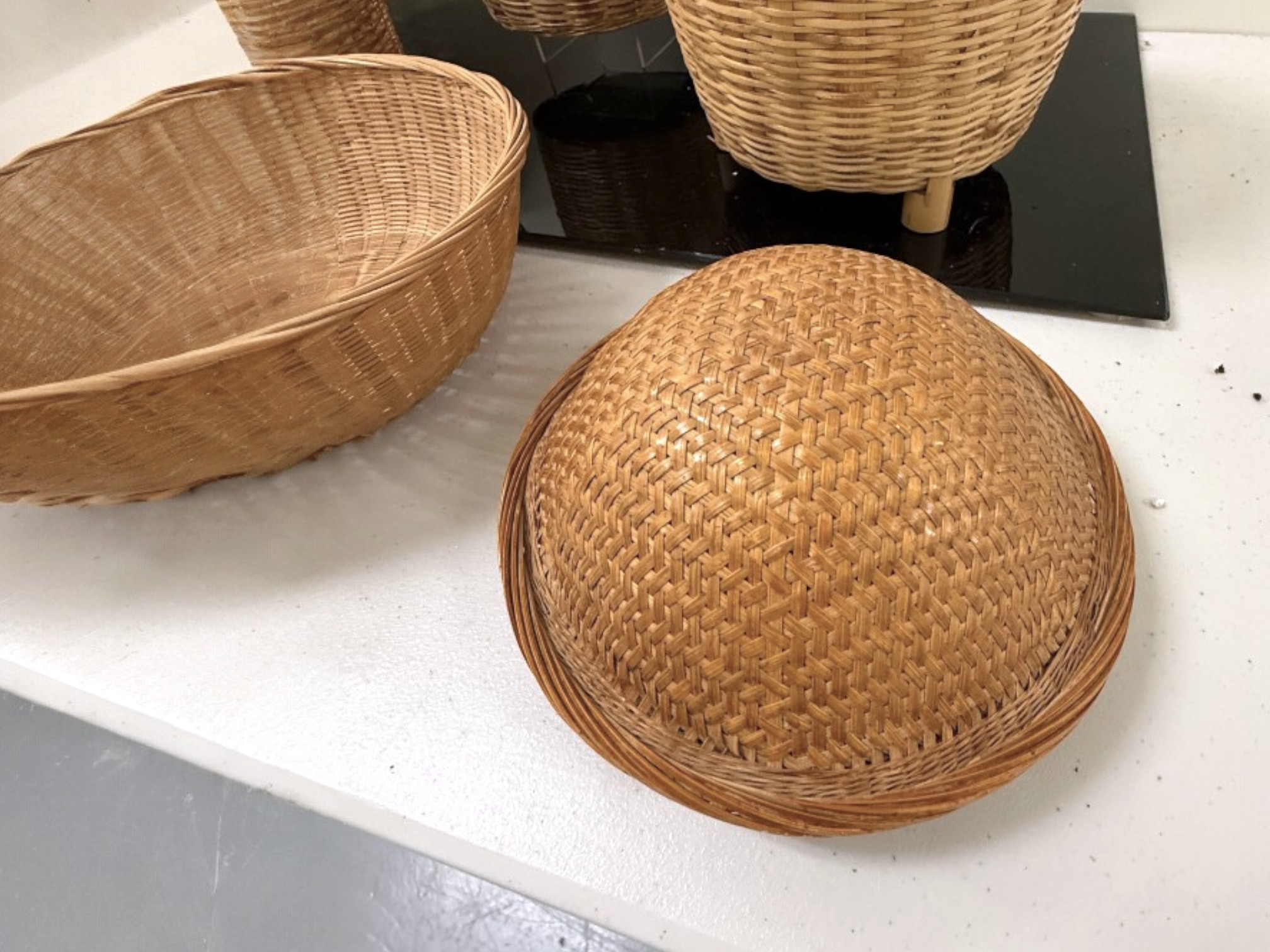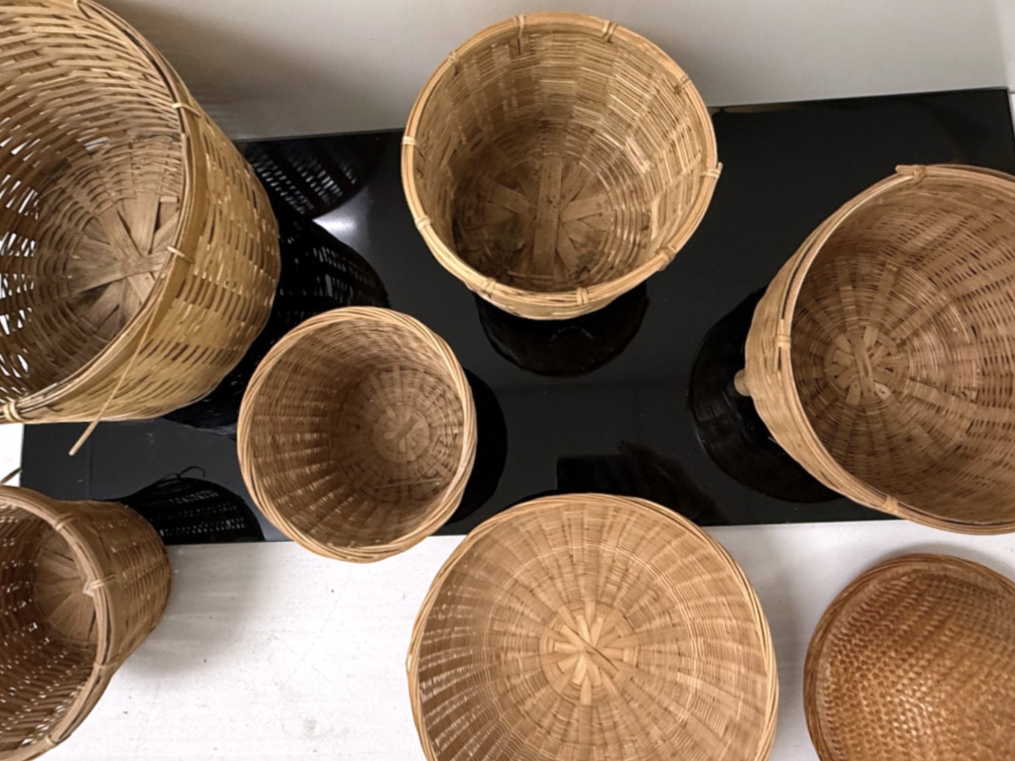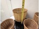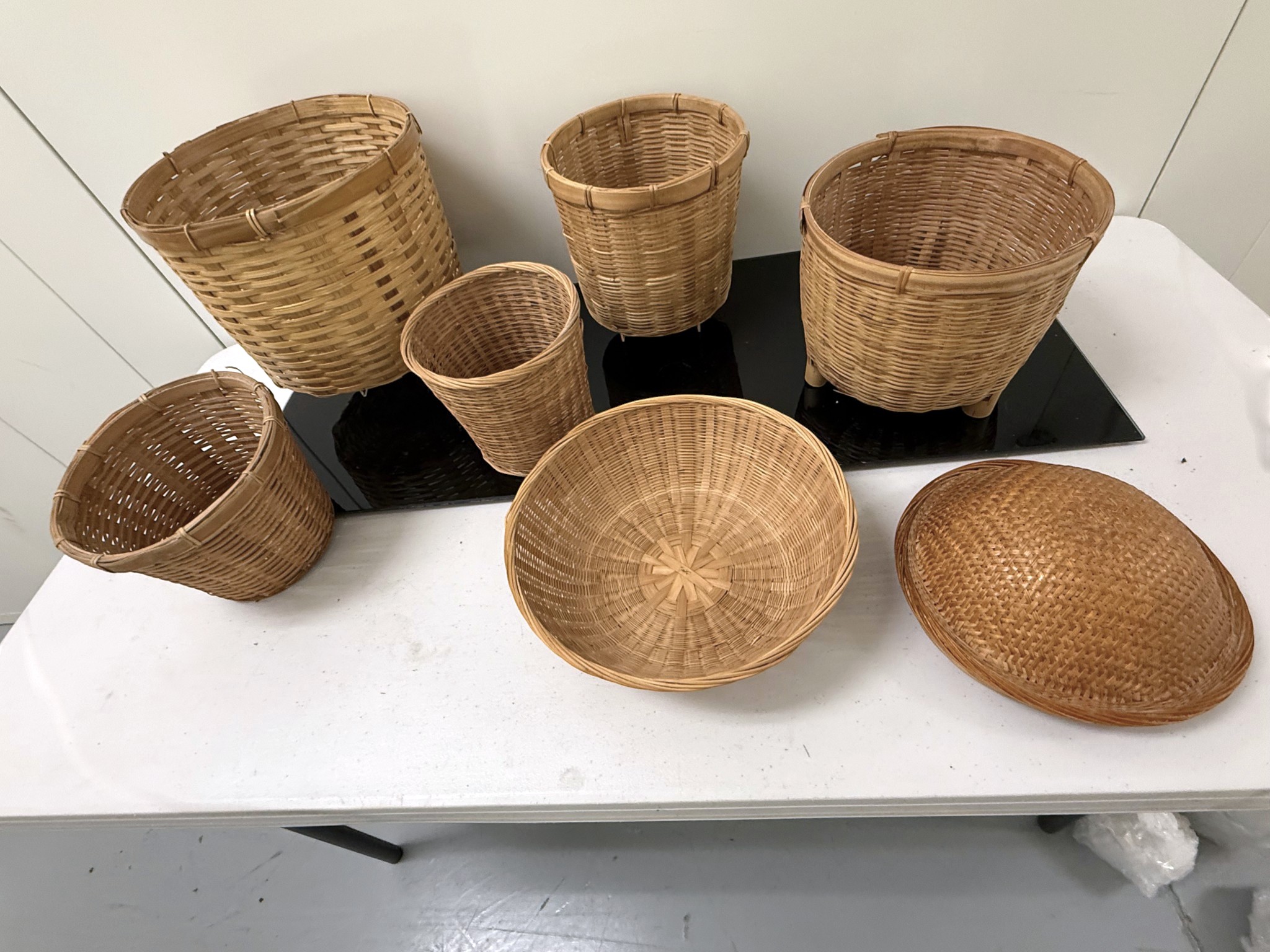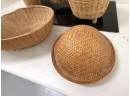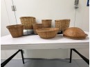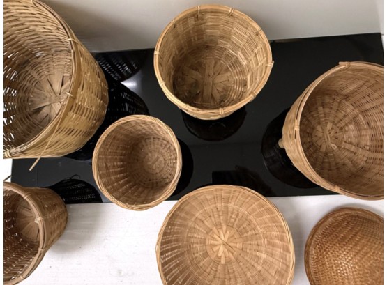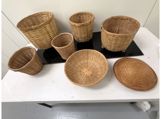 Mixed collection of seven (7) vintage woven baskets in assorted cylindrical and shallow shapes, each crafted from natural fibers with varied weaves, rim treatments, and tones, including one dome‑shaped piece that serves as a lid or cover.