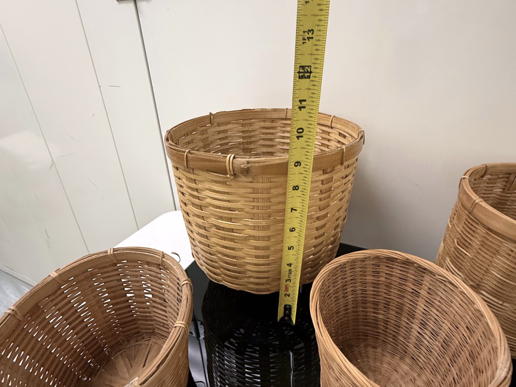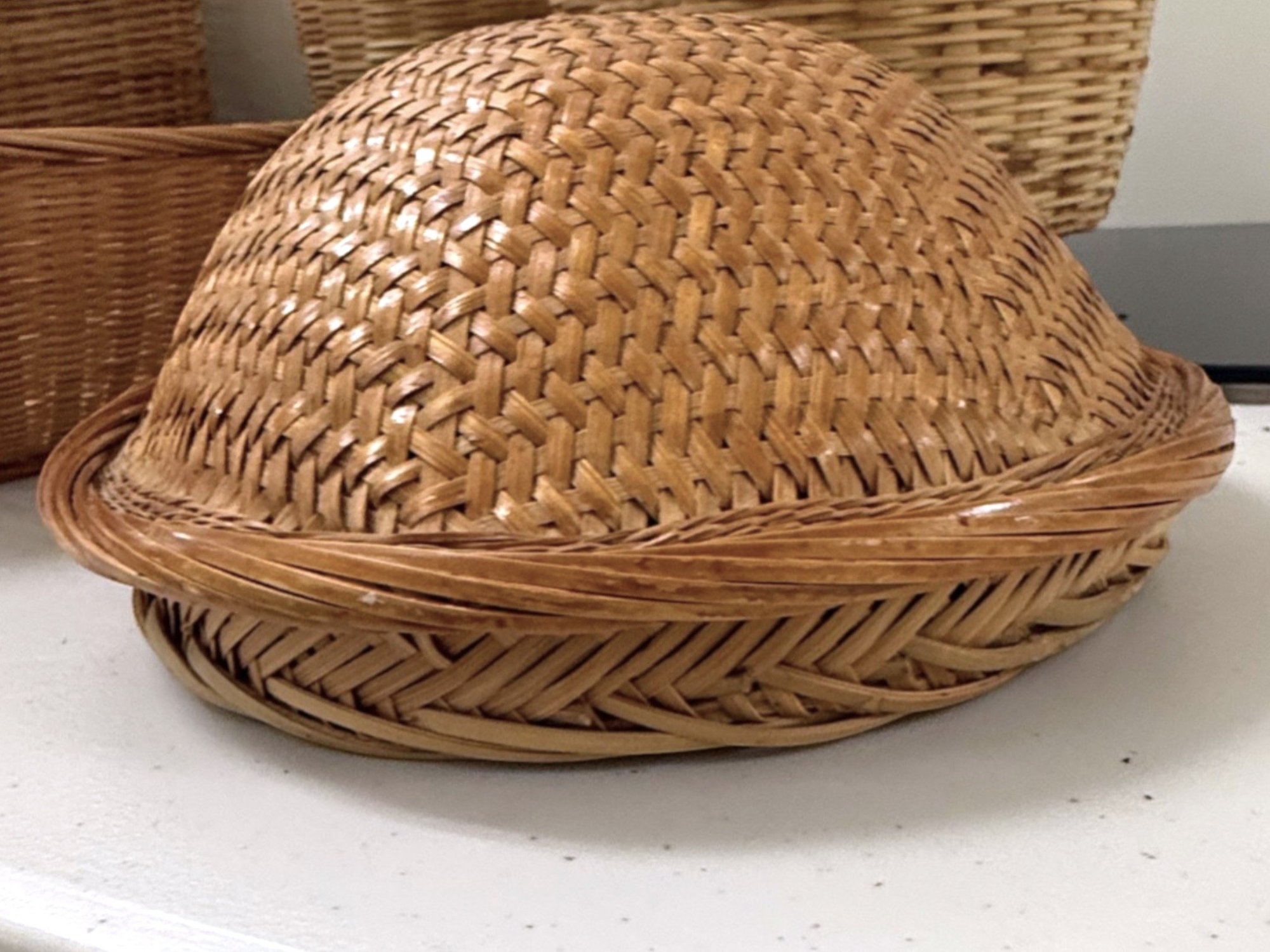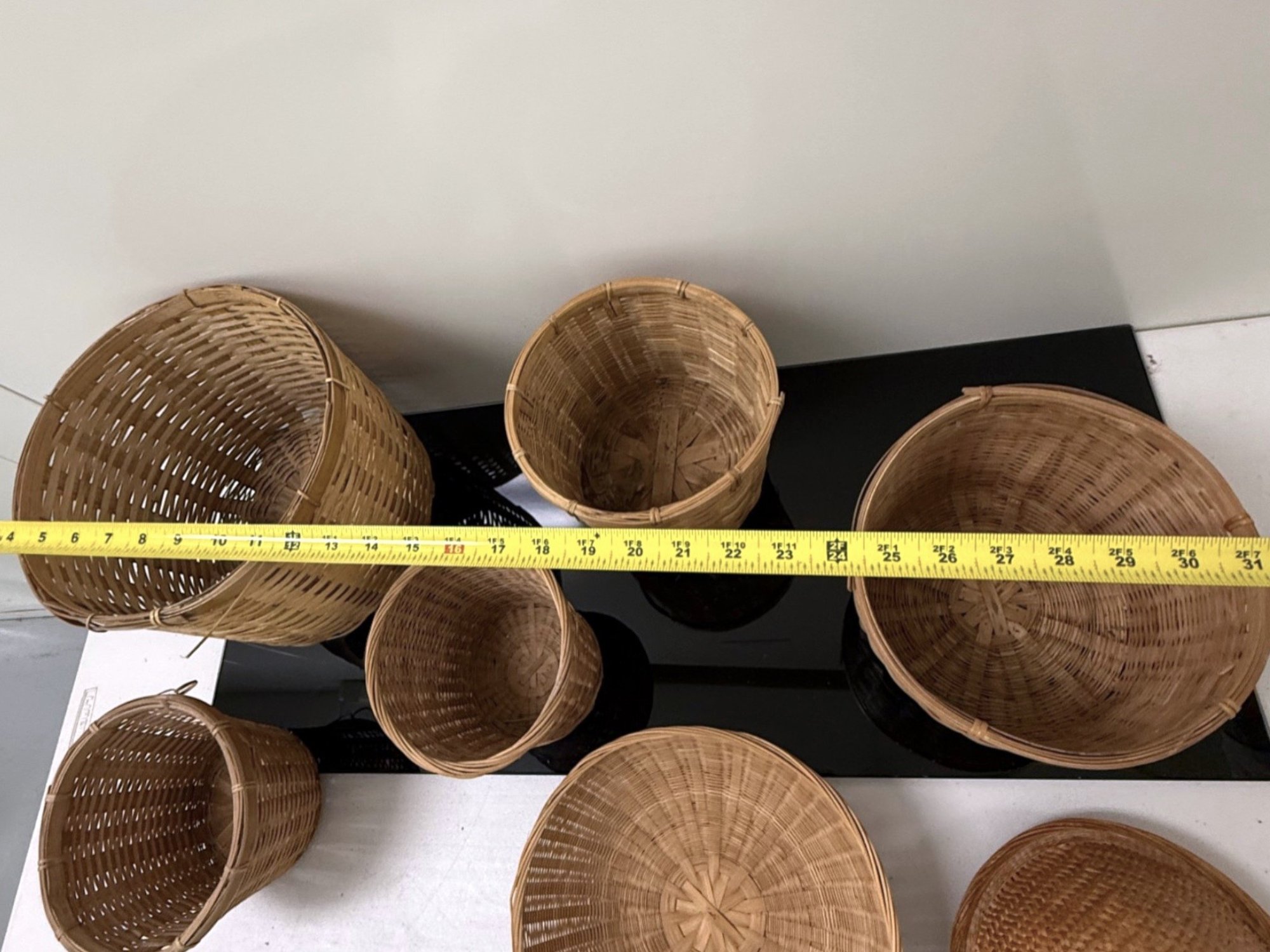 Mixed collection of seven (7) vintage woven baskets in assorted cylindrical and shallow shapes, each crafted from natural fibers with varied weaves, rim treatments, and tones, including one dome‑shaped piece that serves as a lid or cover.
