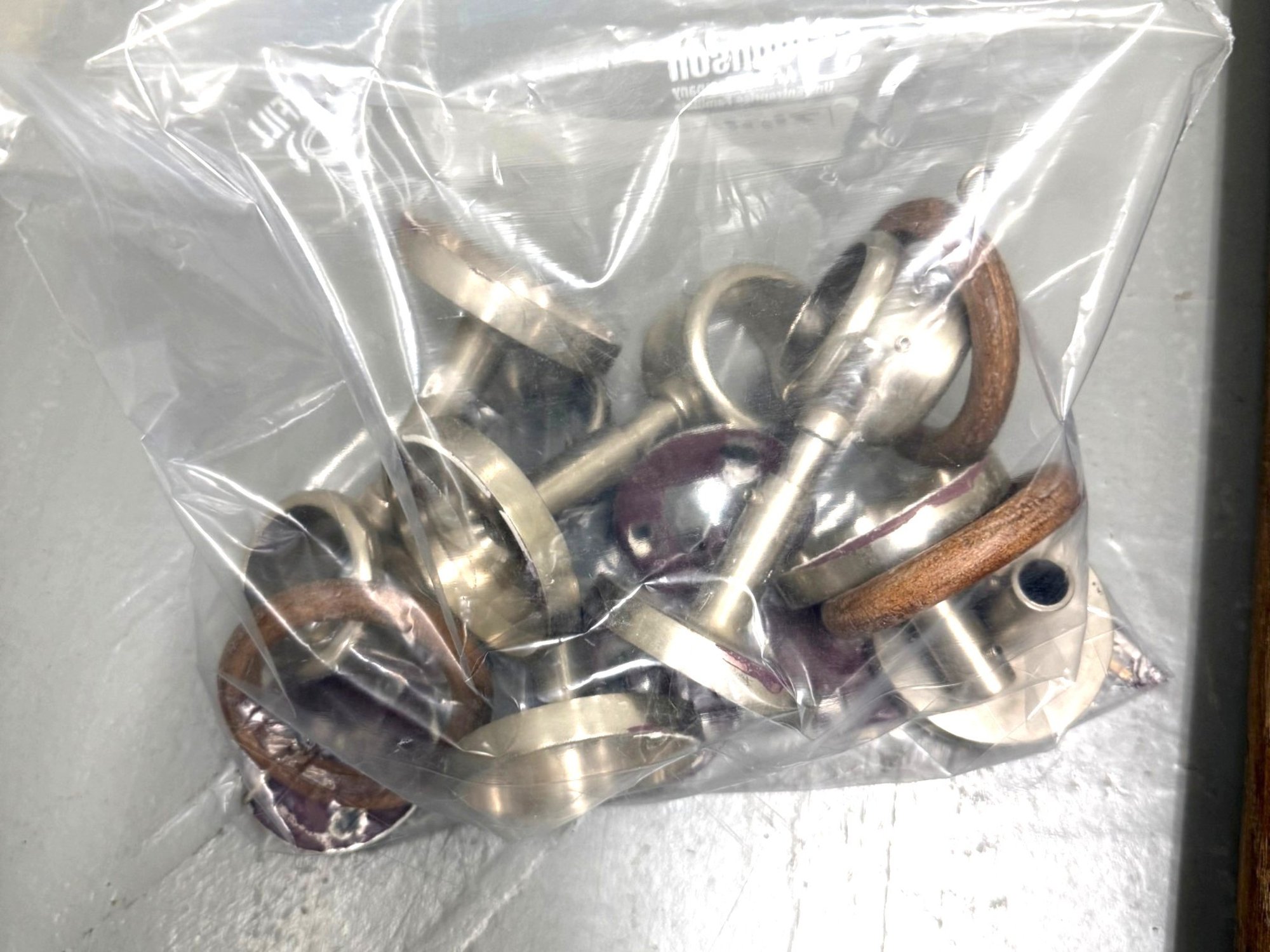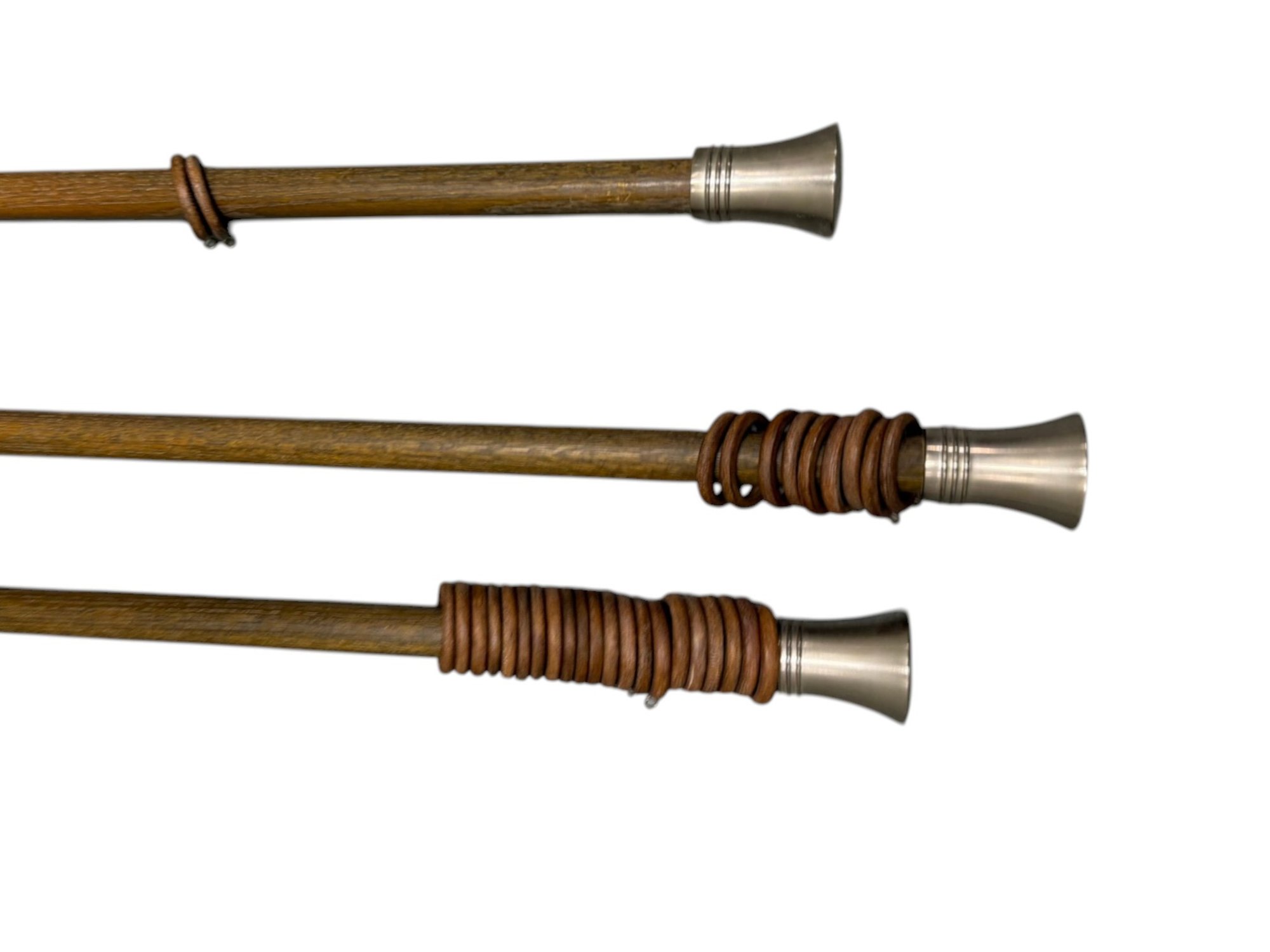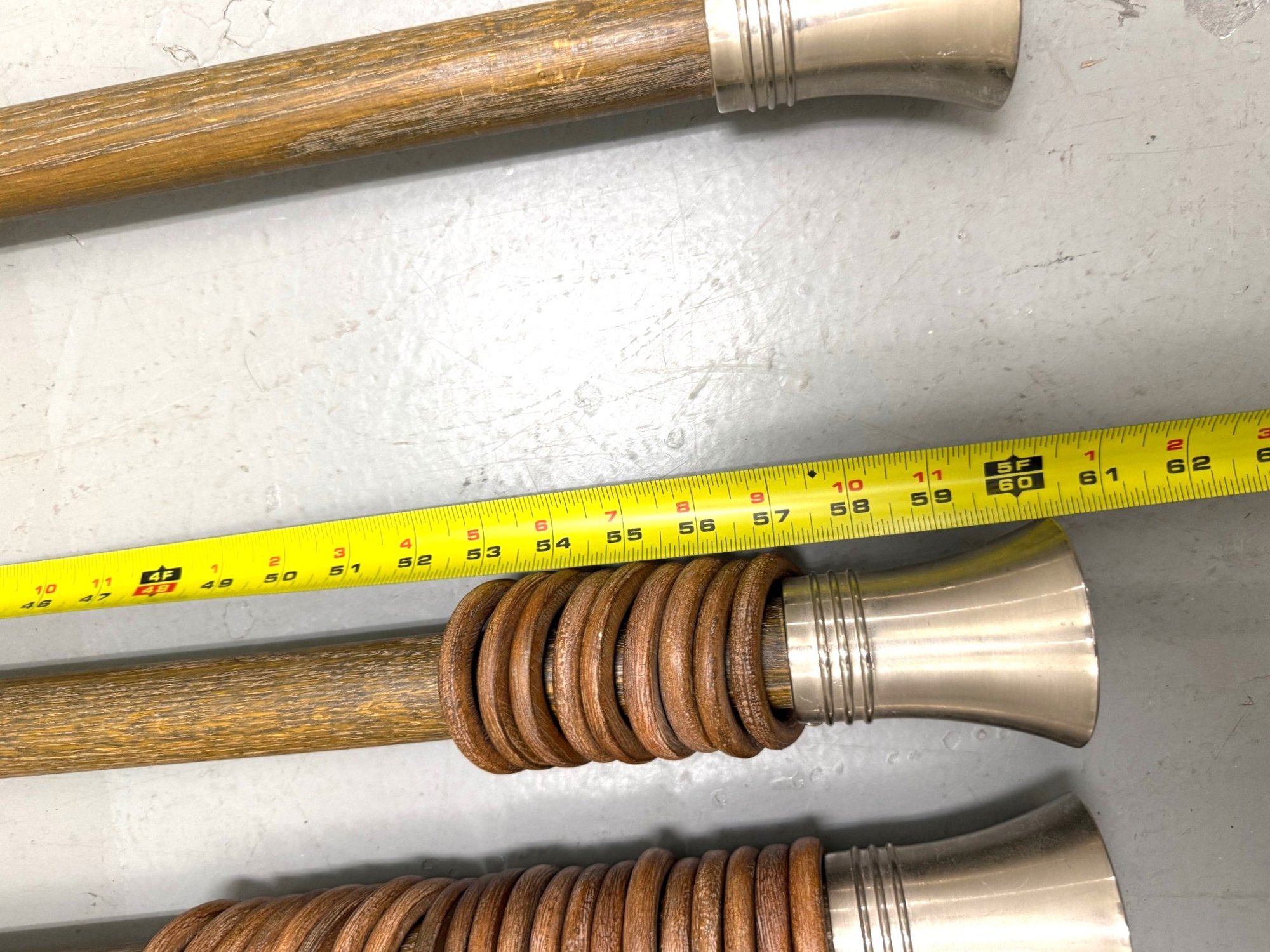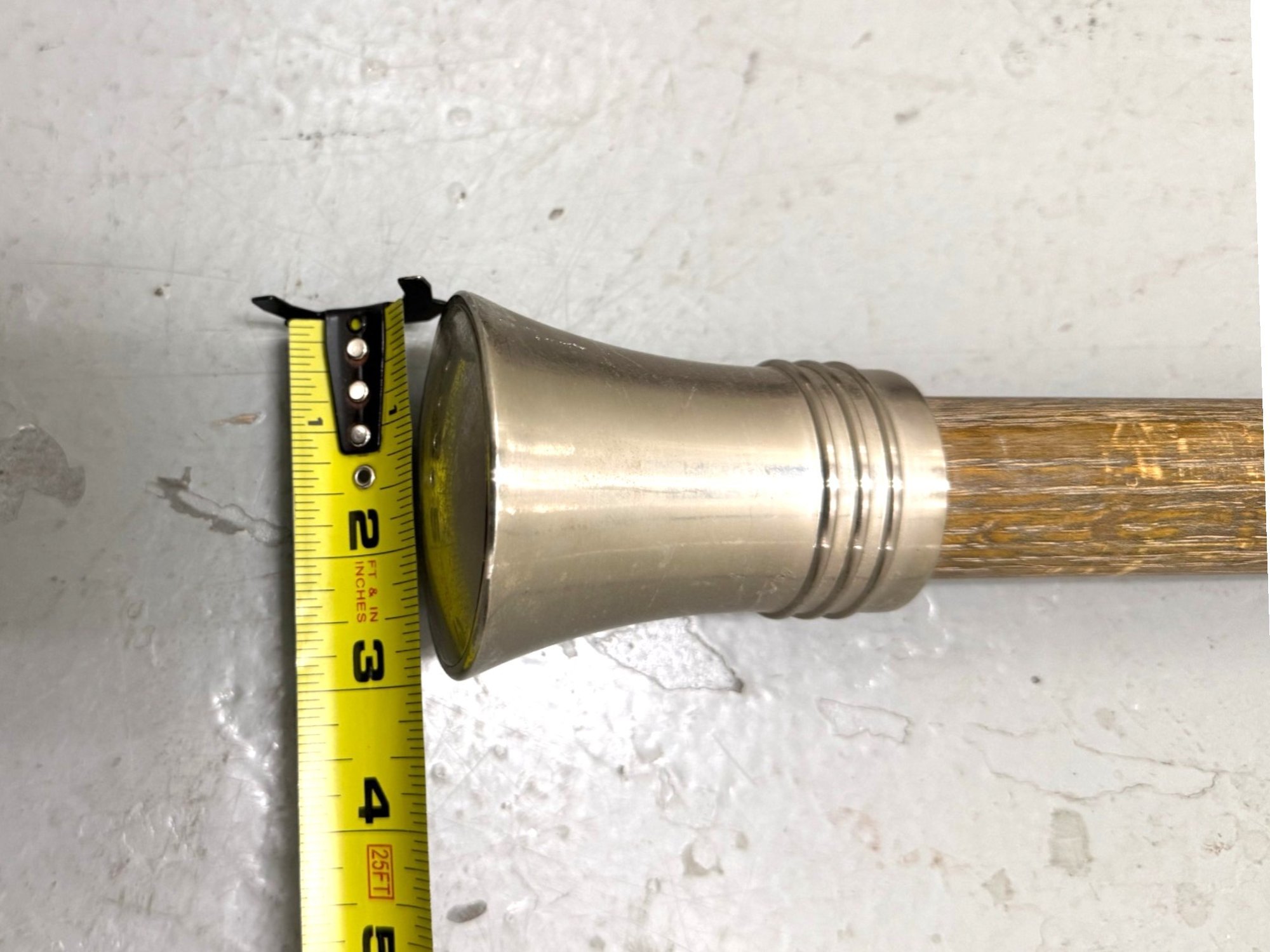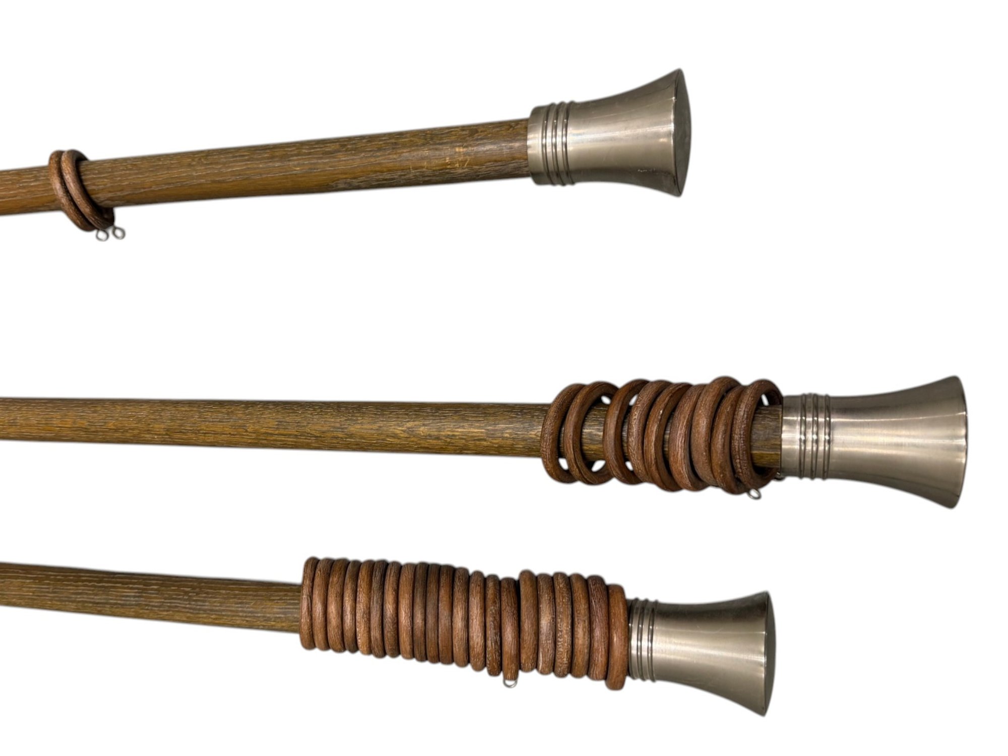 Set of three (3) Thom Filicia adjustable wooden drapery poles/curtain rods with decorative nickel finial ends and wooden rings, with mounting hardware. Purchased at Calico Corners, custom interior design shop.