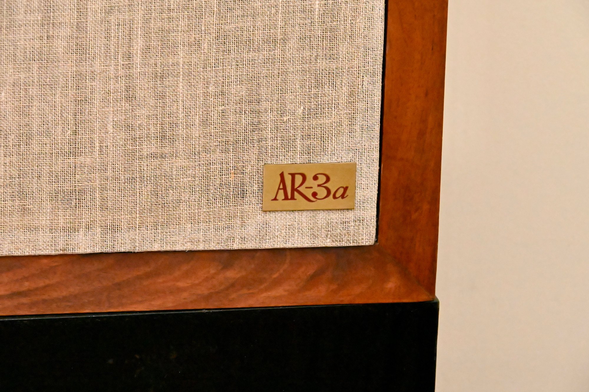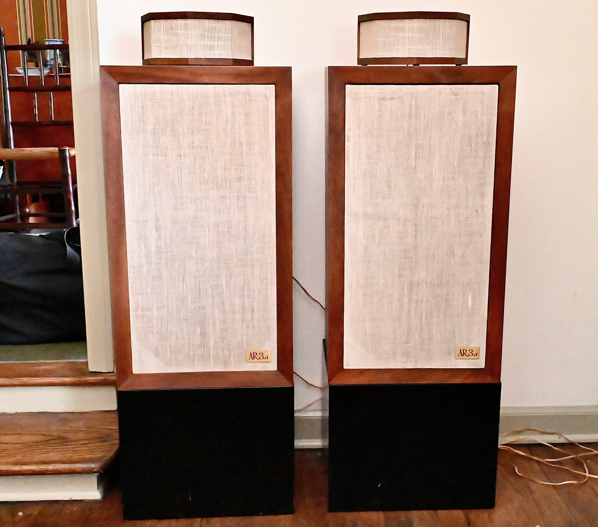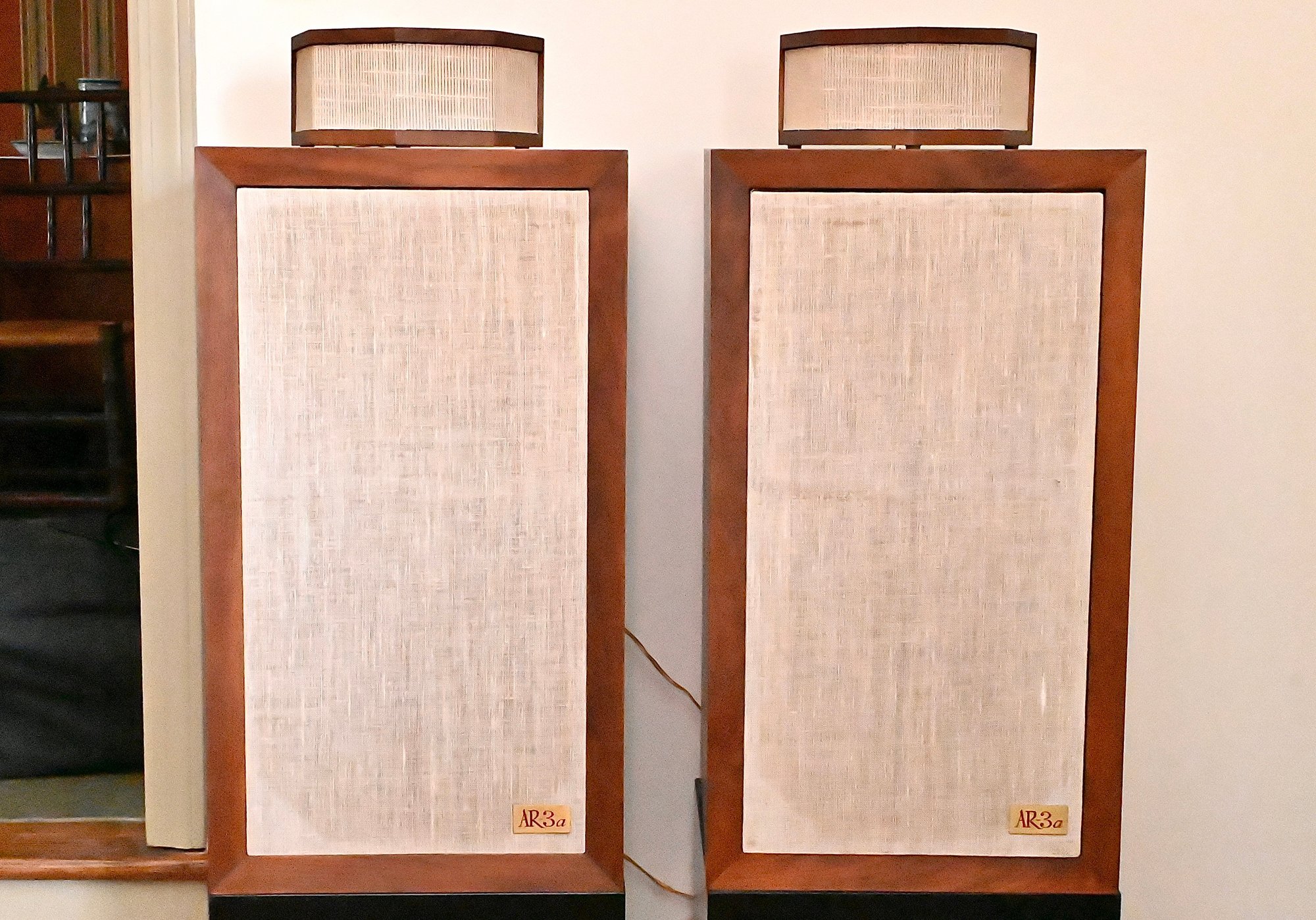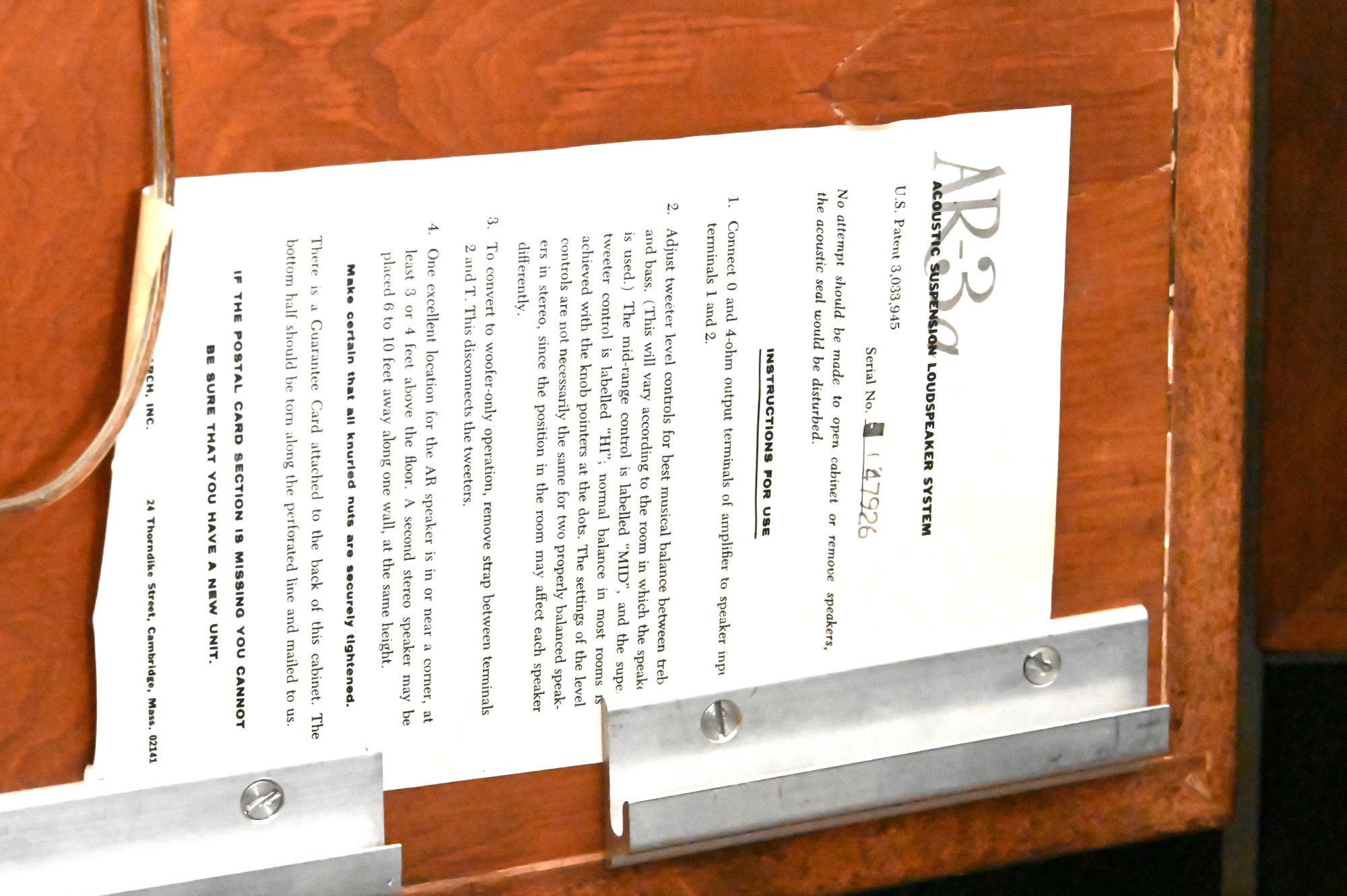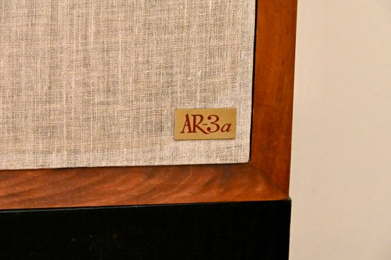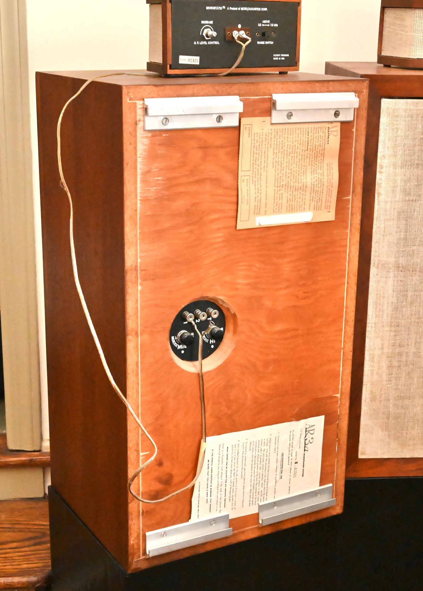 Pair of vintage Acoustic Research AR-3a acoustic suspension speakers housed in walnut veneer cabinets, accompanied by Microstatic high-frequency add-on tweeters by Micro/Acoustics Corp. (USA). The AR-3a is a highly regarded 3-way speaker system known for accurate, full-range sound, and these examples retain original rear labels, controls, and serial numbering. The included Microstatic units feature adjustable high-frequency level control and selectable range