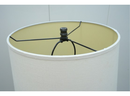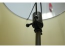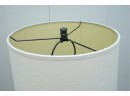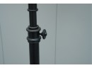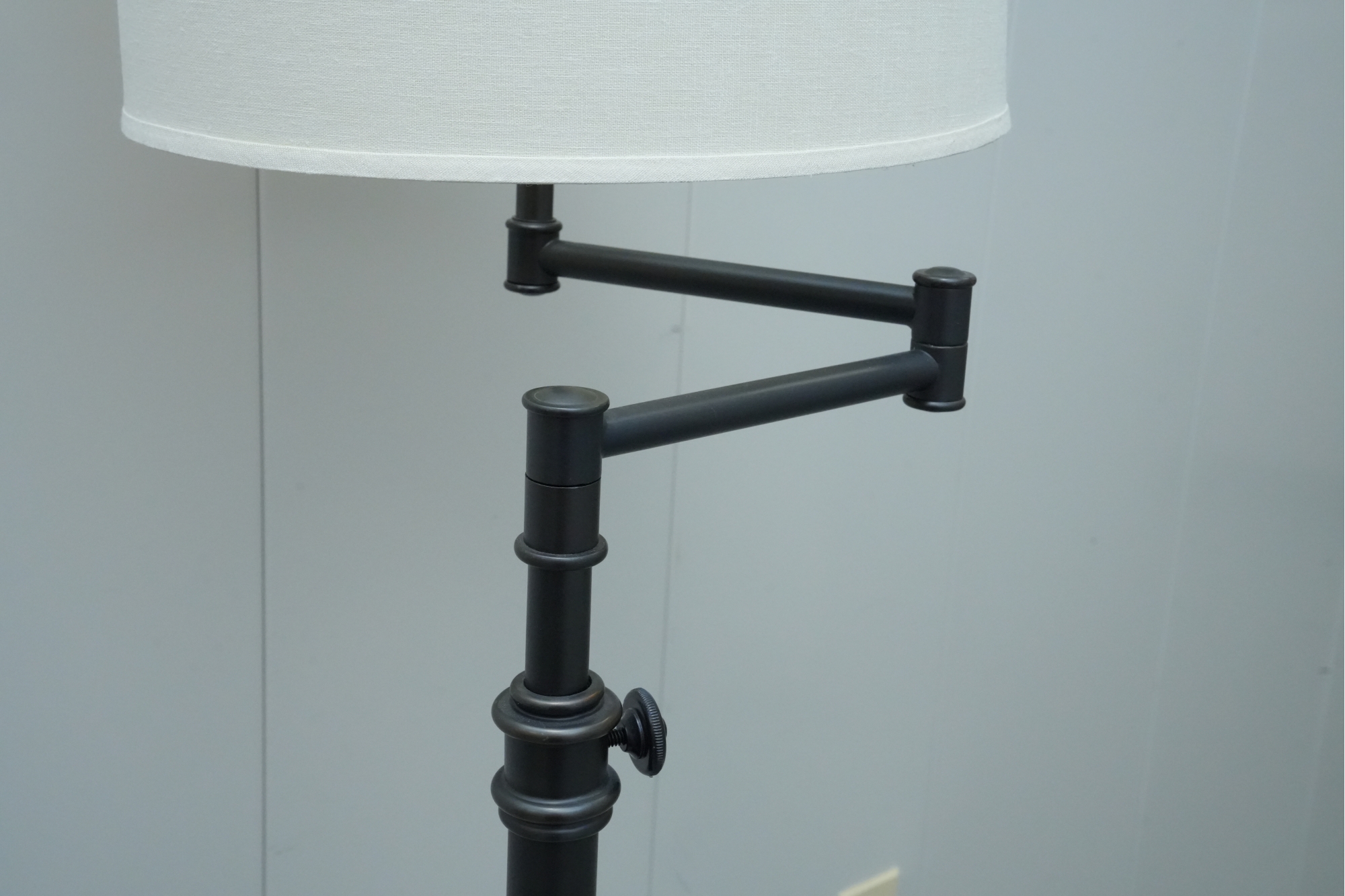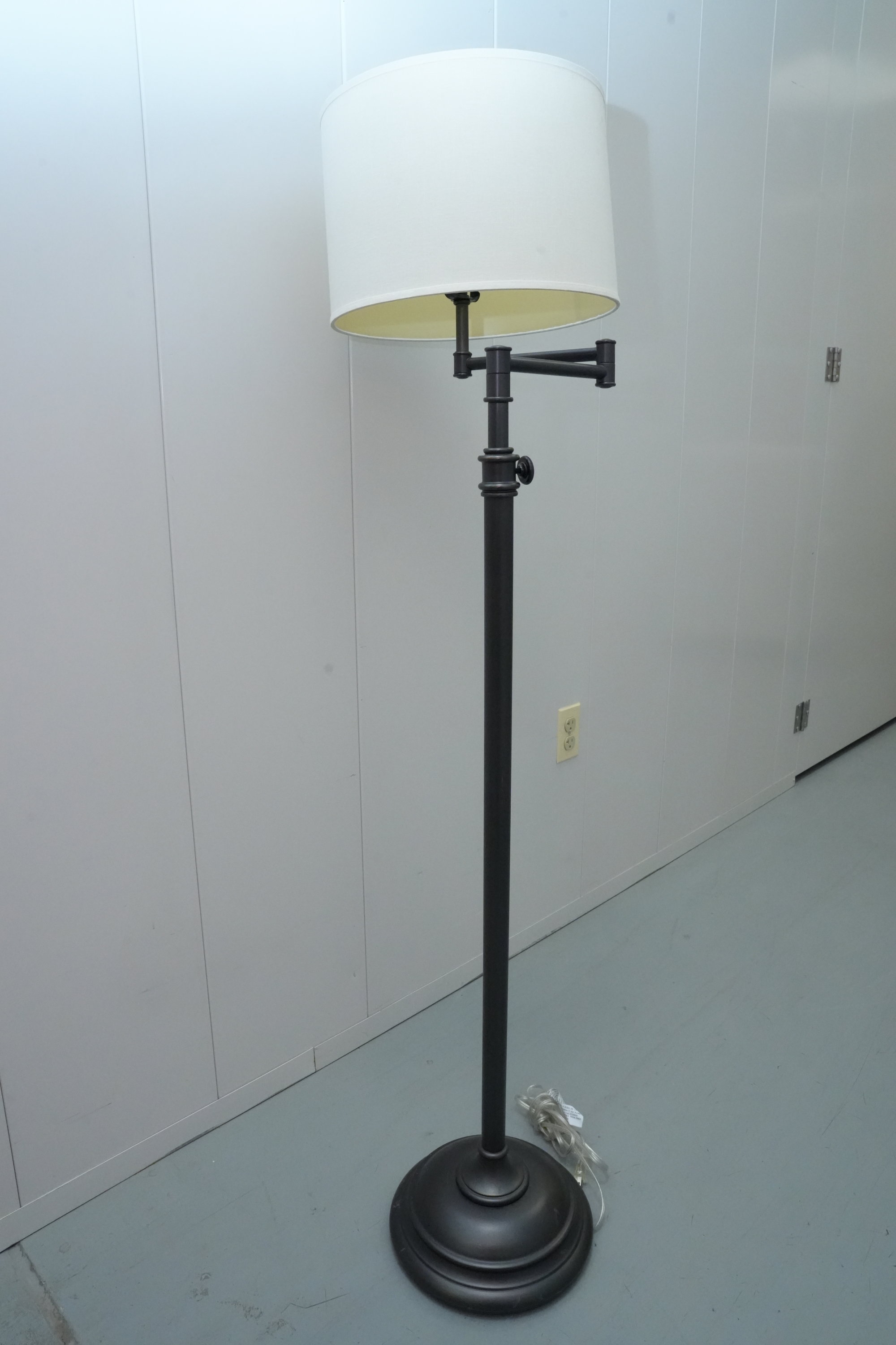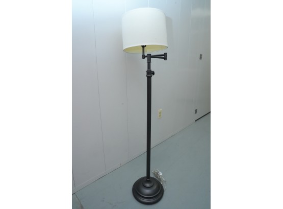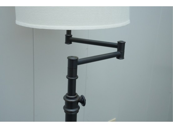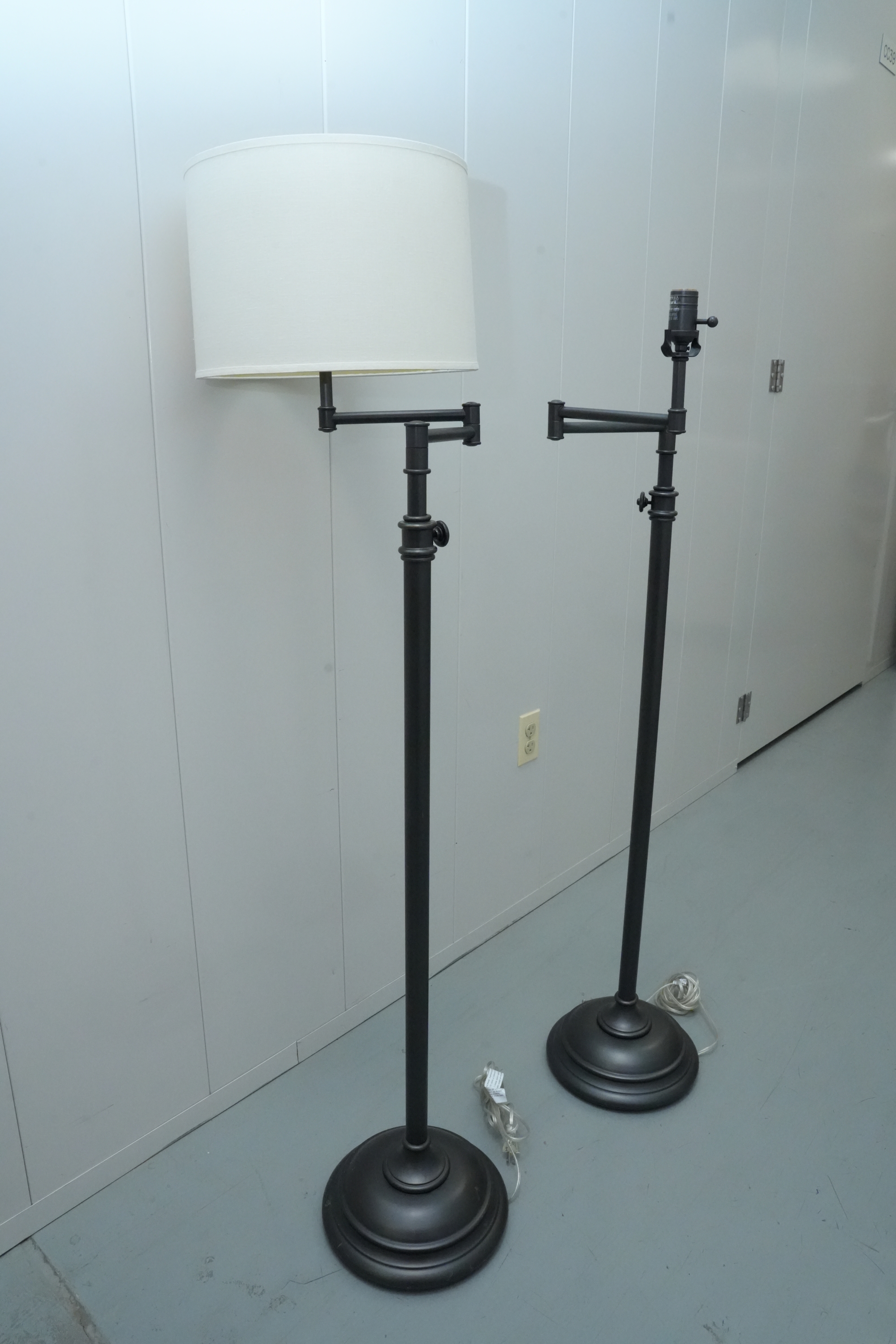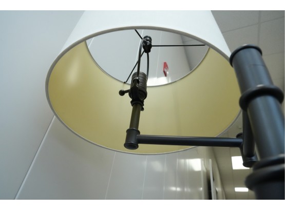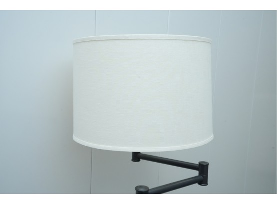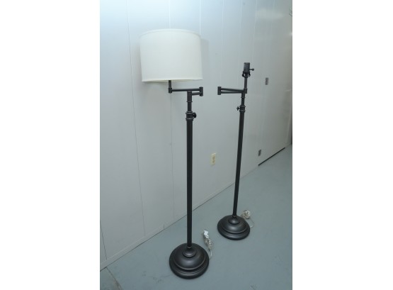 Pair of contemporary style adjustable swing arm floor lamps on round base. One with round white lampshade, the other without a lampshade.