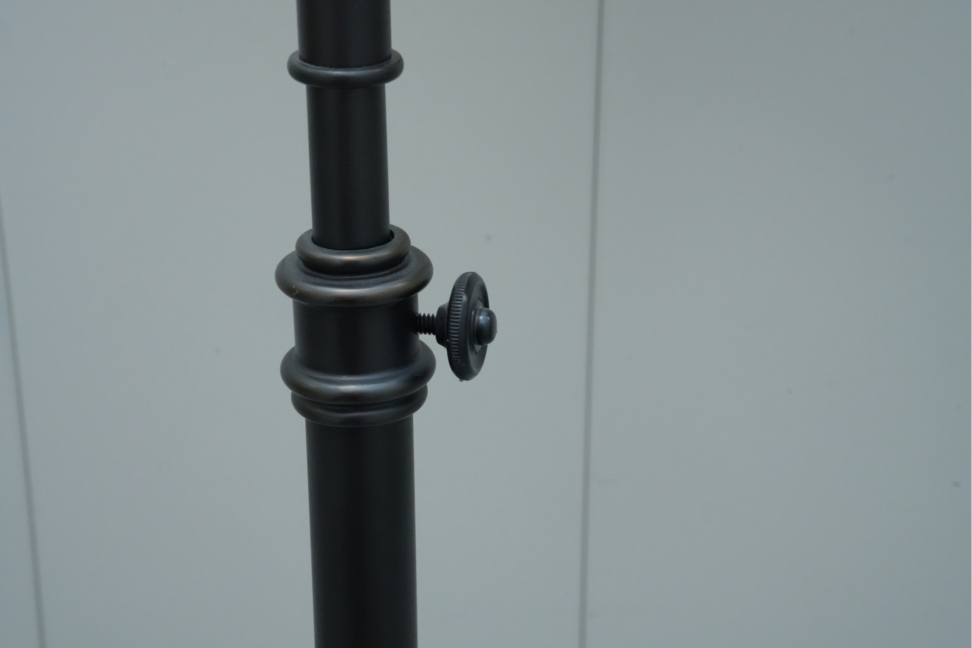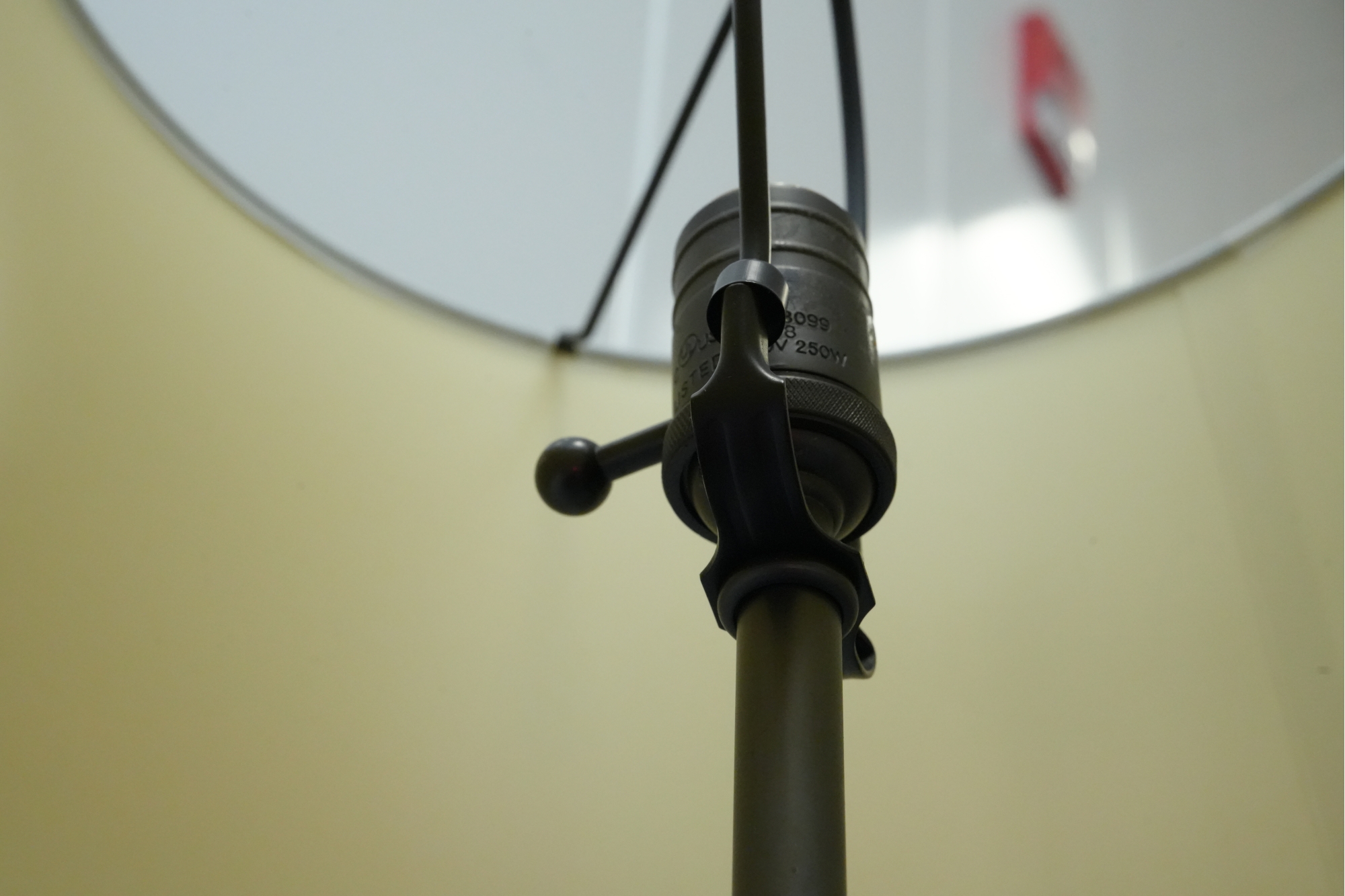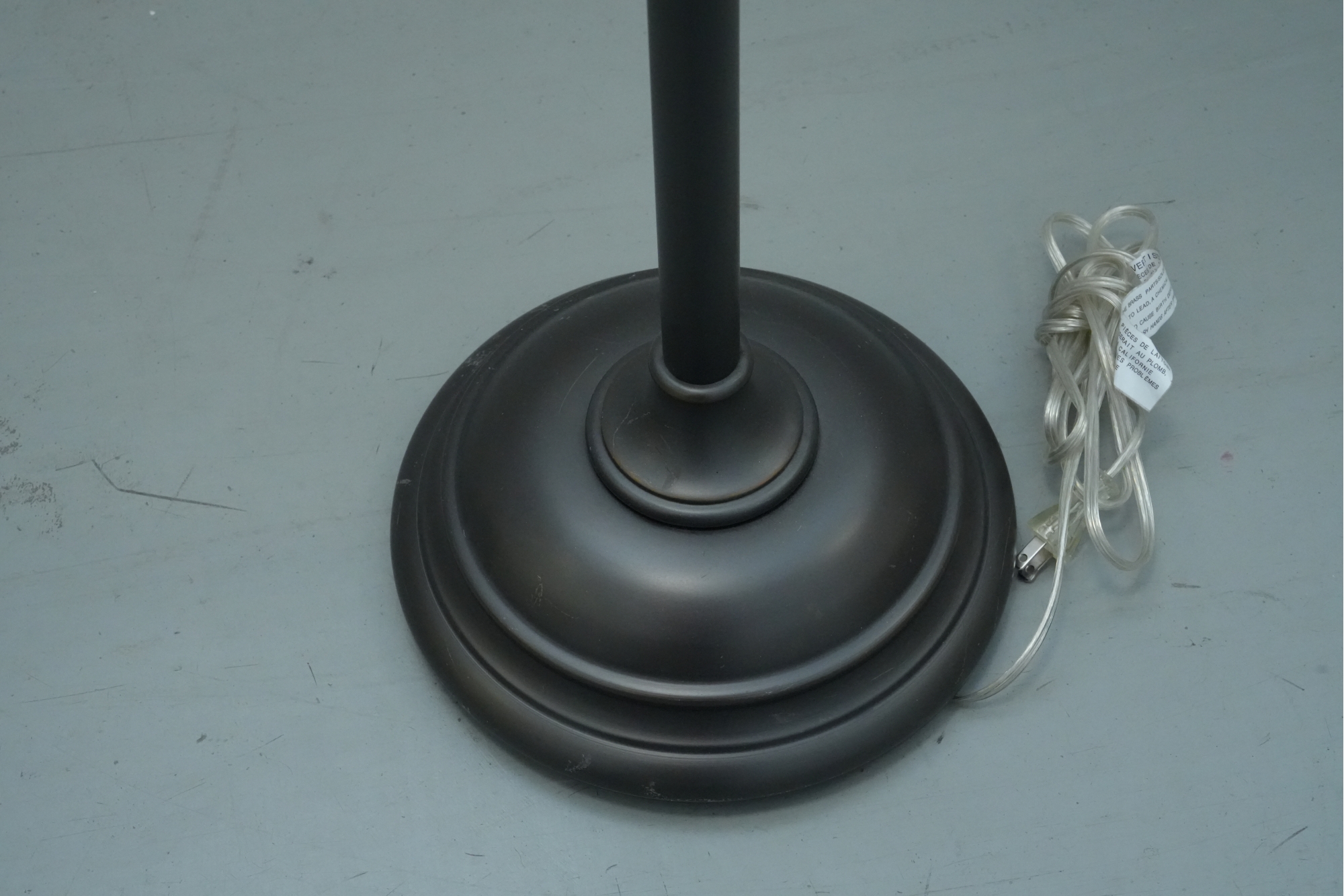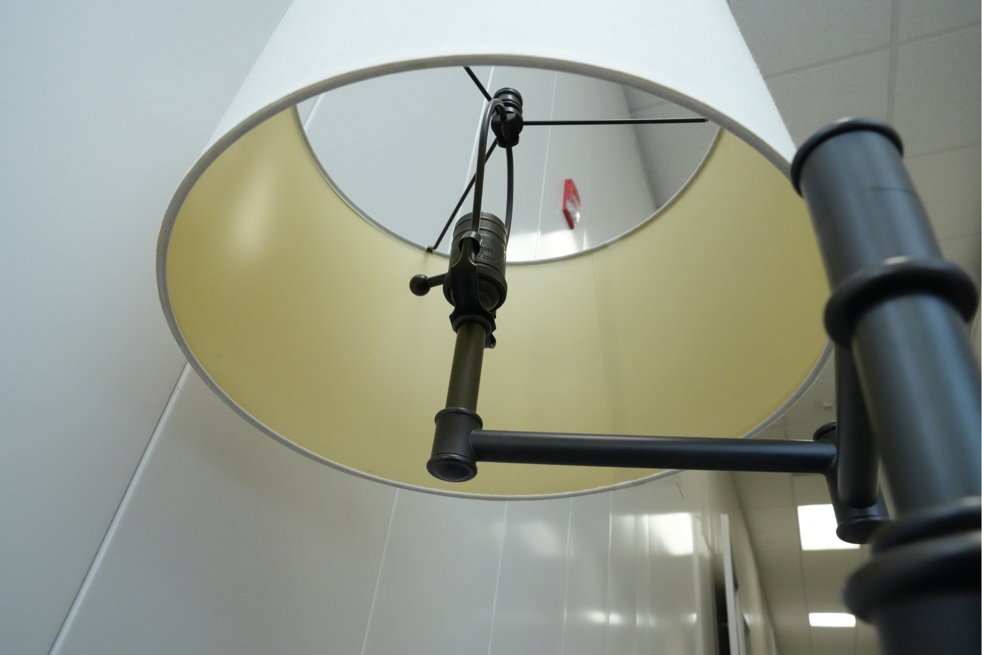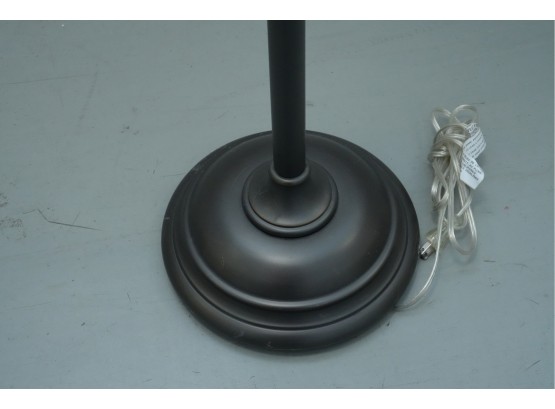 Pair of contemporary style adjustable swing arm floor lamps on round base. One with round white lampshade, the other without a lampshade.