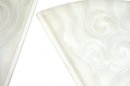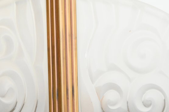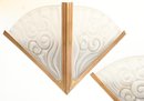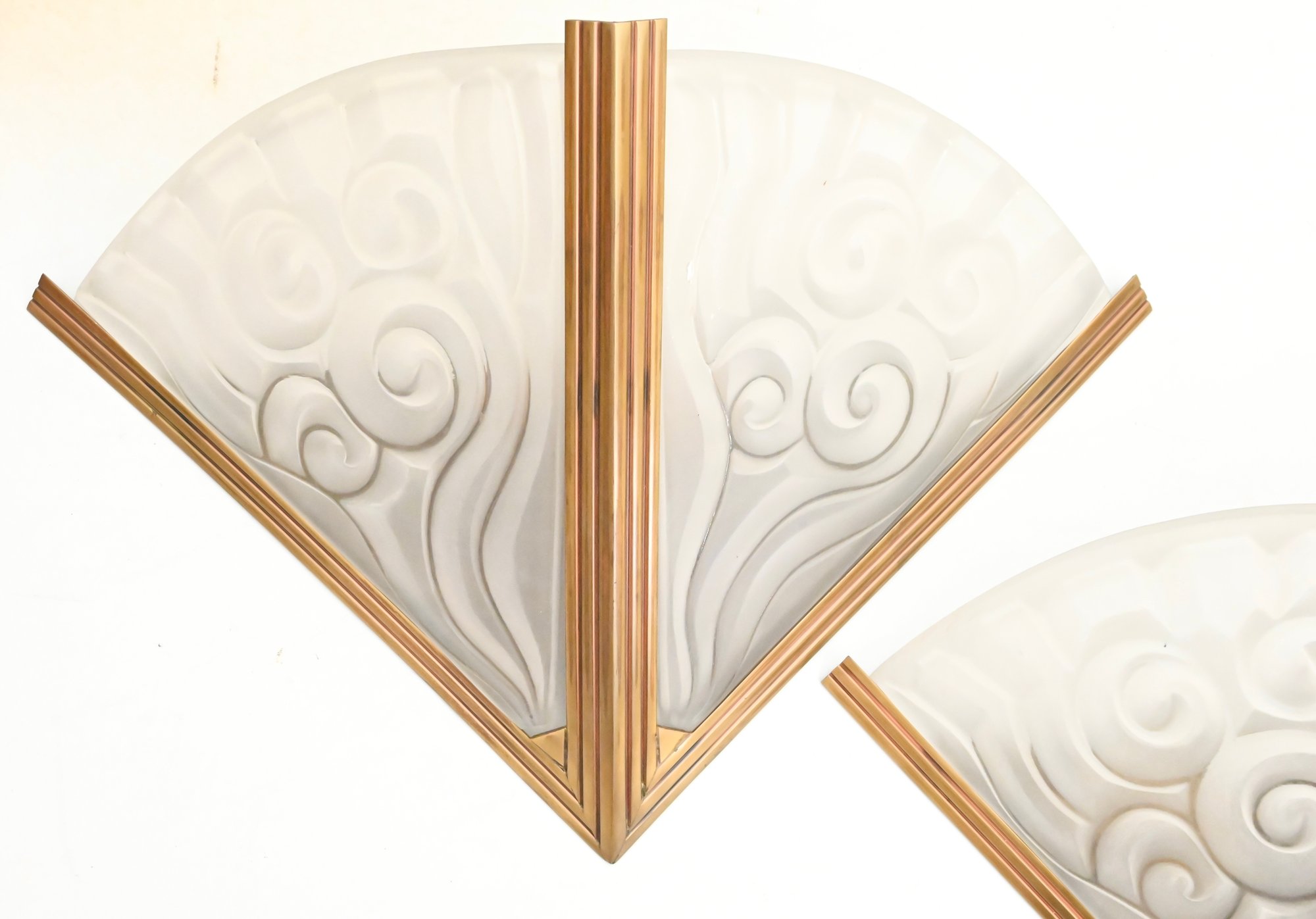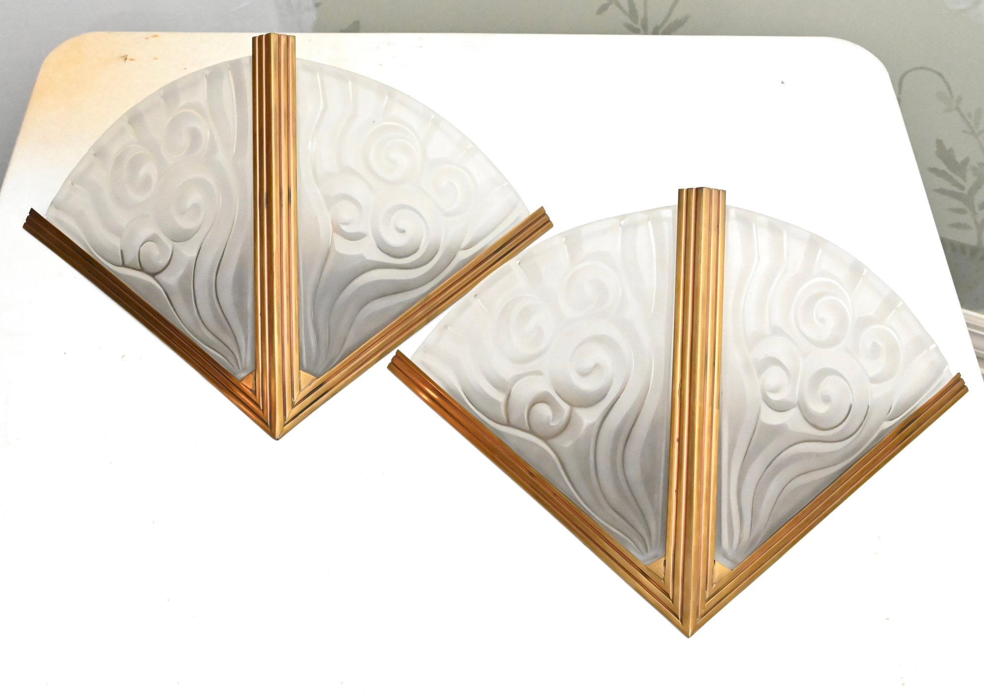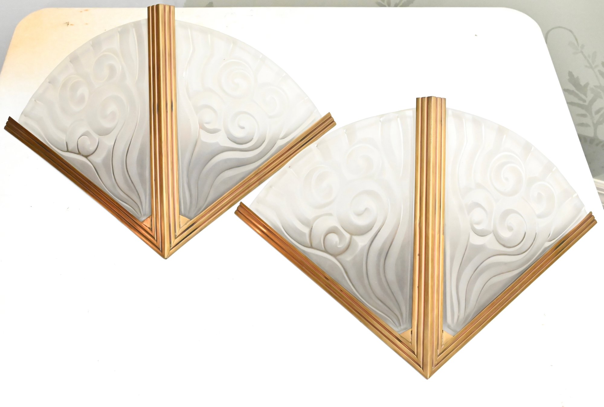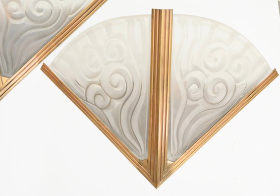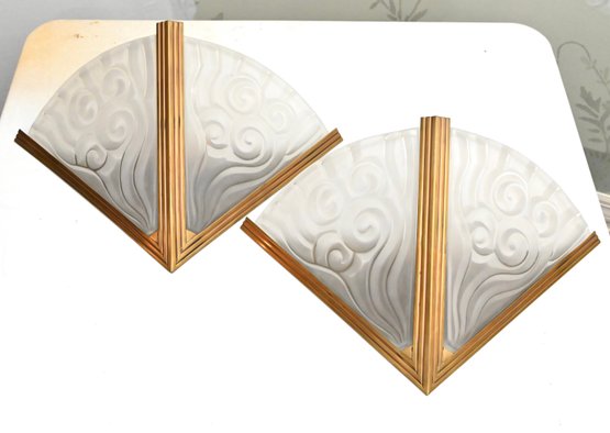 Pair of French Art Deco wall sconces attributed to Degué, each featuring a fan-shaped frosted molded glass shade with stylized scroll and geometric motifs. The shades are mounted in stepped gilt metal frames with linear Art Deco detailing. The glass displays a soft, translucent finish with molded relief decoration characteristic of the period.