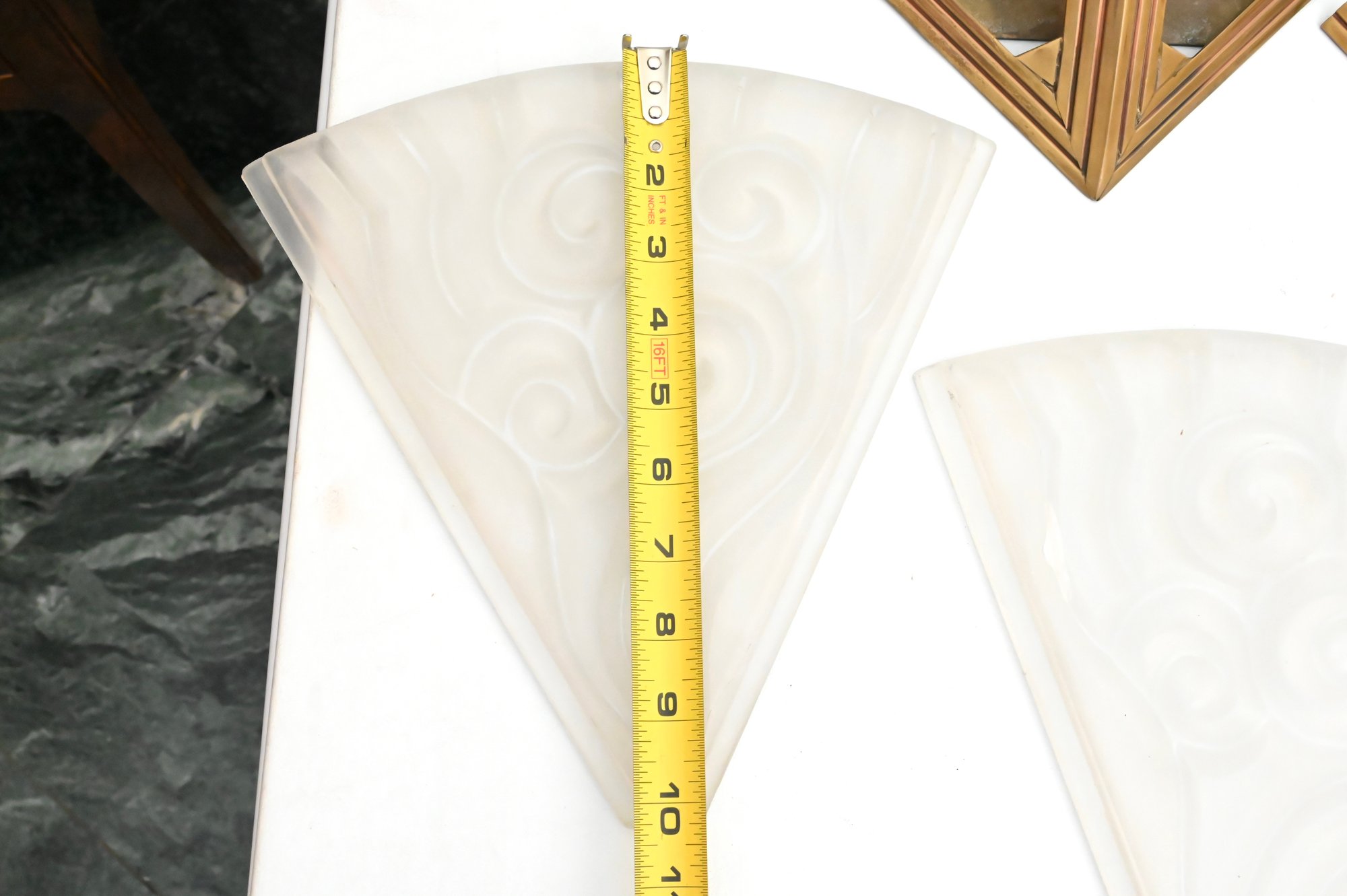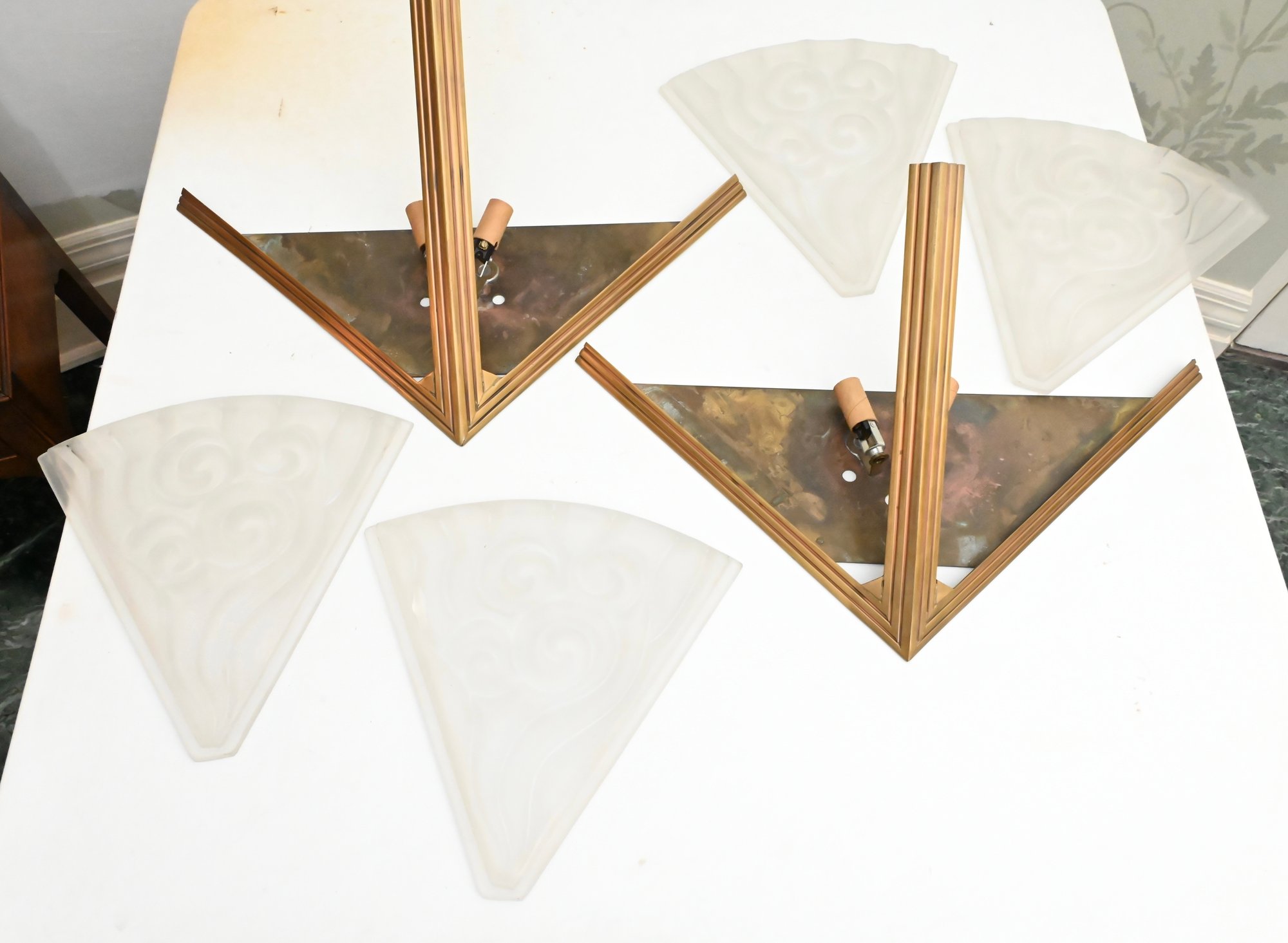 Good condition with minor wear to the metal frames and light surface marks consistent with age. Glass shades appear intact with no visible cracks or major damage.