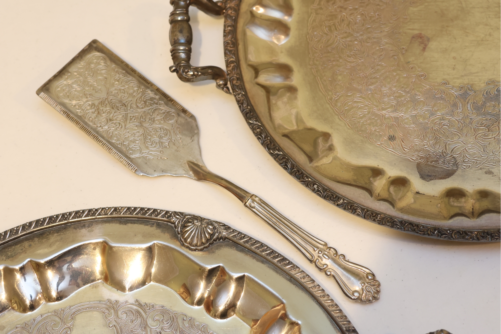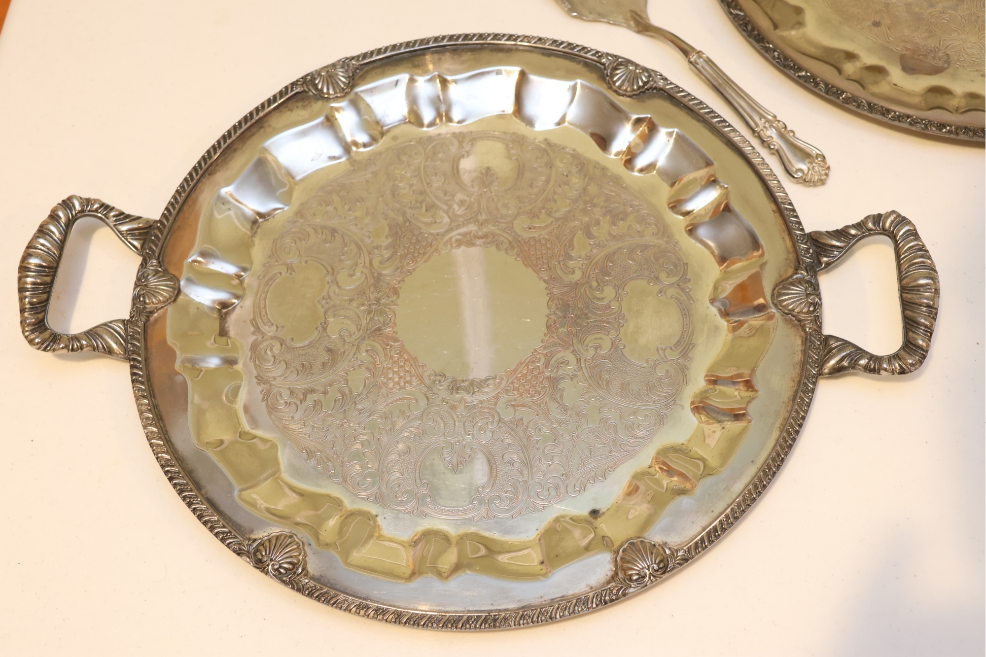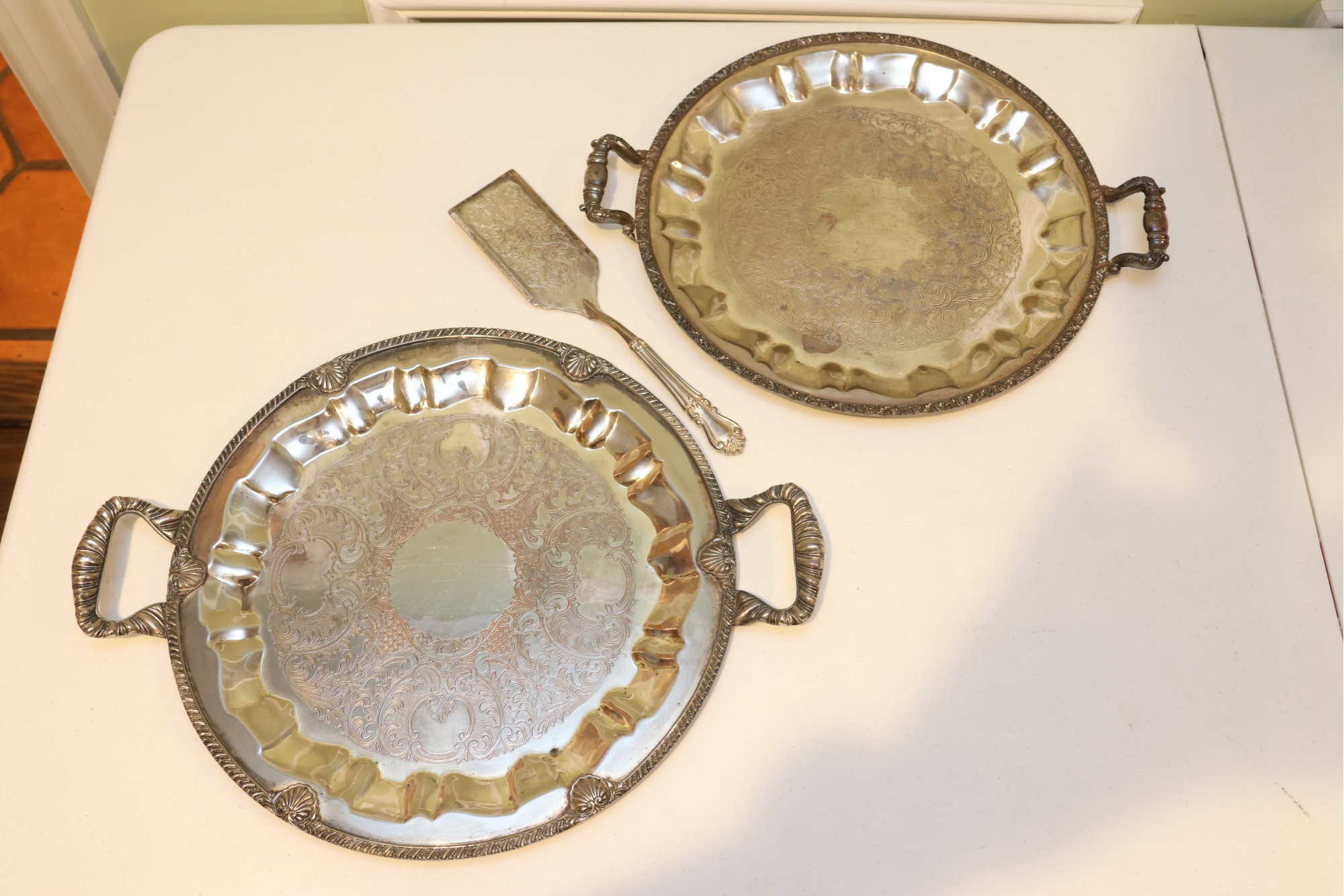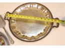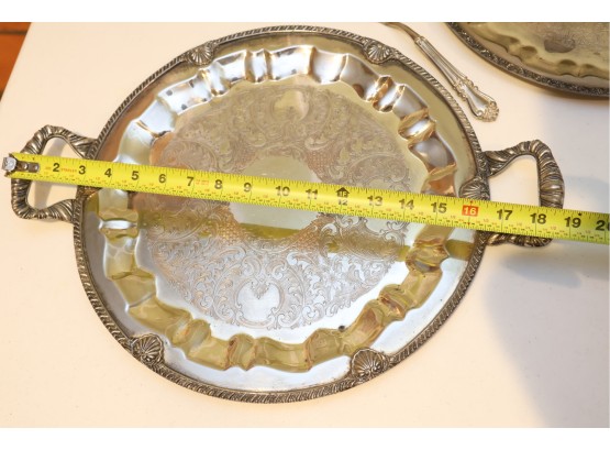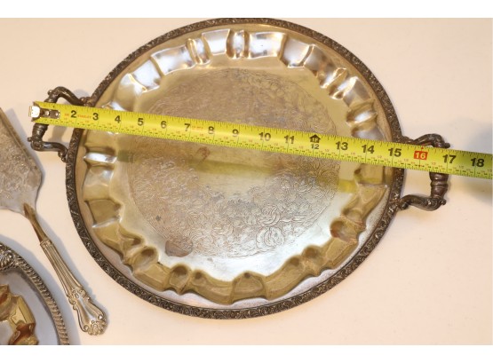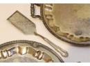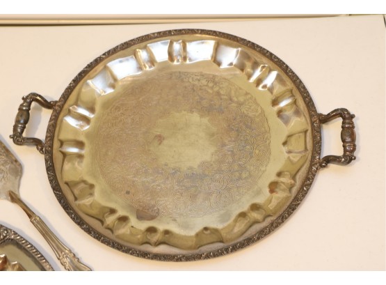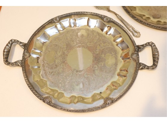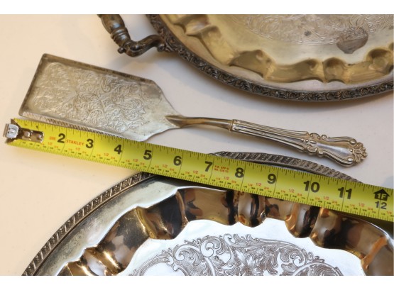 Pair Of Ornate Silver-Tone Serving Trays With Pie Server