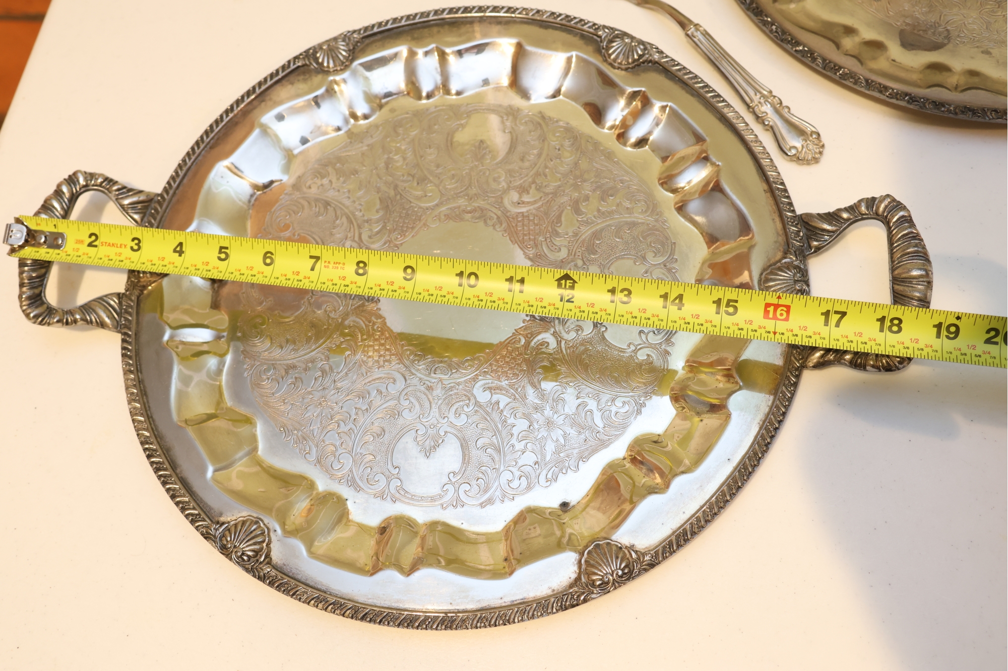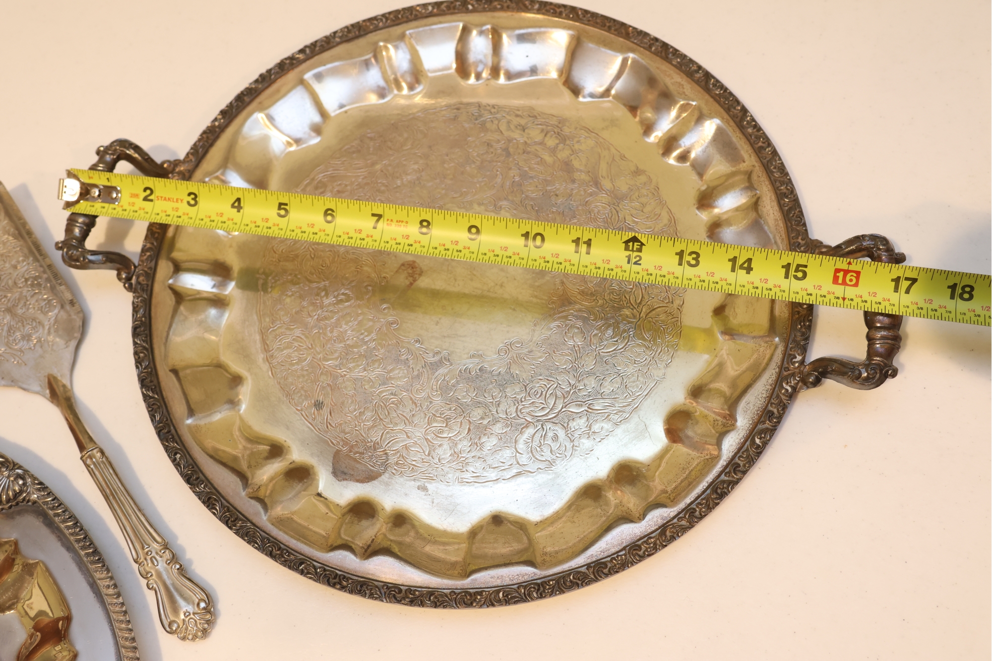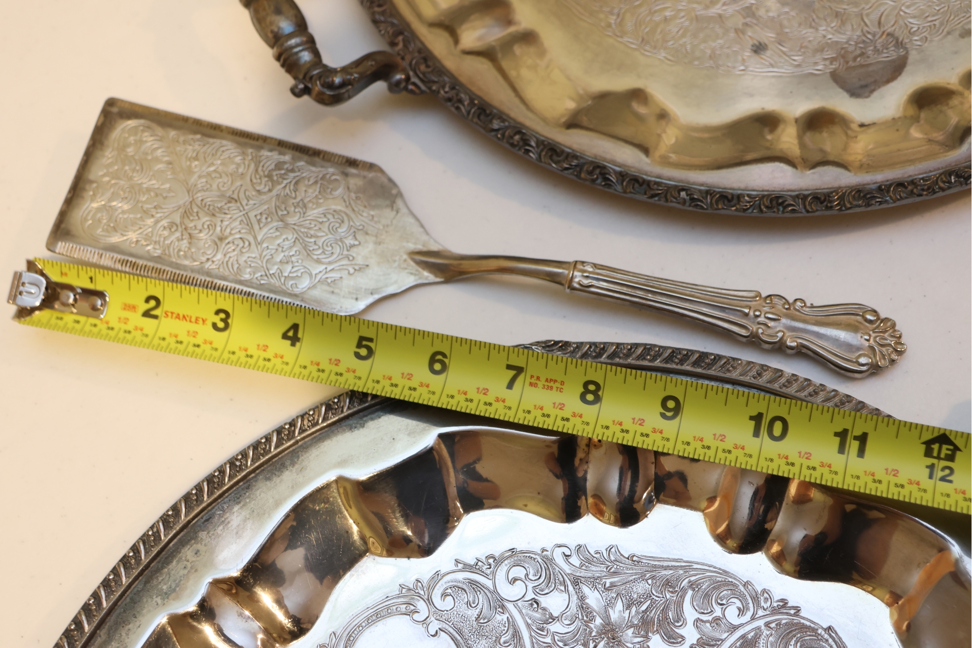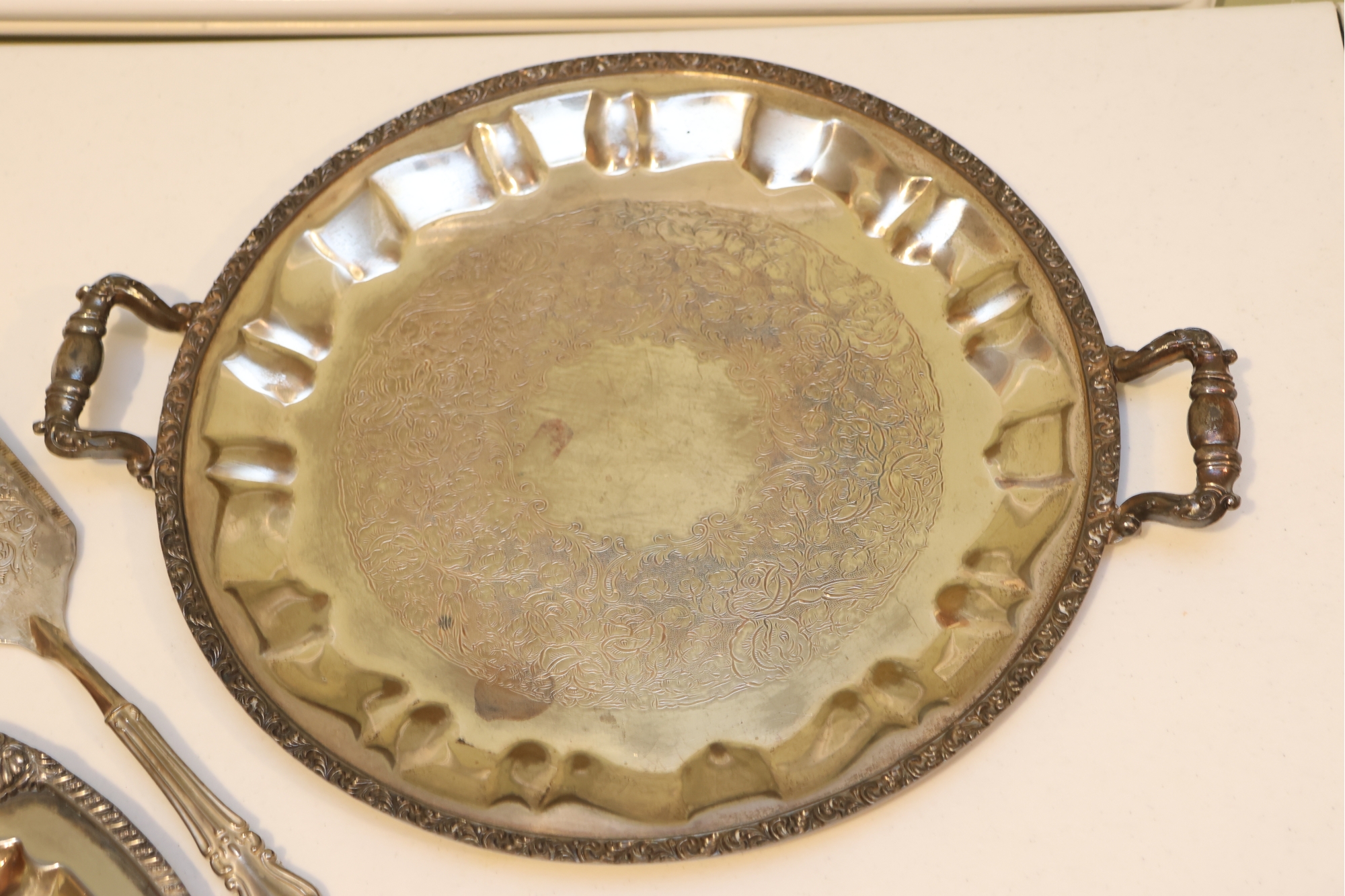 Pair Of Ornate Silver-Tone Serving Trays With Pie Server