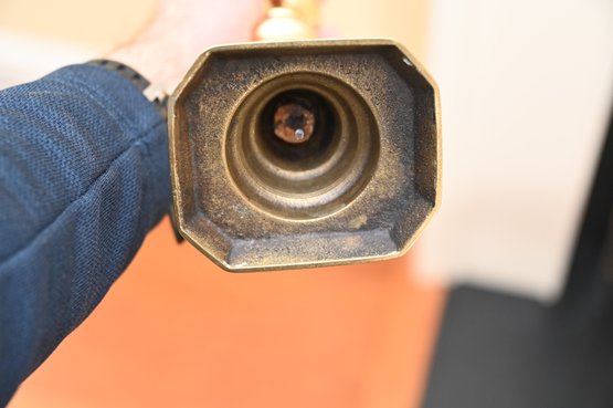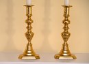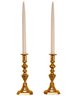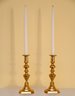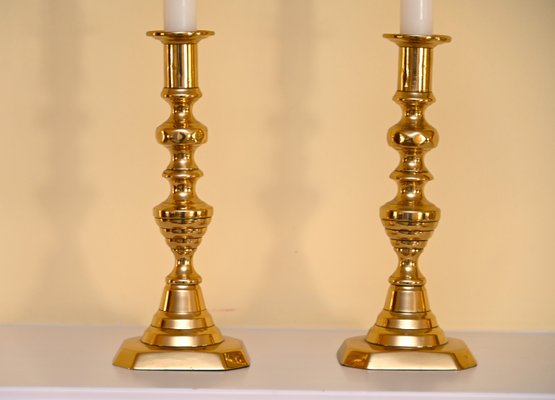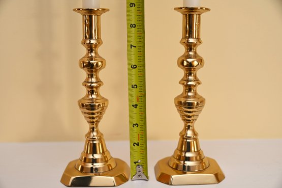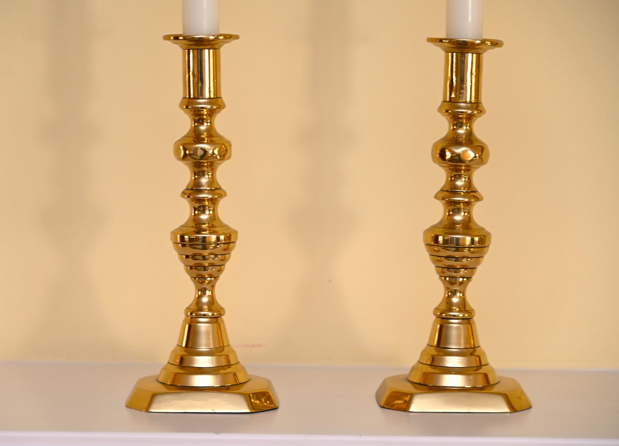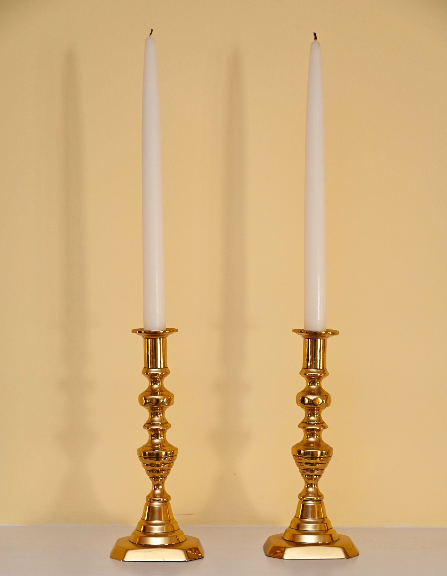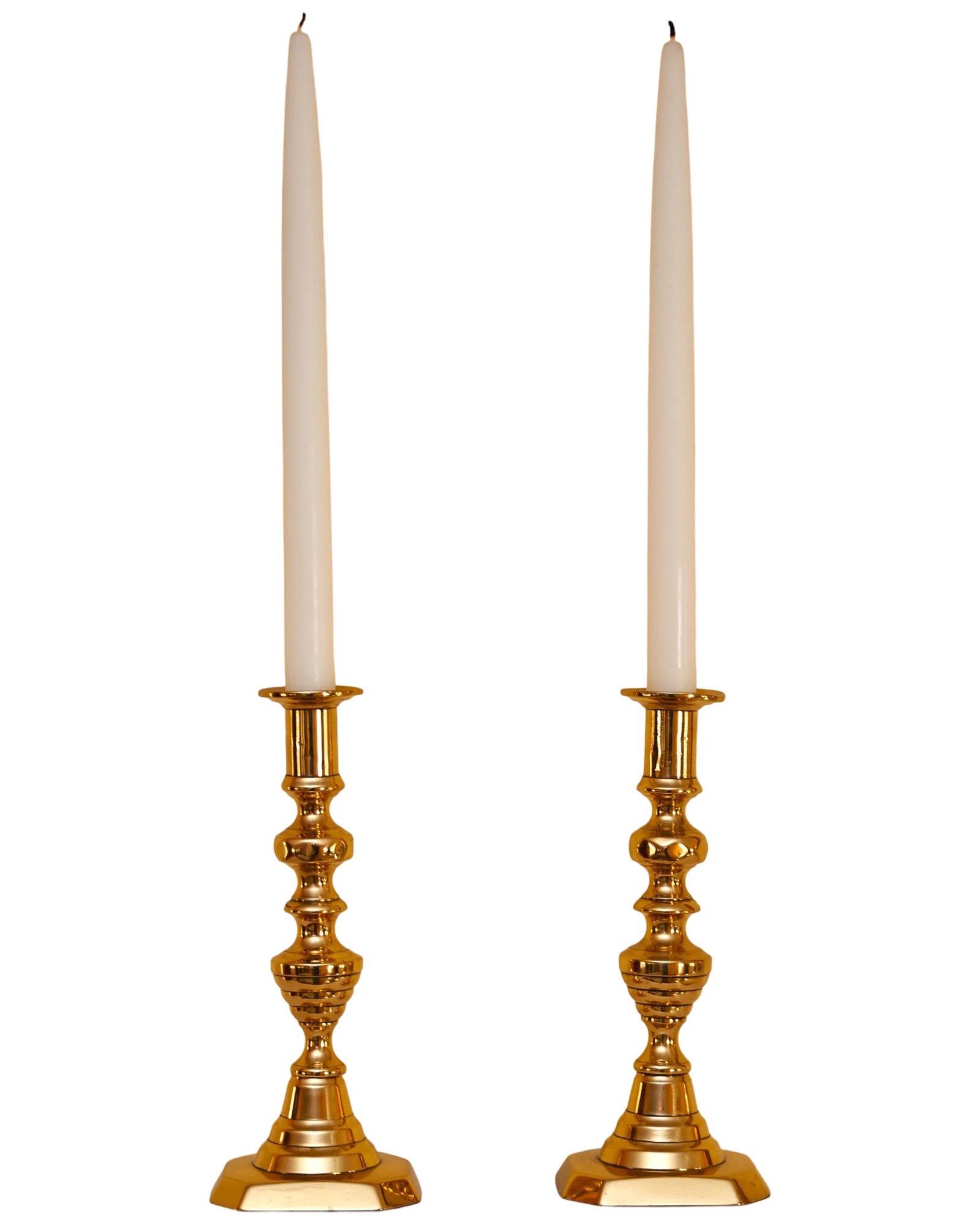 This is a pair of polished brass candlesticks with elegant white taper candles. The candlesticks feature a traditional, ornate design with a series of rounded and fluted details along the column, leading to a sturdy, stepped base with a slightly hexagonal shape. The brass finish is reflective and gives off a warm, golden hue that enhances their classic appeal.