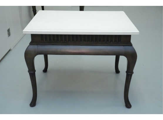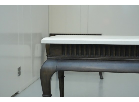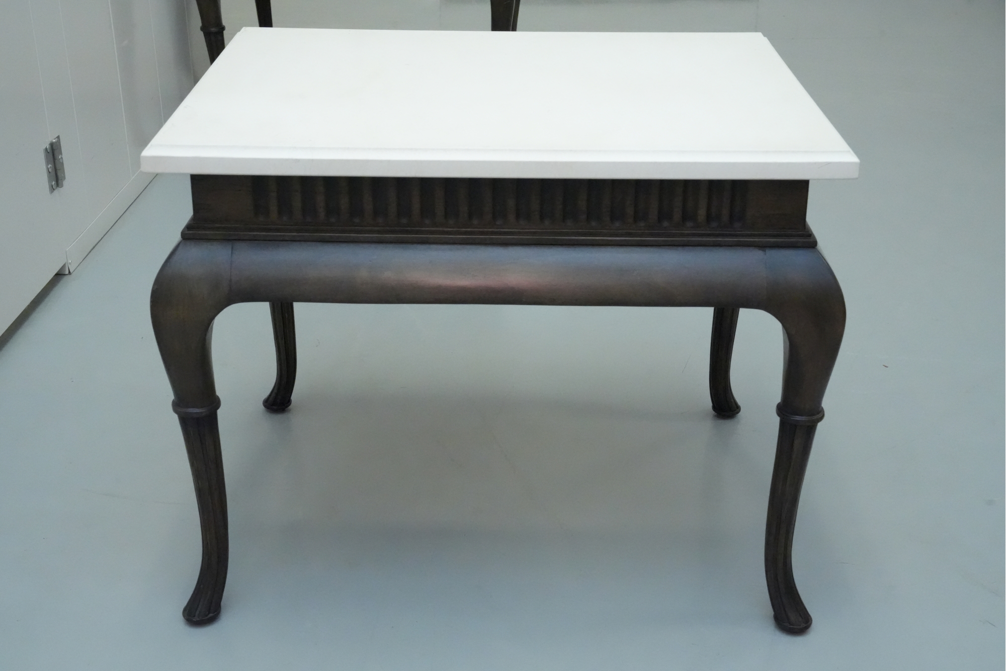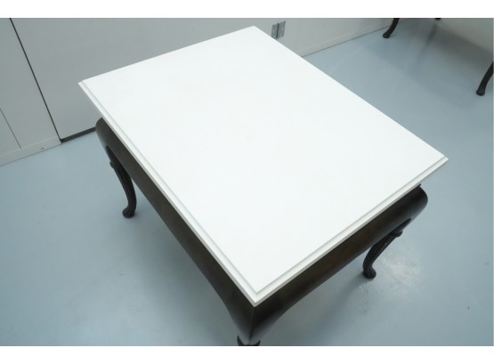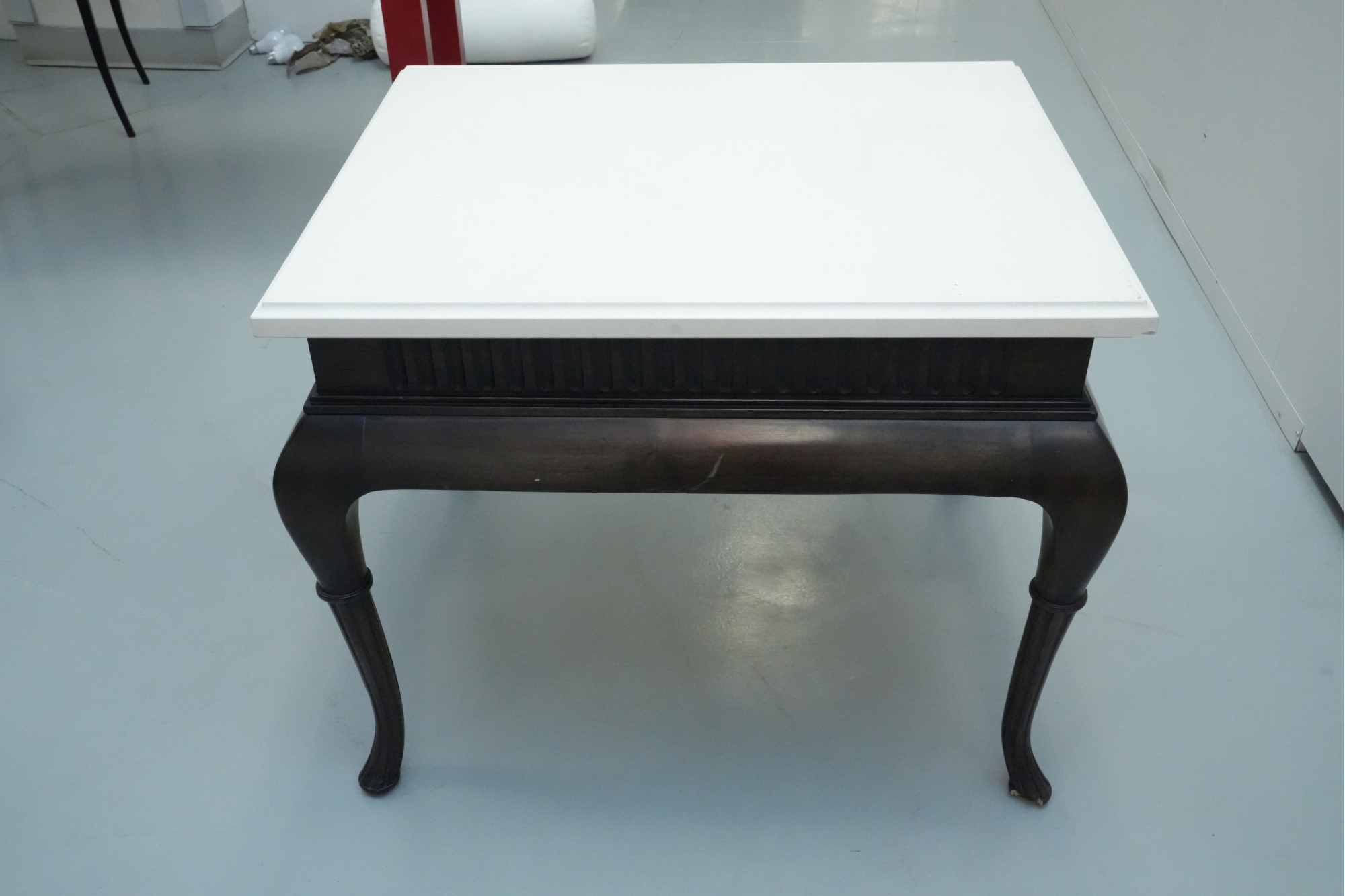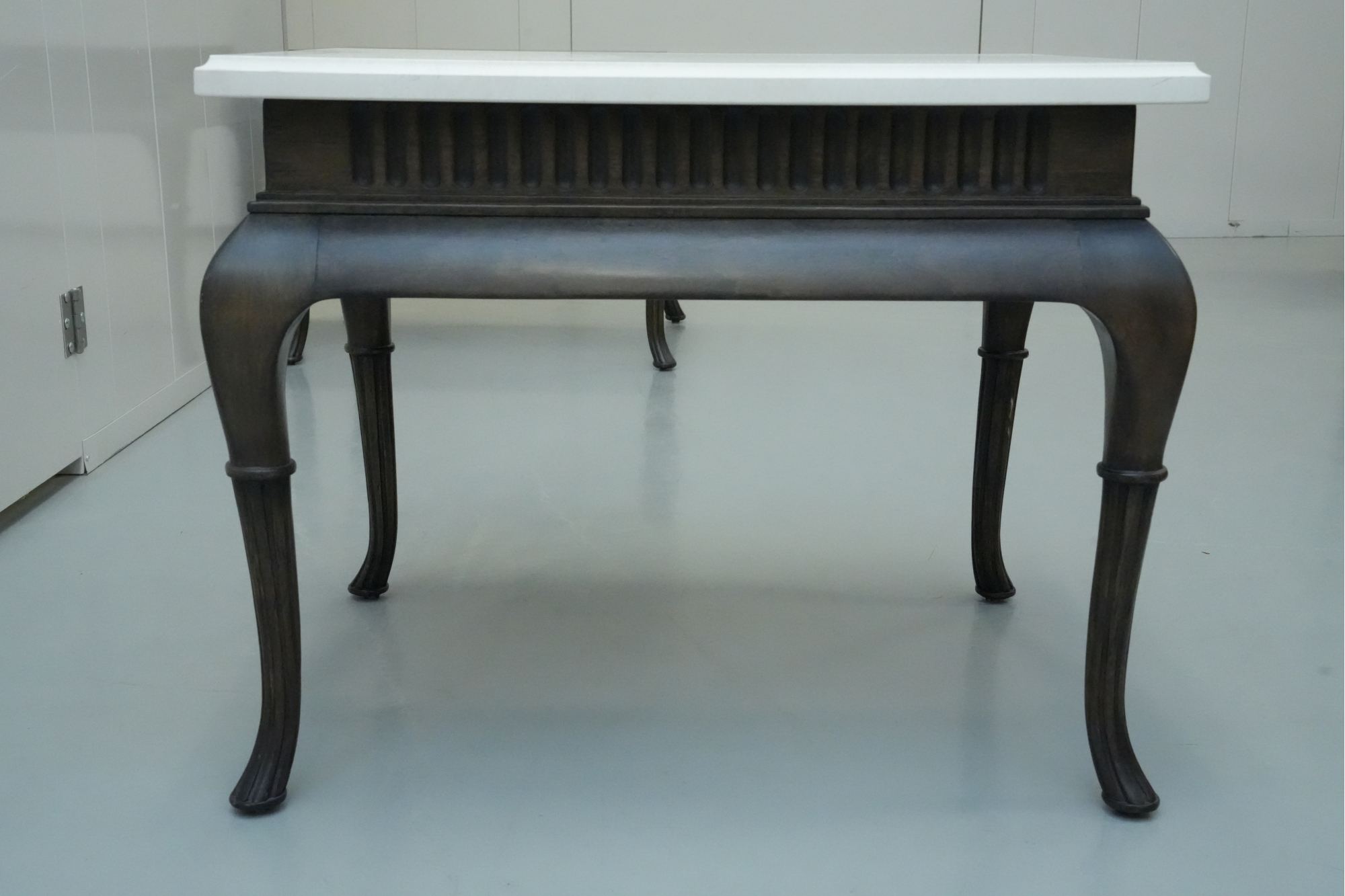 Queen Anne-style dark wood coffee table with cabriole legs, fluted apron details and a heavy top. Heavy white marble-like top.