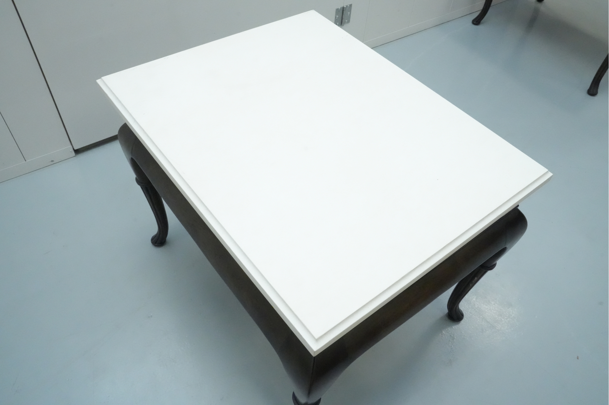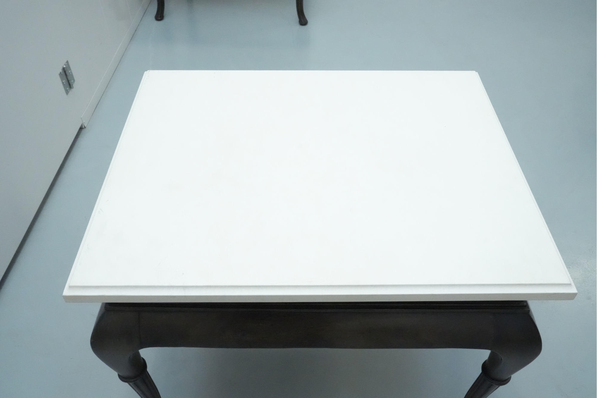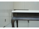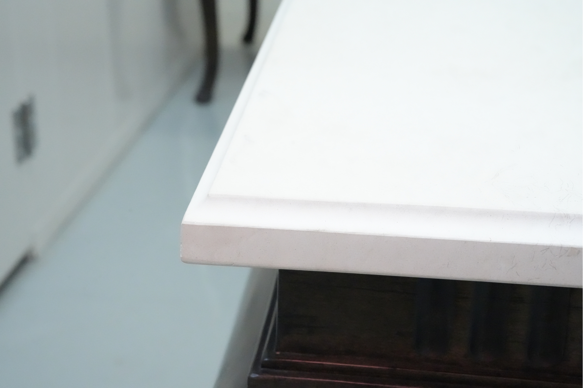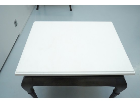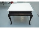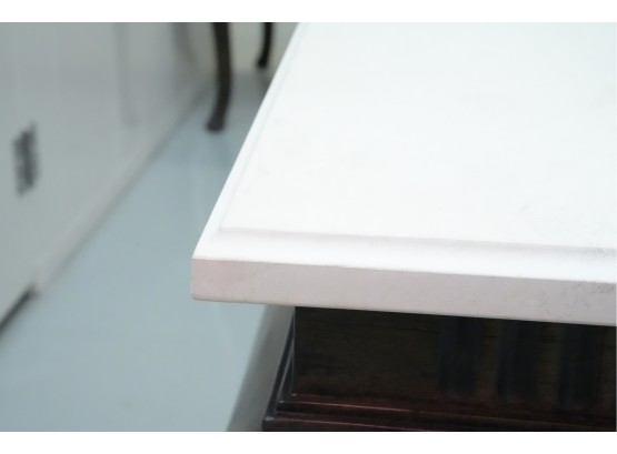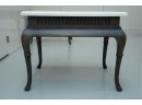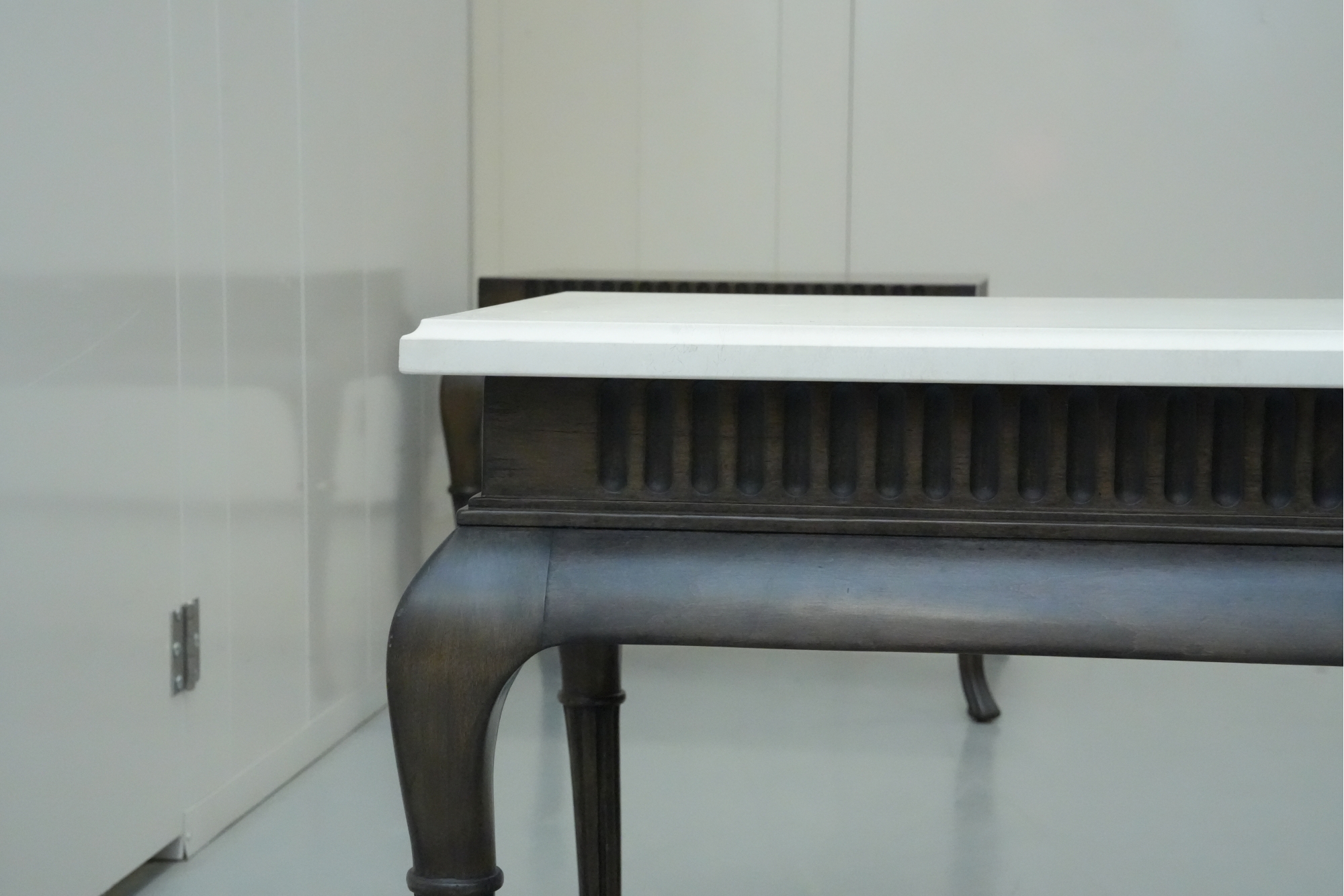 Queen Anne-style dark wood coffee table with cabriole legs, fluted apron details and a heavy top. Heavy white marble-like top.