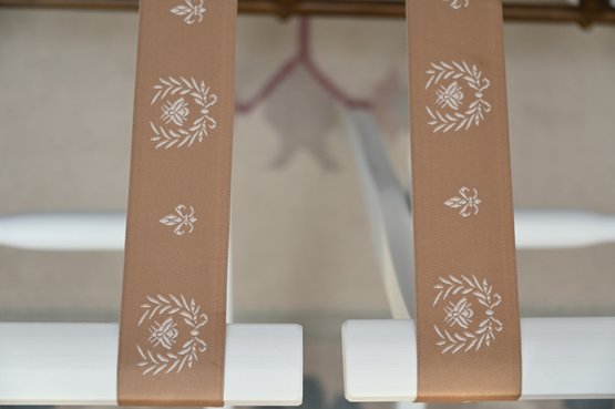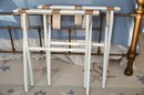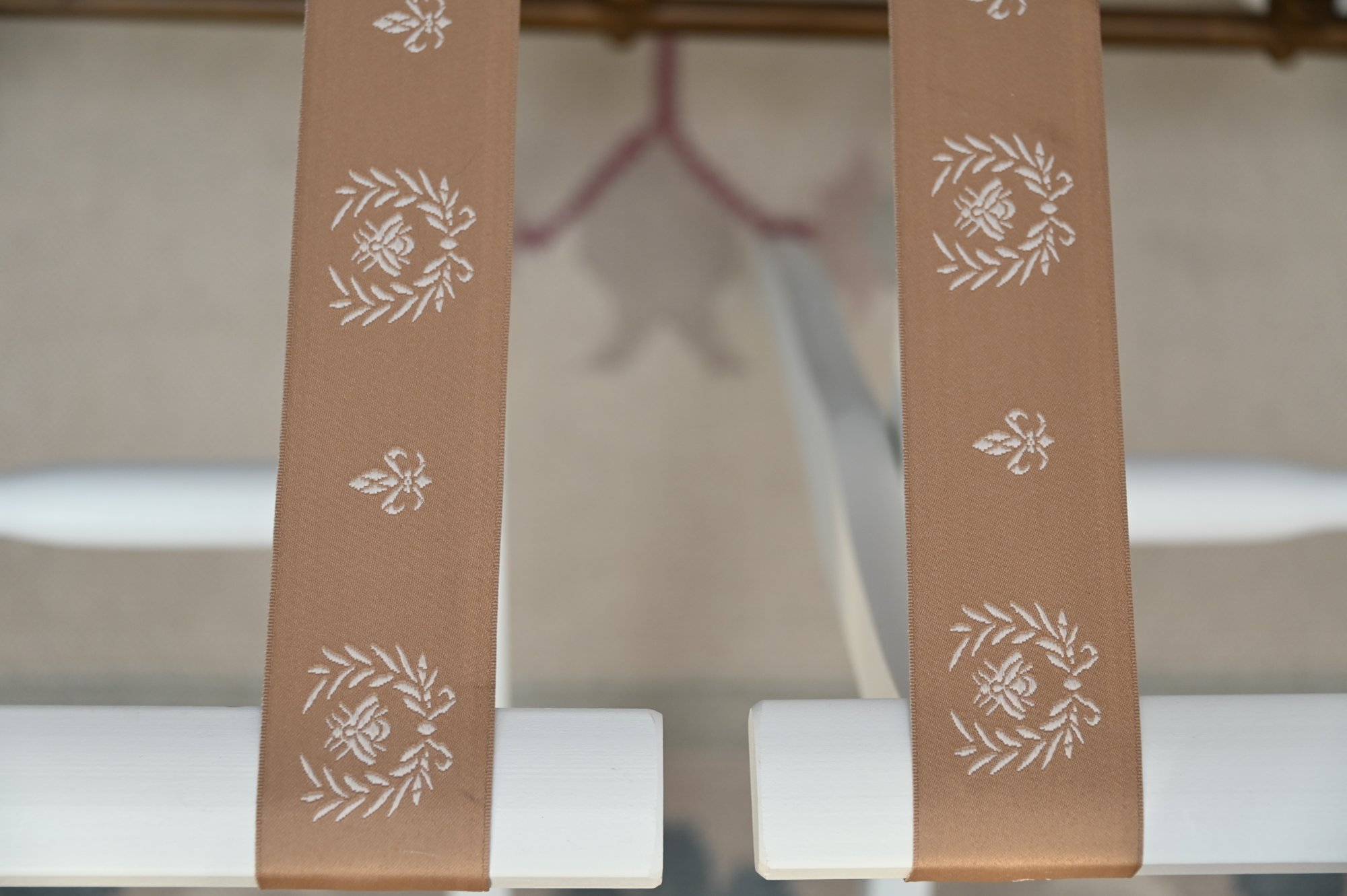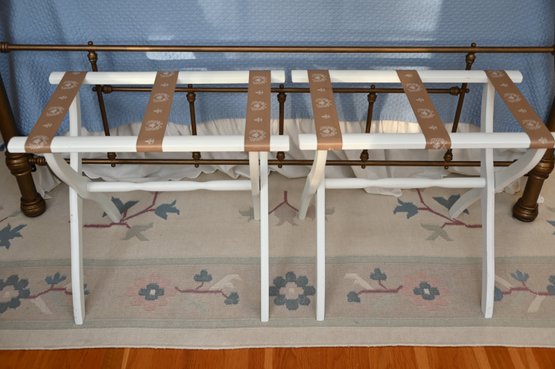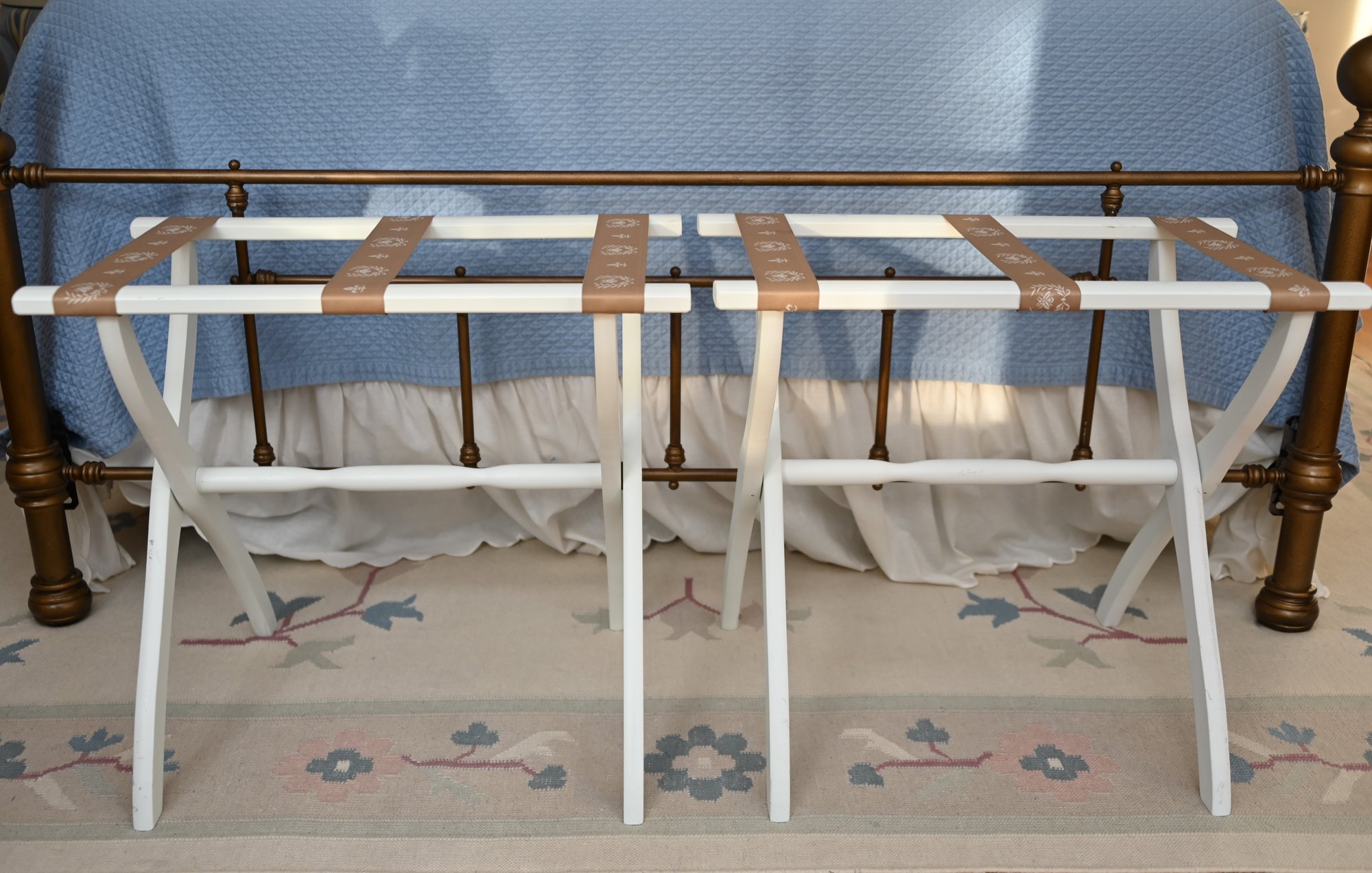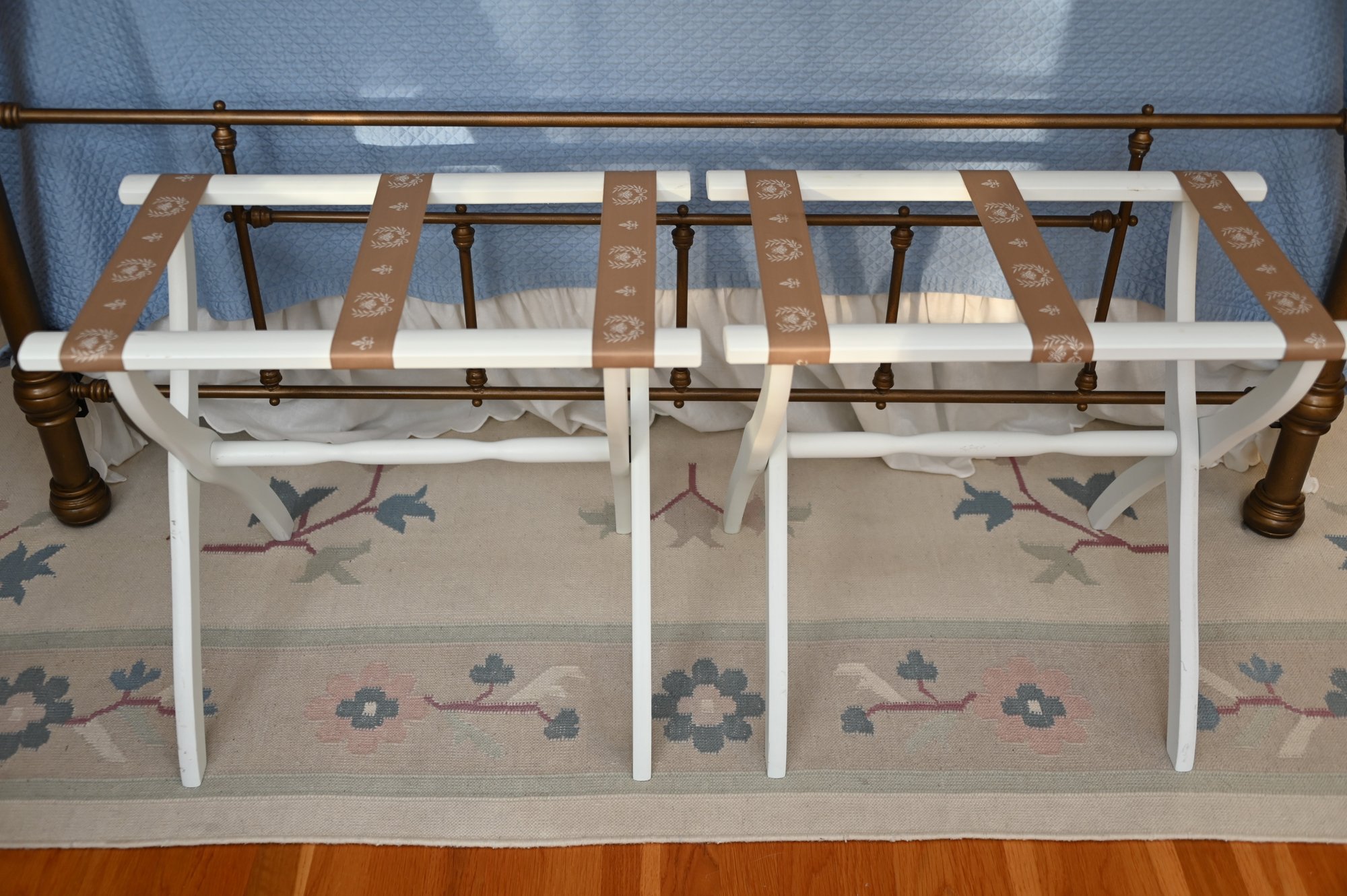 This image features a pair of white wooden luggage racks with brown decorative straps, placed at the foot of a brass bed. The racks have a classic folding design, allowing for easy storage when not in use. The brown straps are adorned with an elegant white floral motif, adding a touch of charm to their functionality.