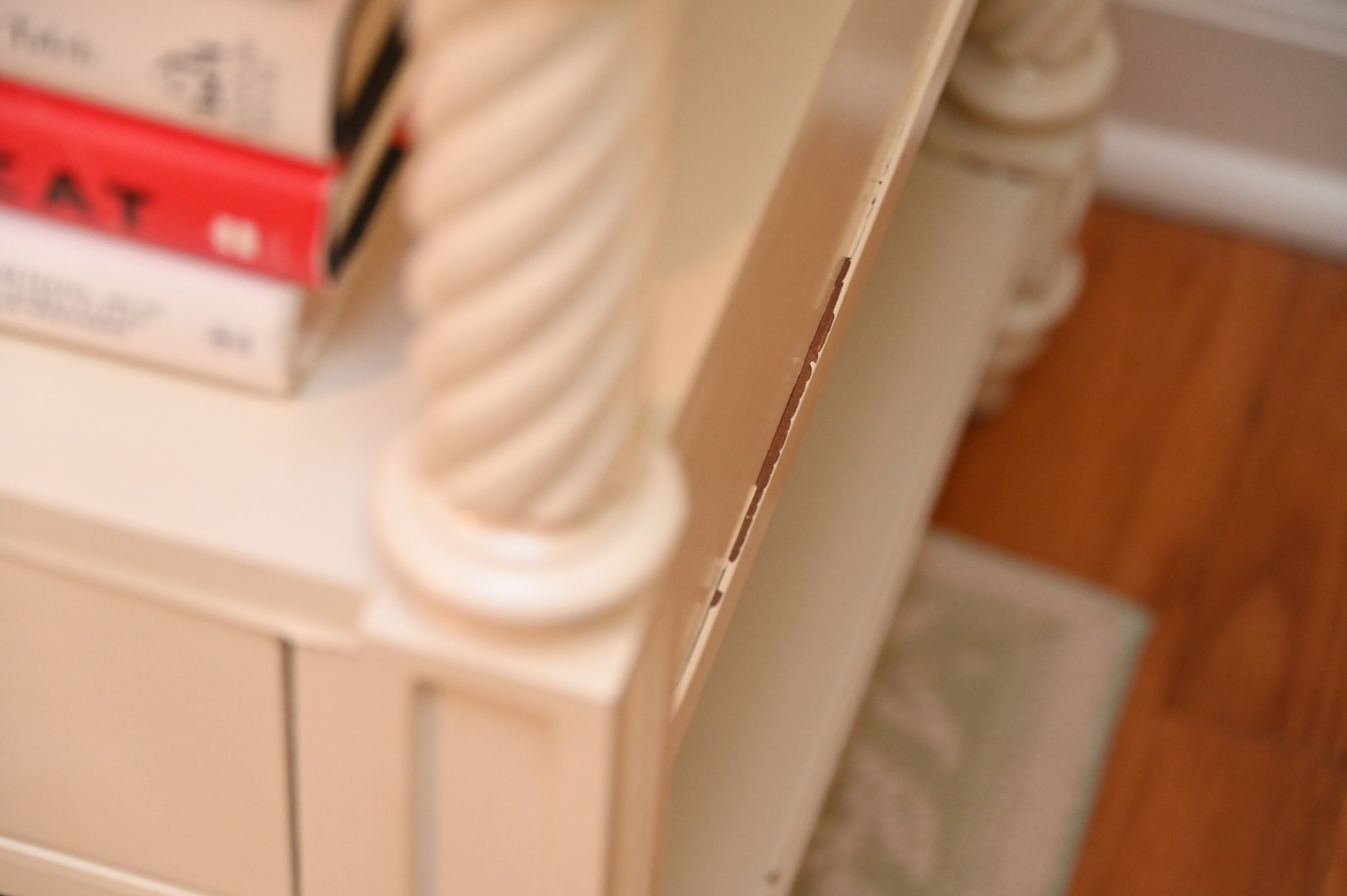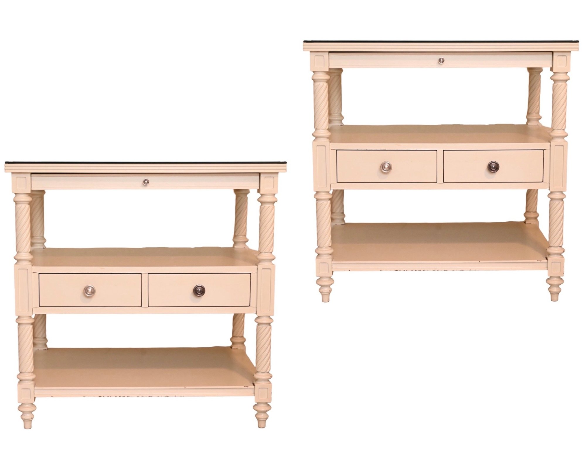 Measures: 28 x 21 x 28- paint loss to sections of each table as seen in the photos that need to be touched up- each table has a custom glass top