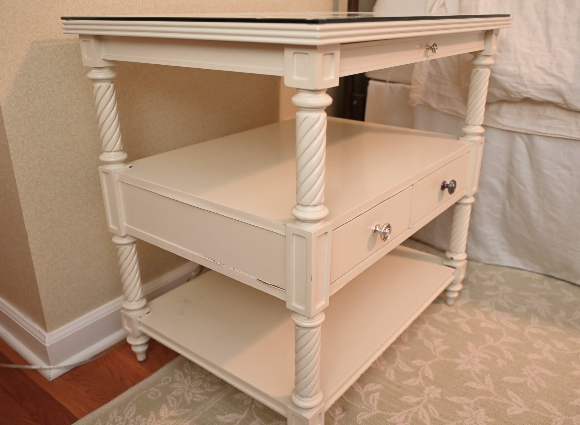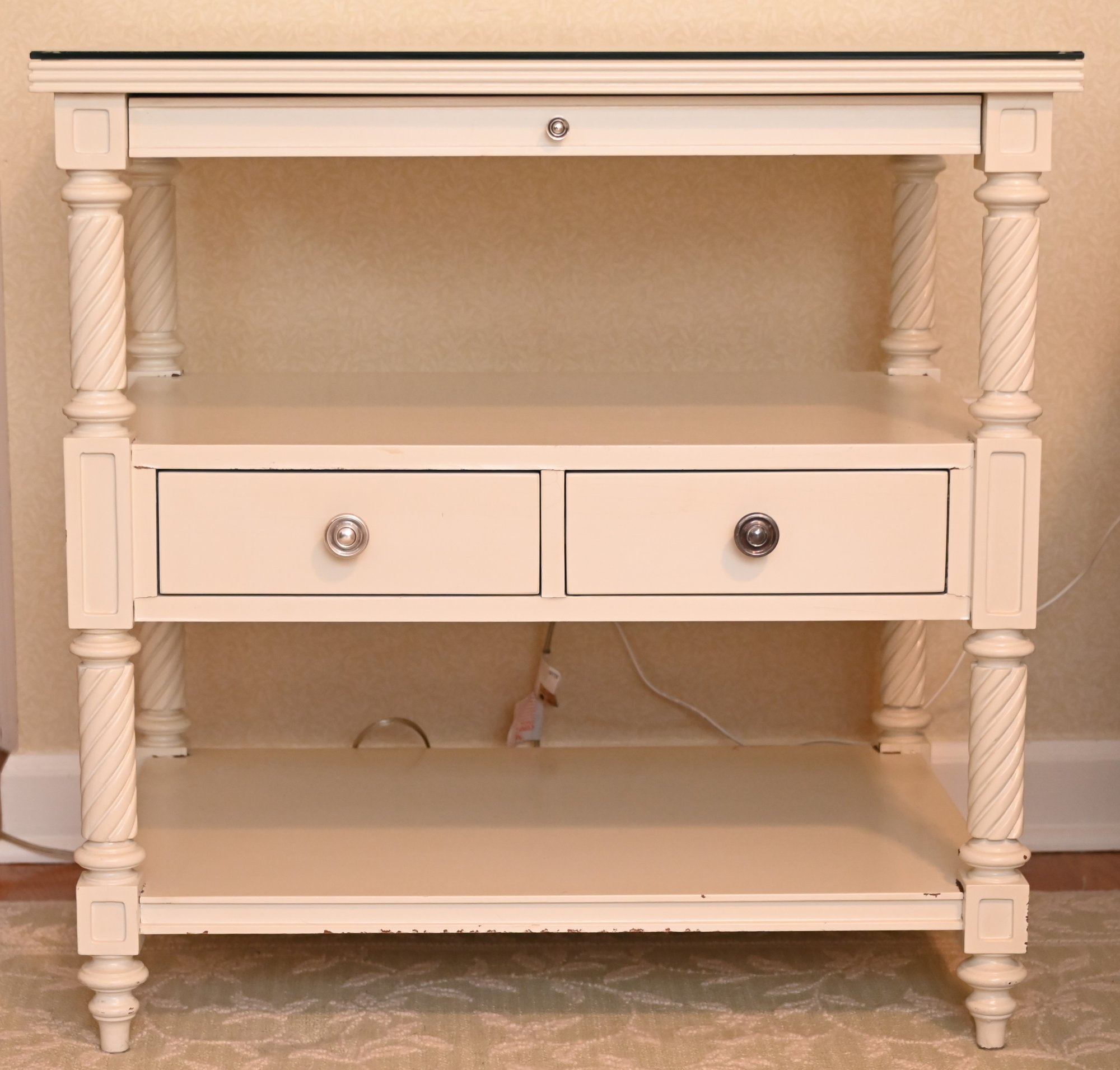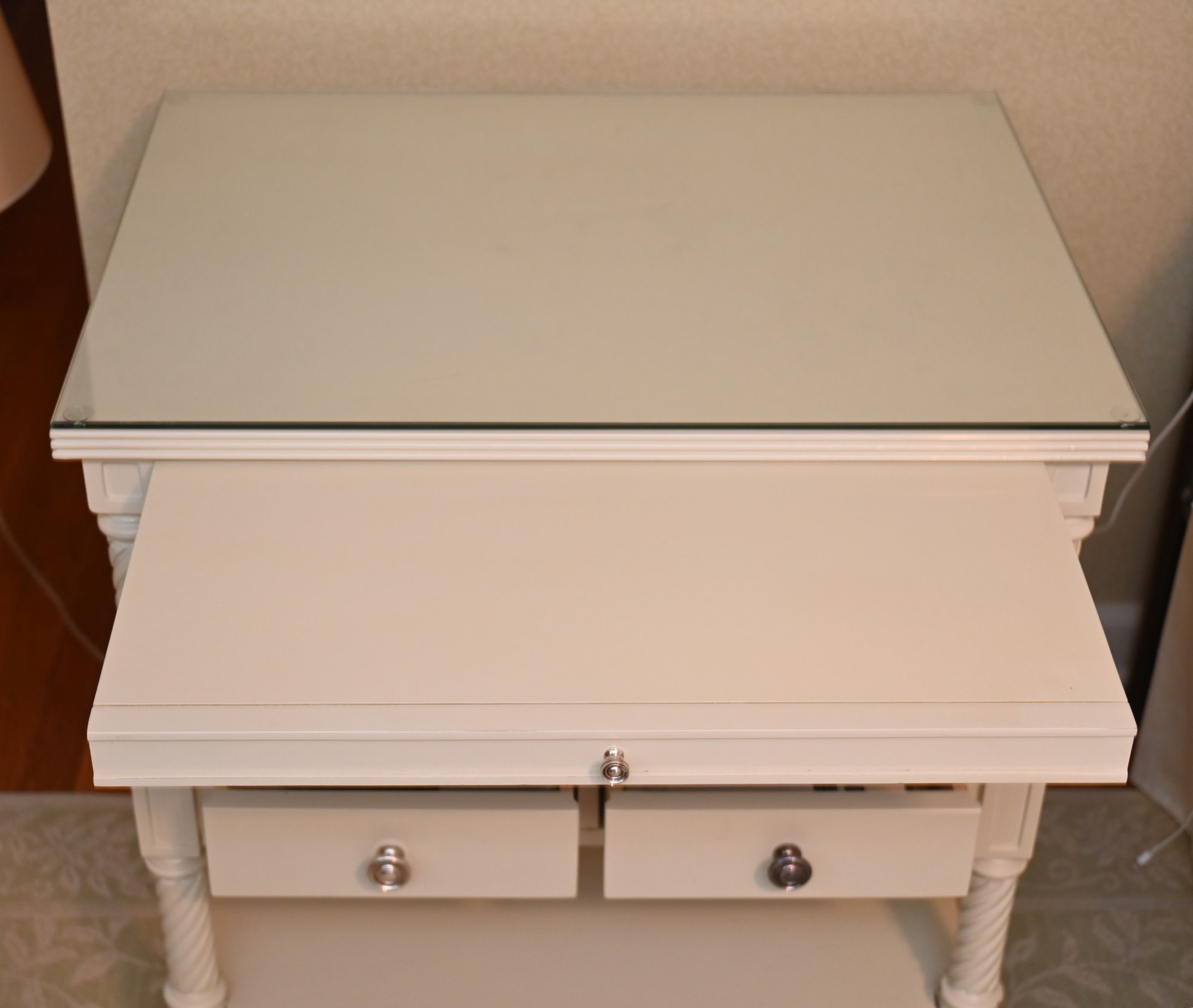 Finished in a soft, creamy white, the piece features beautifully turned and twisted legs that add a touch of sophistication and craftsmanship. The table is topped with a glass surface, enhancing its refined appeal while providing durability and easy maintenance. Below, two drawers with sleek metal knobs offer convenient storage for small essentials, while an open shelf beneath allows for stylish display or additional organization.