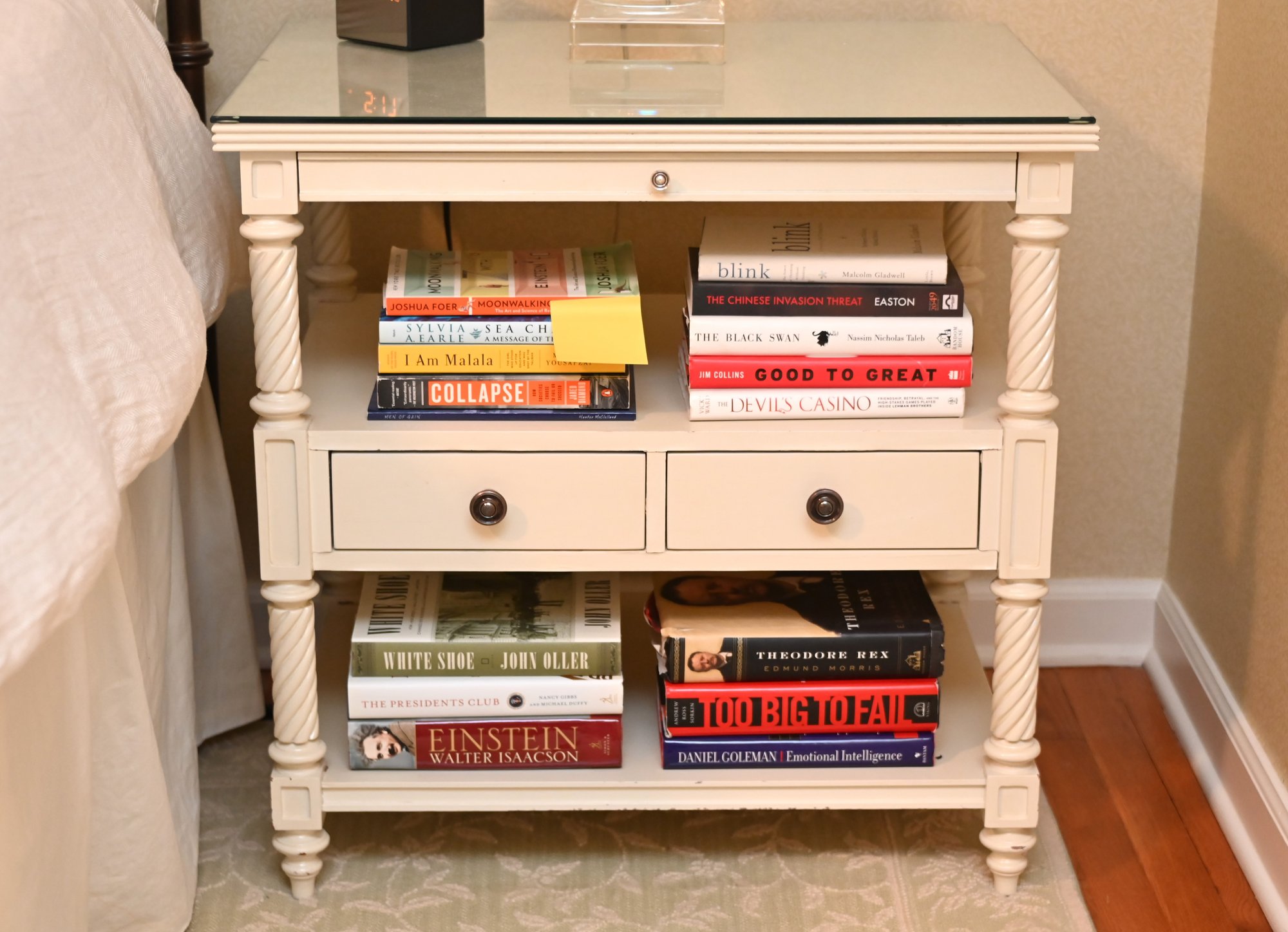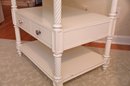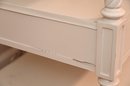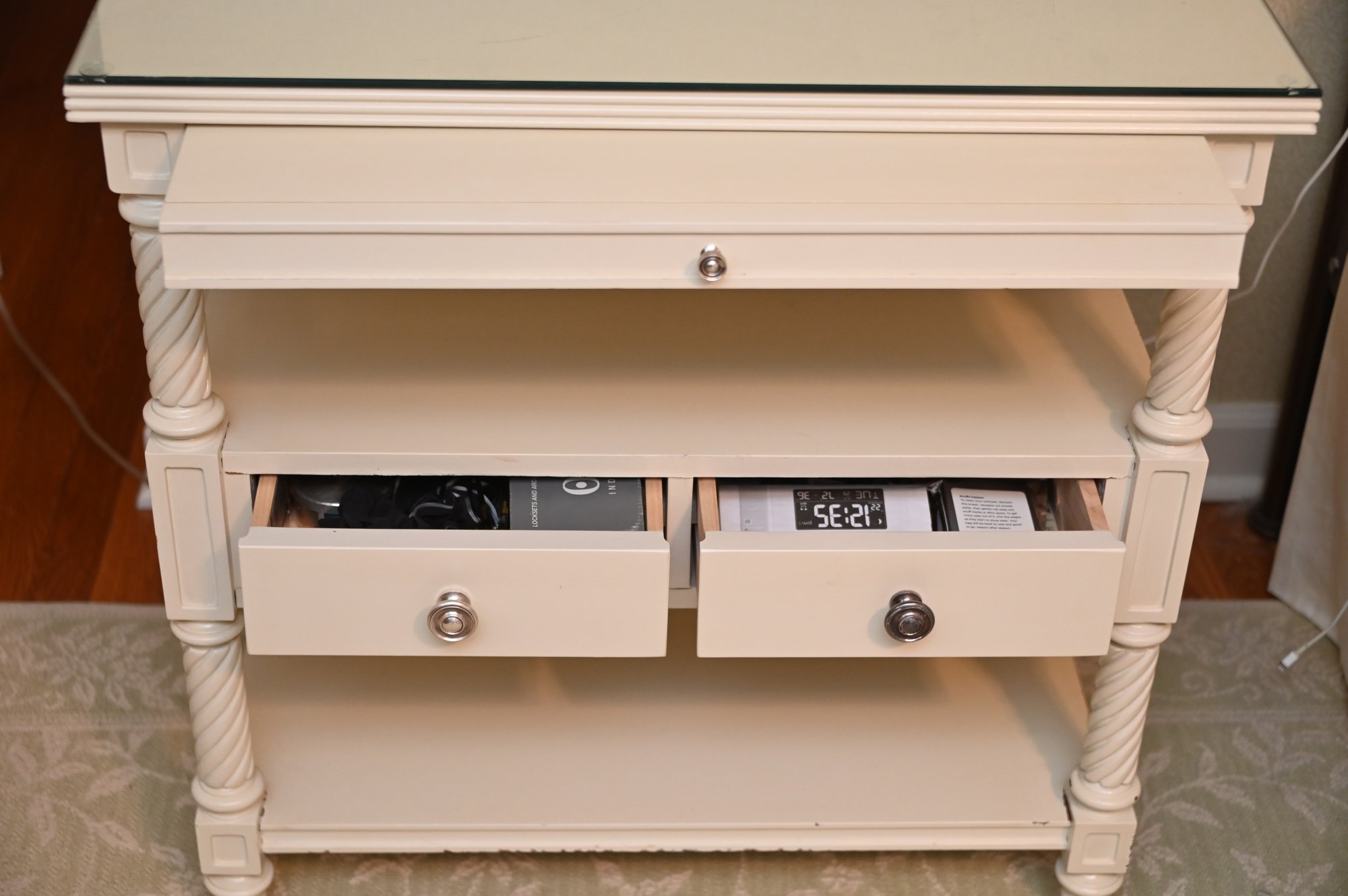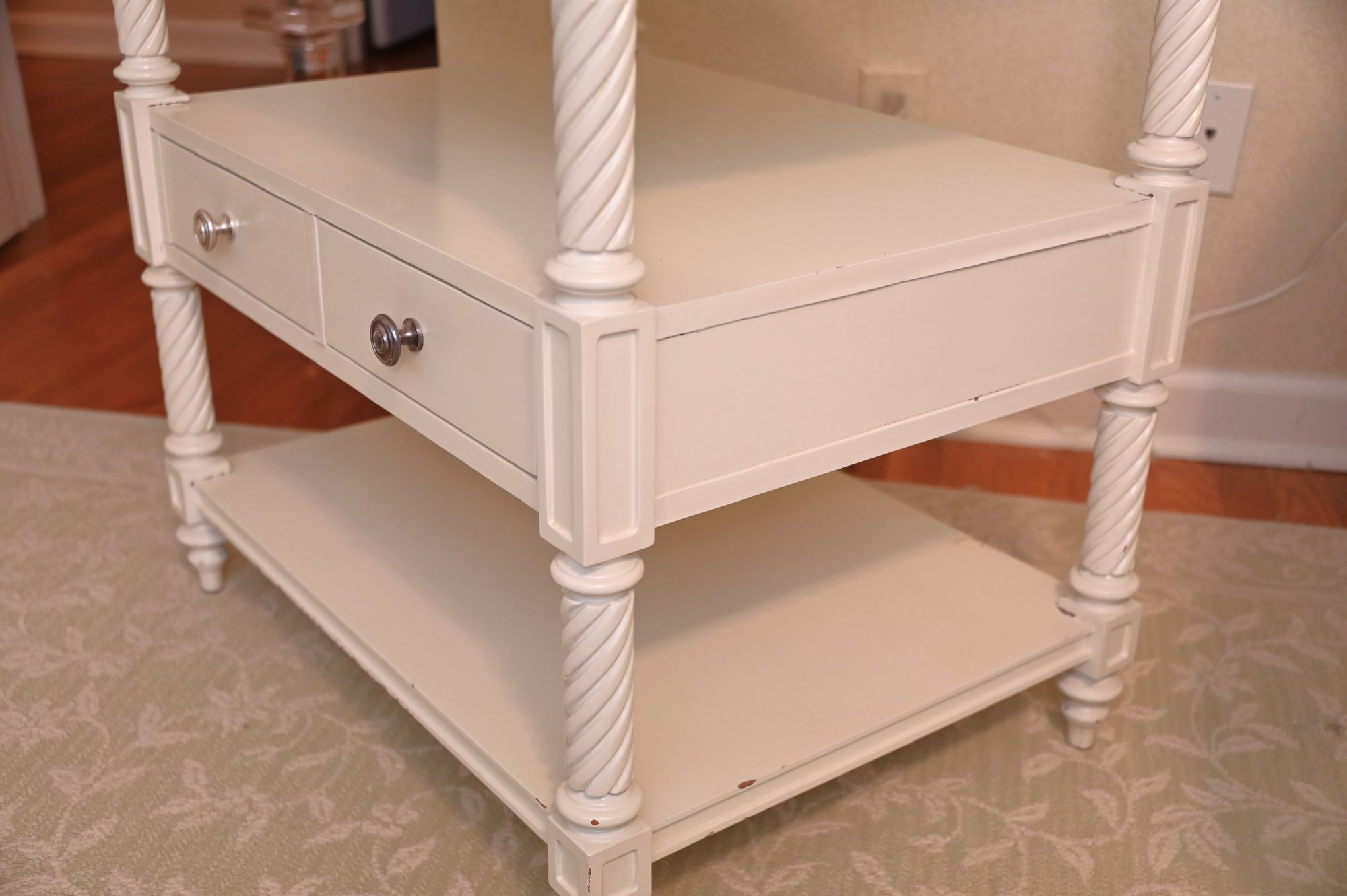 Finished in a soft, creamy white, the piece features beautifully turned and twisted legs that add a touch of sophistication and craftsmanship. The table is topped with a glass surface, enhancing its refined appeal while providing durability and easy maintenance. Below, two drawers with sleek metal knobs offer convenient storage for small essentials, while an open shelf beneath allows for stylish display or additional organization.