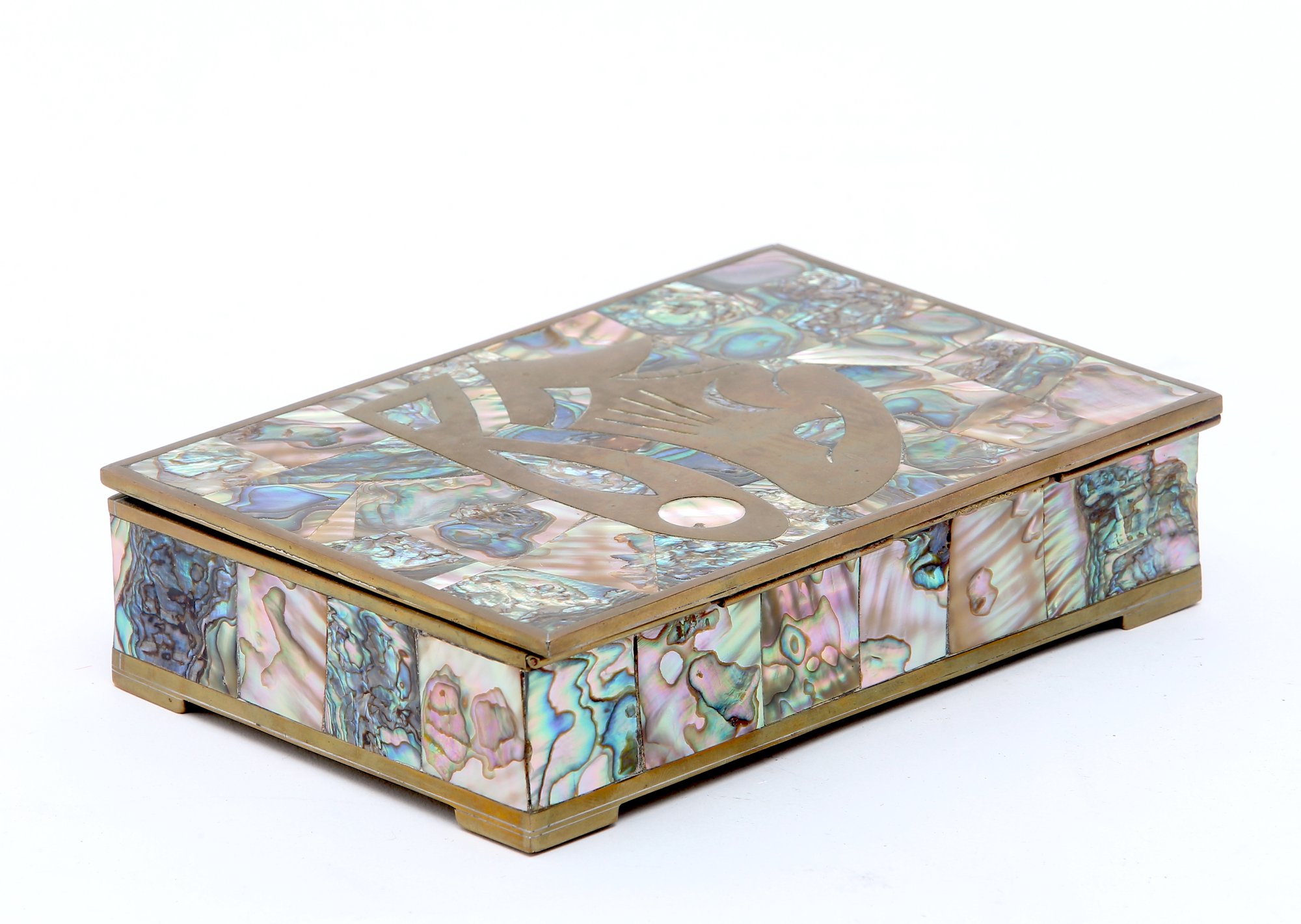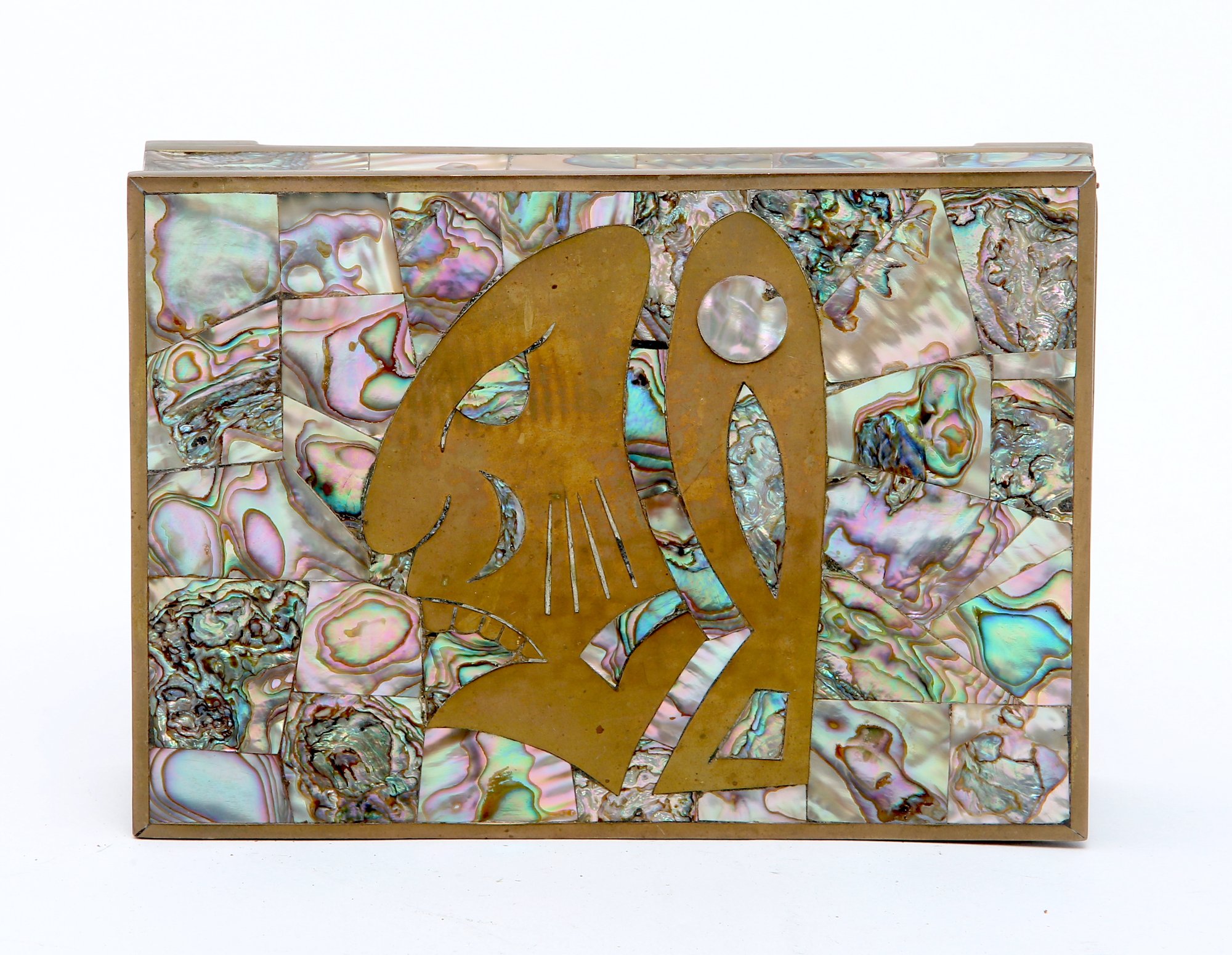 Alpaca Abalone Box Hinged Signed Mexico 1960s. Beautiful abalone over silver plate box and walnut interior. Signed on the underside of the box : Alpaca Hecho en Mexico. measures 4.5 x 6.5 x2.5