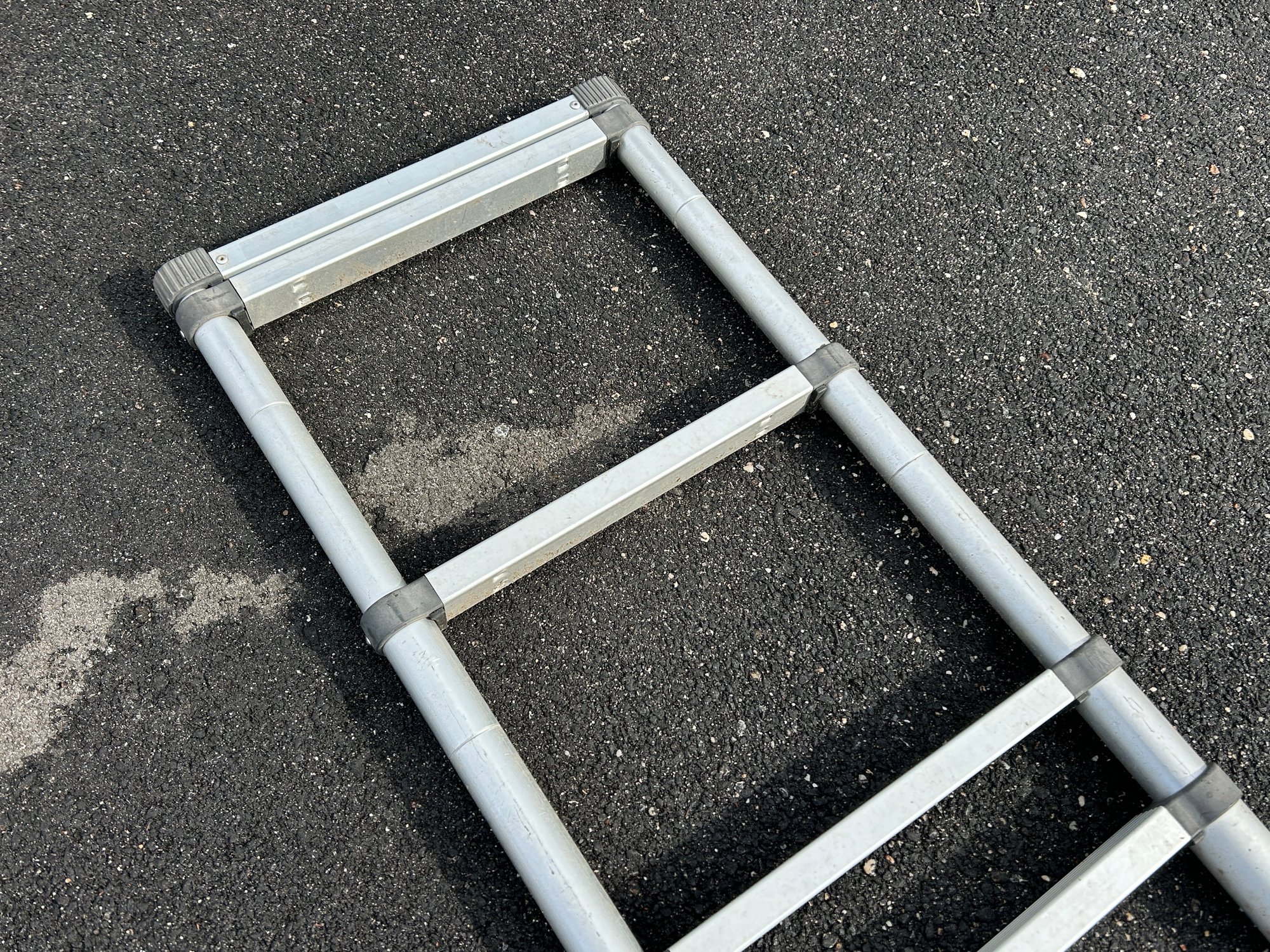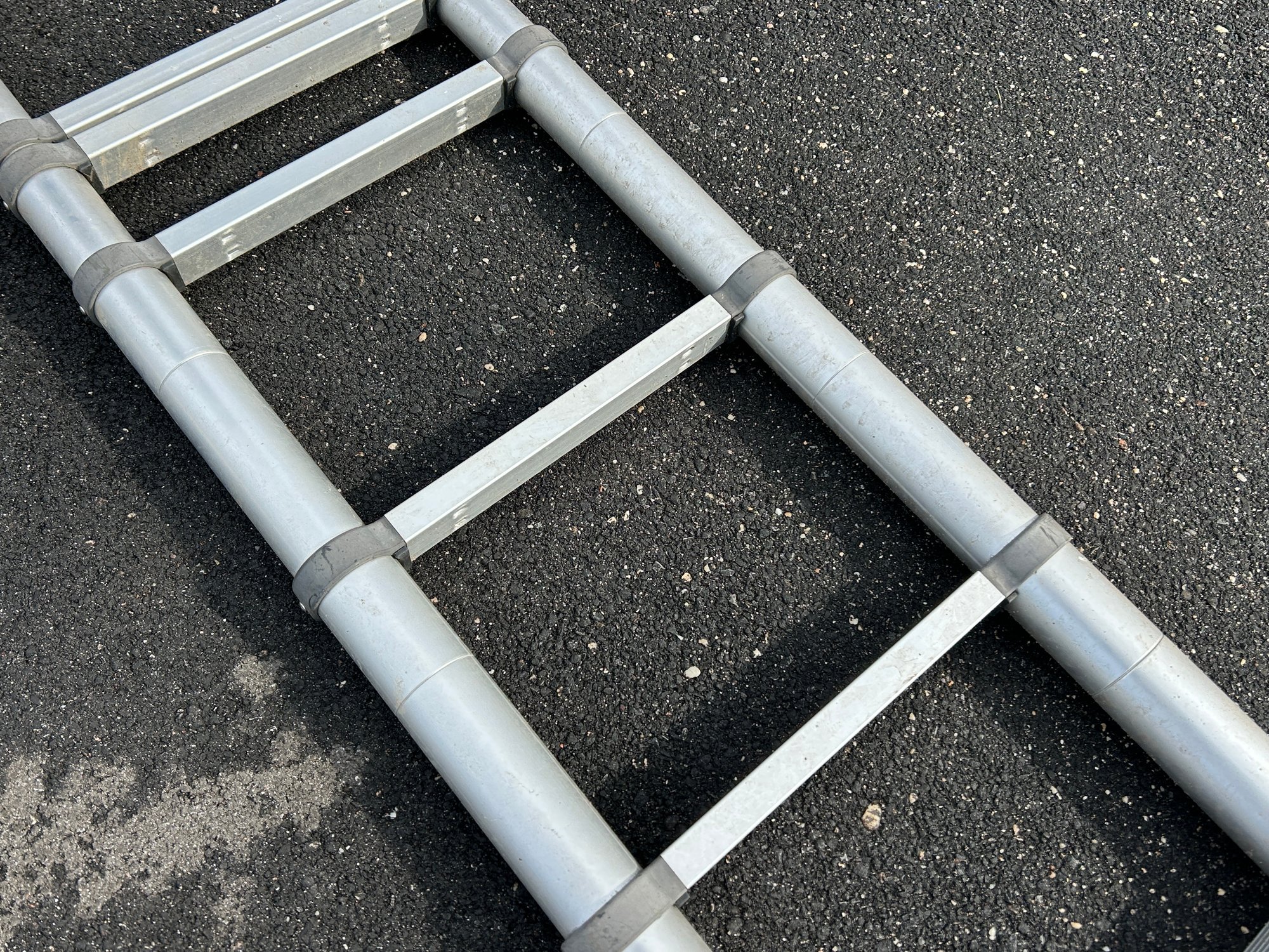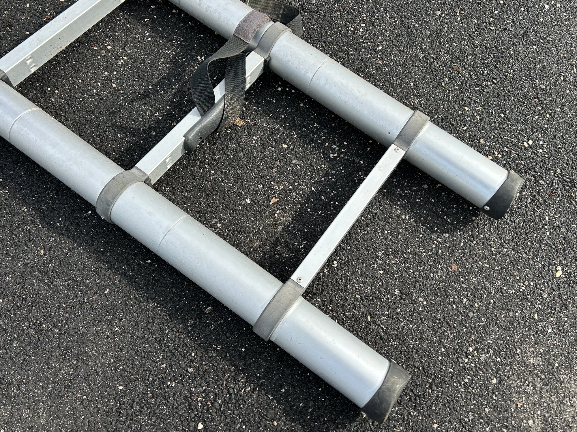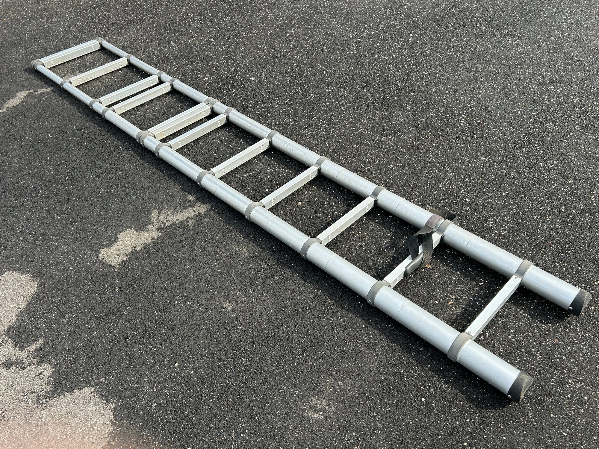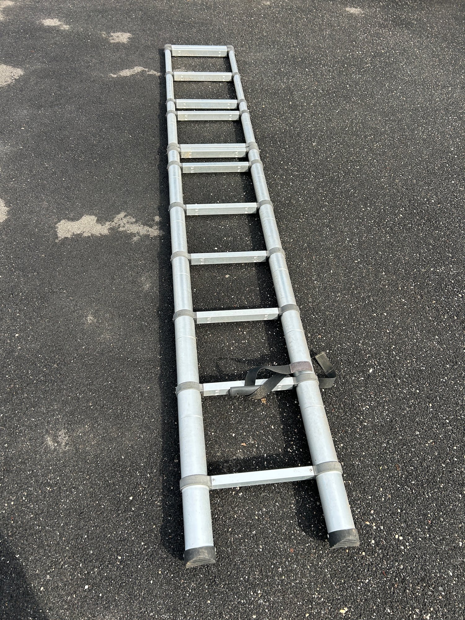 This is a silver-toned aluminum telescoping extension ladder featuring multiple retractable sections and flat rungs. It has black rubber feet for stability and a black strap for securing it when collapsed. The ladder is designed for compact storage and portability.