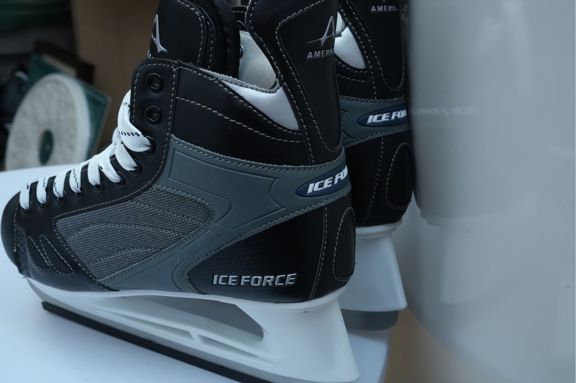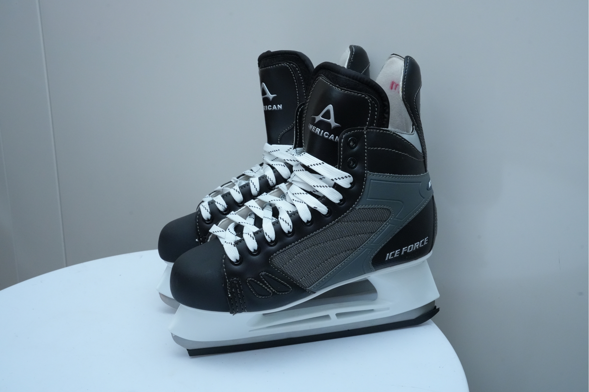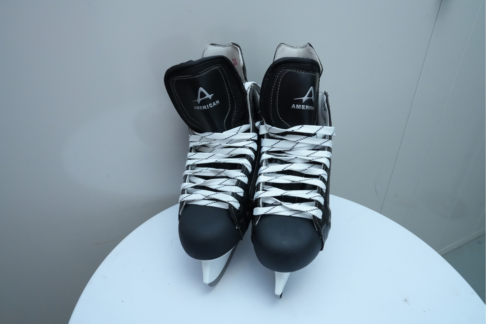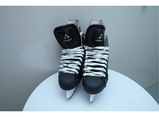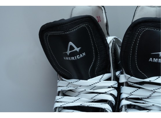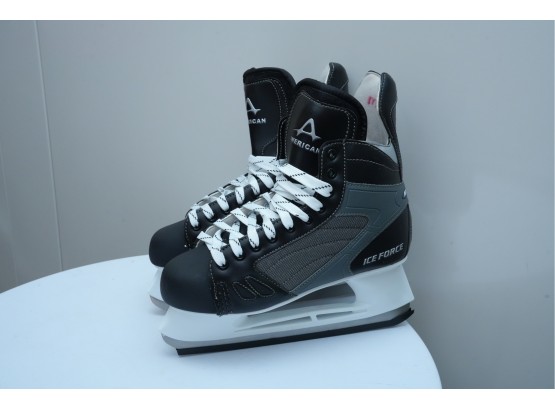 American Athletic Shoe and Co. (U.S.A.) "Ice Force" hockey skates in black. Marked "M10" on the tongue, for "Men's Size 10."