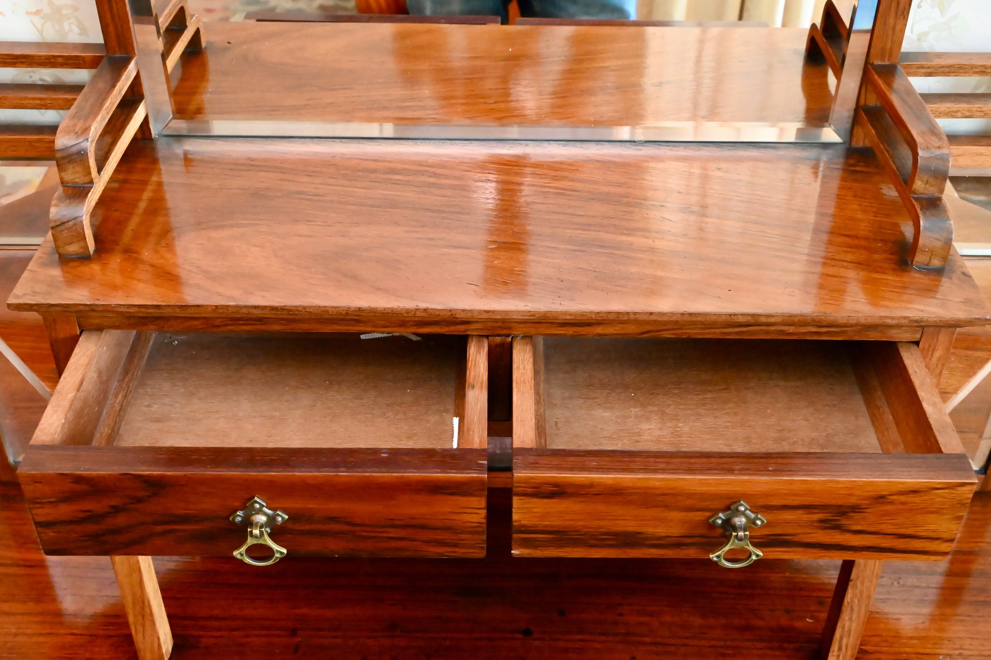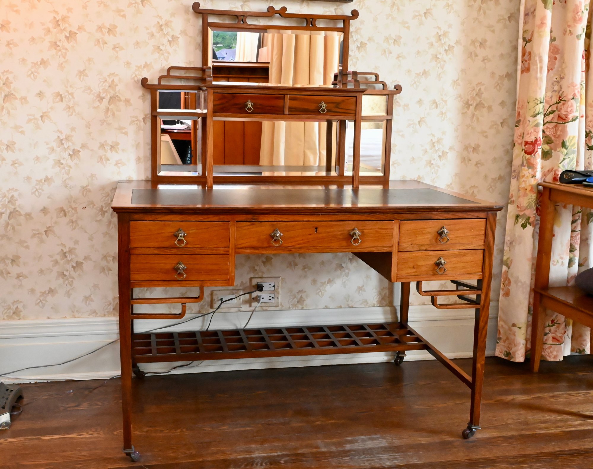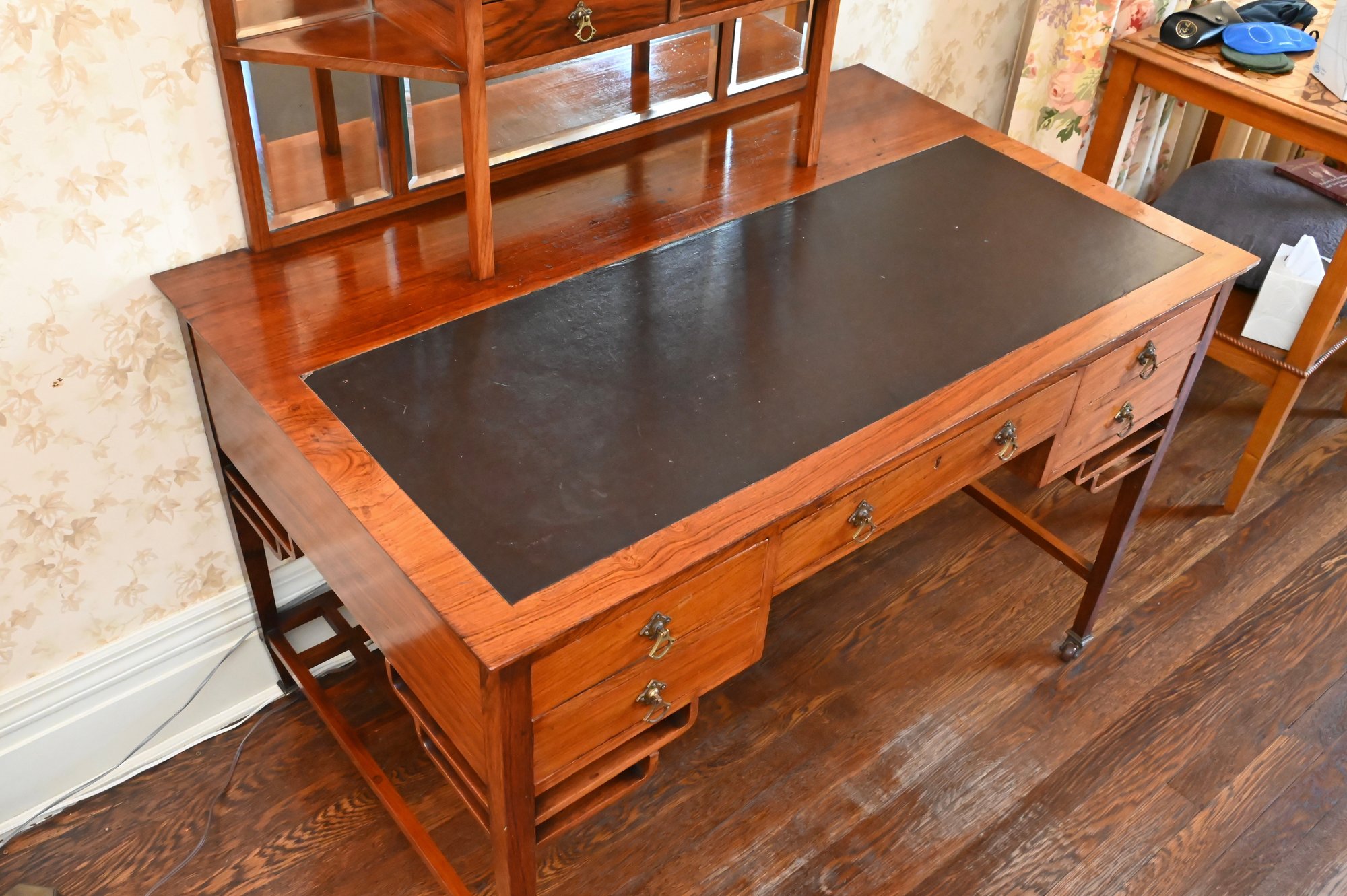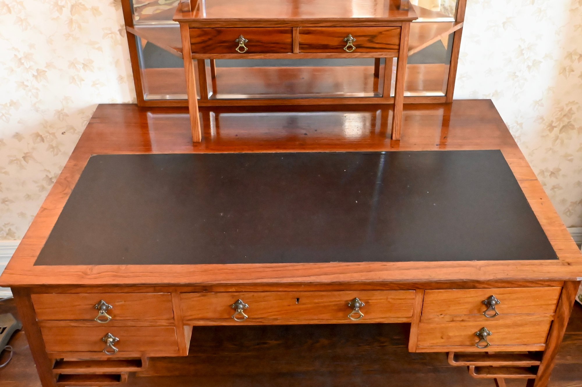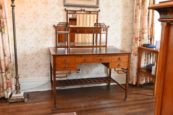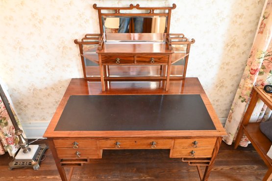 Good overall condition consistent with age and use. Minor surface wear and marks to the wood and leather writing surface. Mirror plates appear intact. Structurally sound.Damage to rear left leg as shown in photos
