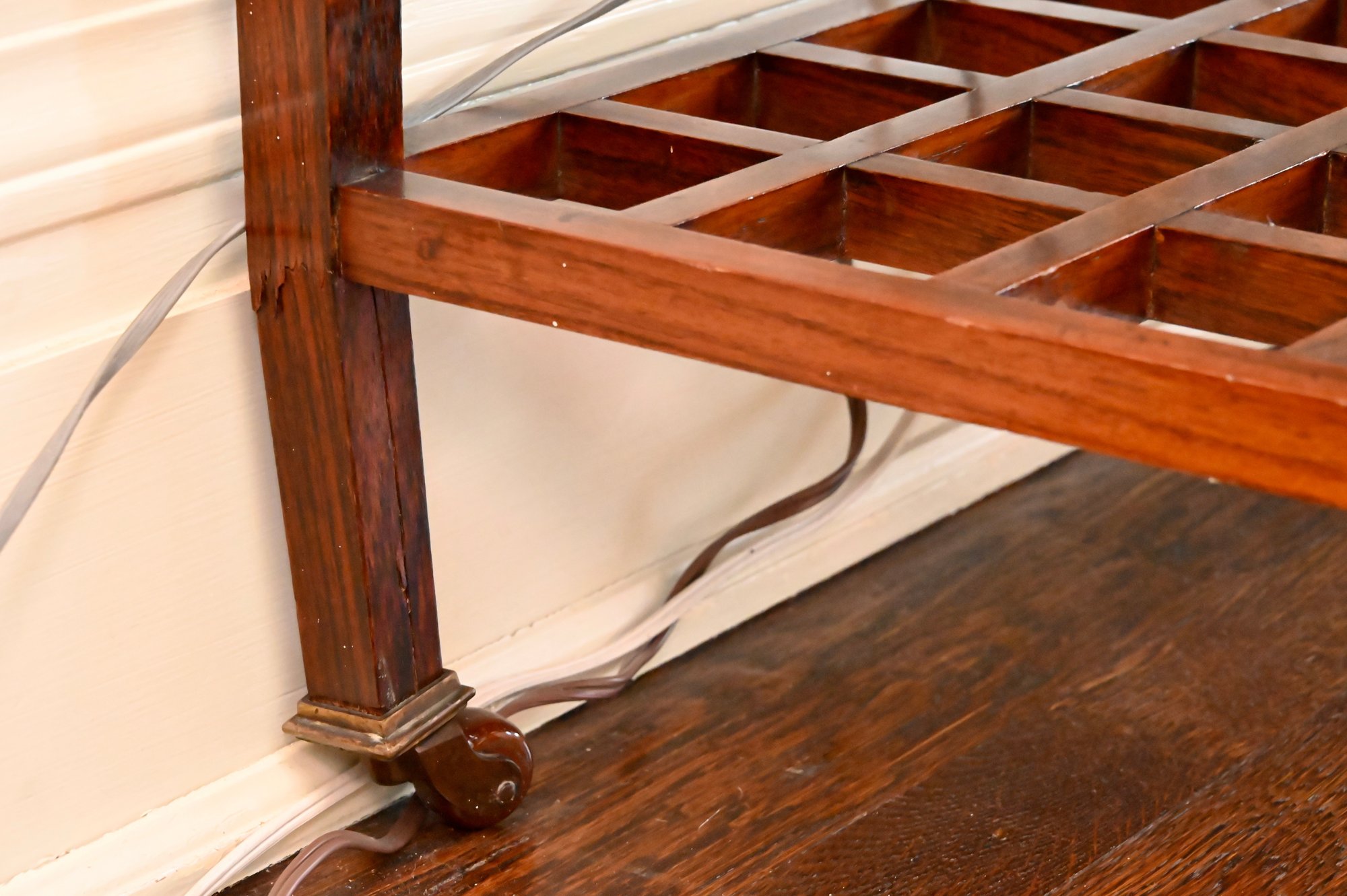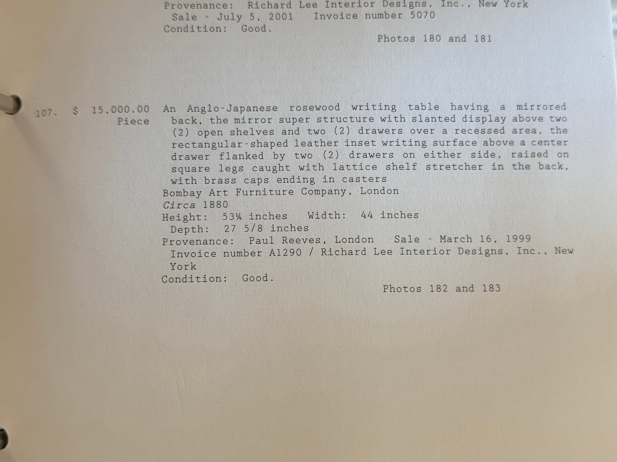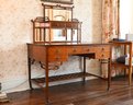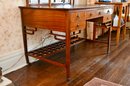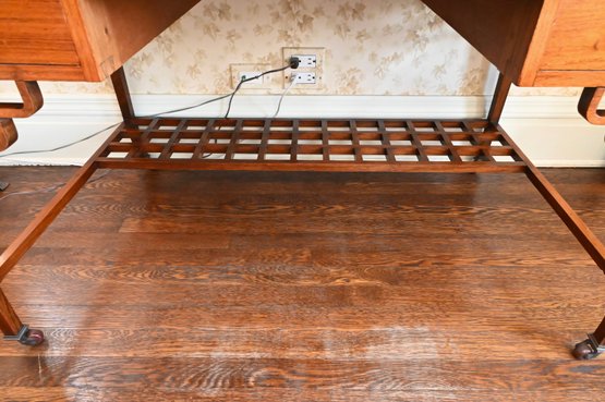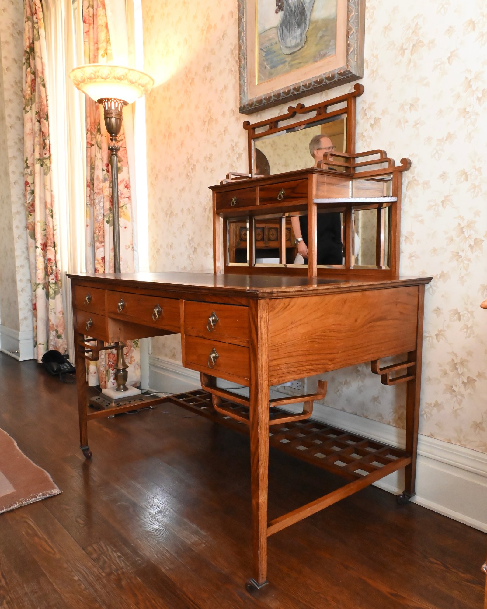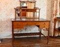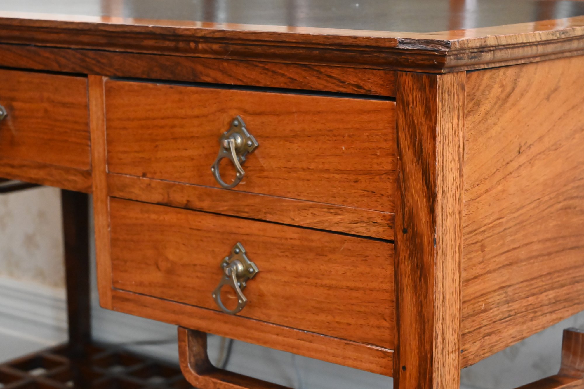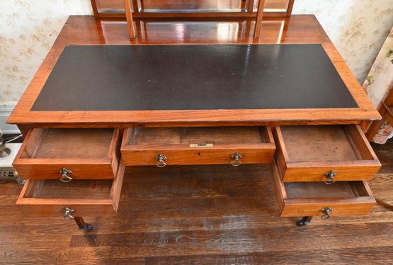 Good overall condition consistent with age and use. Minor surface wear and marks to the wood and leather writing surface. Mirror plates appear intact. Structurally sound.Damage to rear left leg as shown in photos