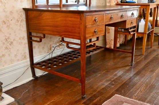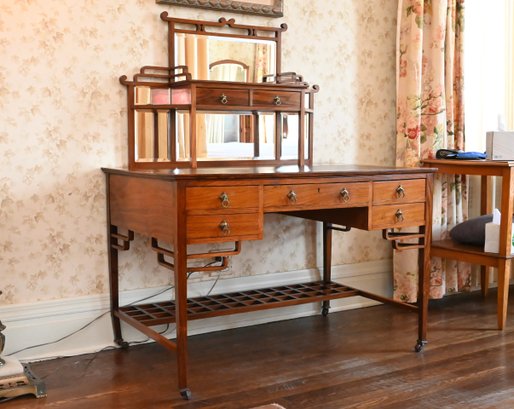 An Anglo-Japanese rosewood writing desk by the Bombay Art Furniture Company, London, dating to circa 1880. The desk features a mirrored superstructure with a central looking glass flanked by open shelves and two small drawers beneath a slanted display ledge. The writing surface is fitted with a rectangular leather inset, above a central drawer and flanked by two drawers on each side, all with decorative brass pulls. The base is supported on square legs joined by a lattice shelf stretcher at the rear, terminating in brass caps and casters. The rosewood displays rich figuring and warm tones, characteristic of the Anglo-Japanese aesthetic combining British craftsmanship with Eastern design influence.