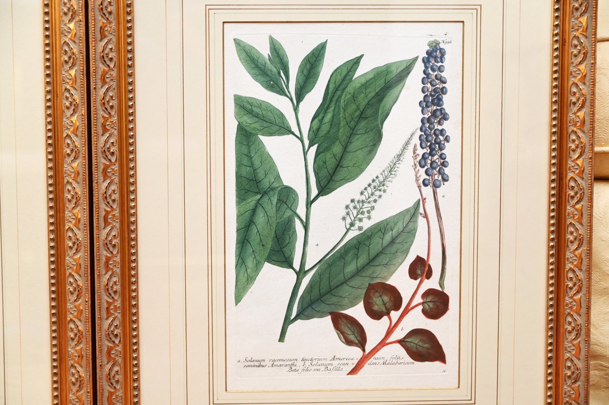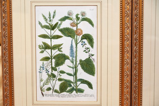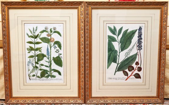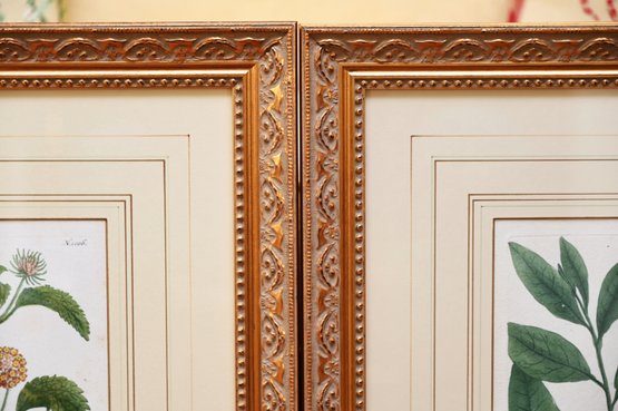 This is a pair of botanical prints, each featuring detailed hand-colored illustrations of plants. The prints are framed in ornate gold frames with intricate decorative molding and triple matting in shades of cream and beige, adding depth and refinement.