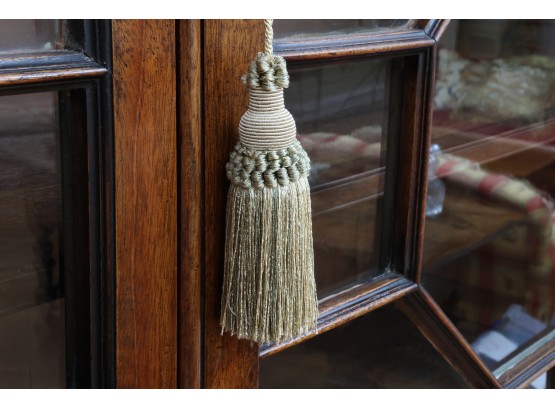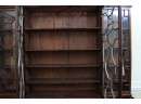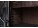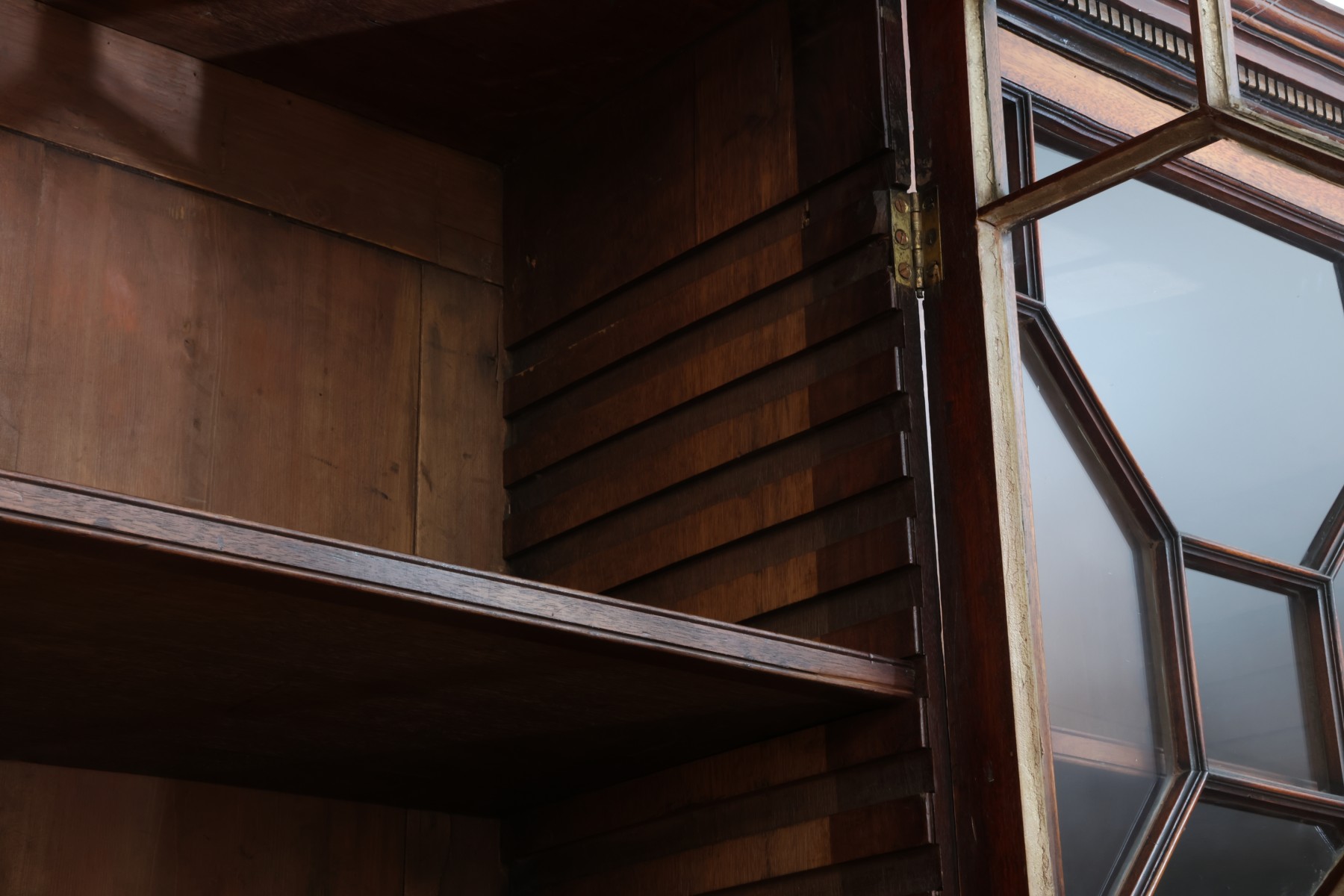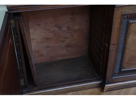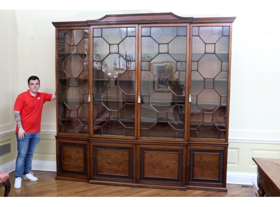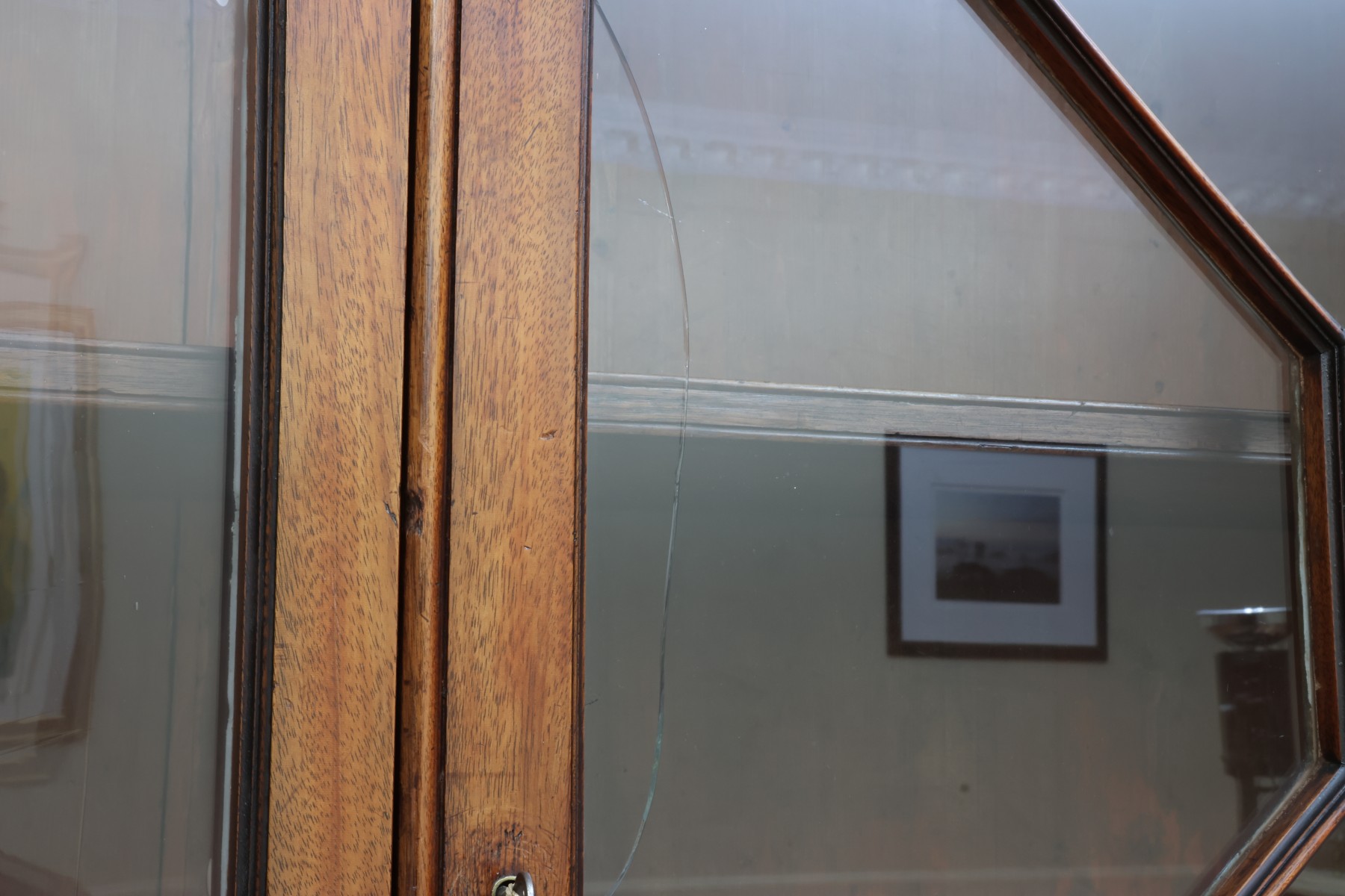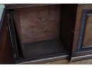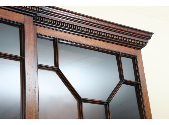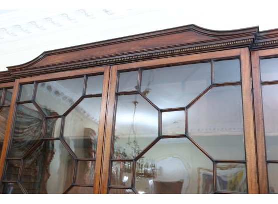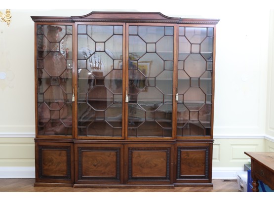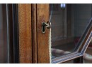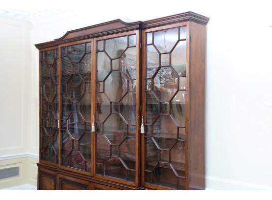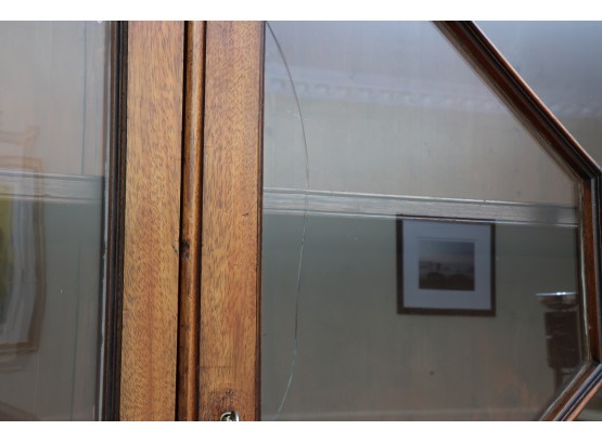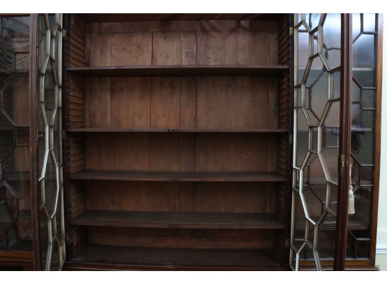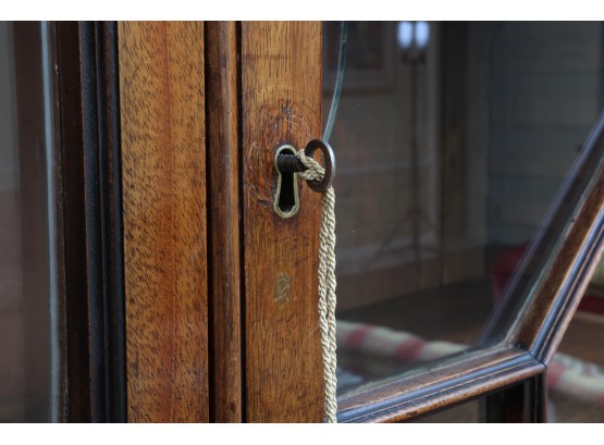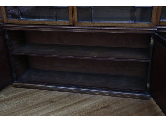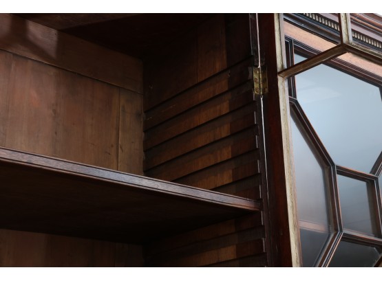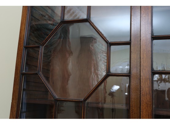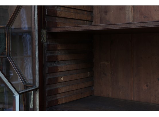 Antique wooden bookcase or display cabinet with original keys included. The wood grain is visible, and the warm tone adds to its charm. The table features four glass-paneled doors in the top section, each adorned with hexagonal mullions creating a honeycomb effect. Inside the top section, there are shelves where books or collectibles can be displayed. The bottom section of the cabinet has four wooden doors featuring panels with a wooden inlay, creating contrast and decorative appeal. Please note that 2 of the glass panels are broken and will need to be replaced