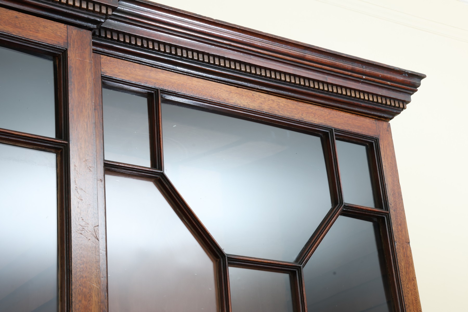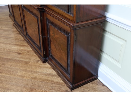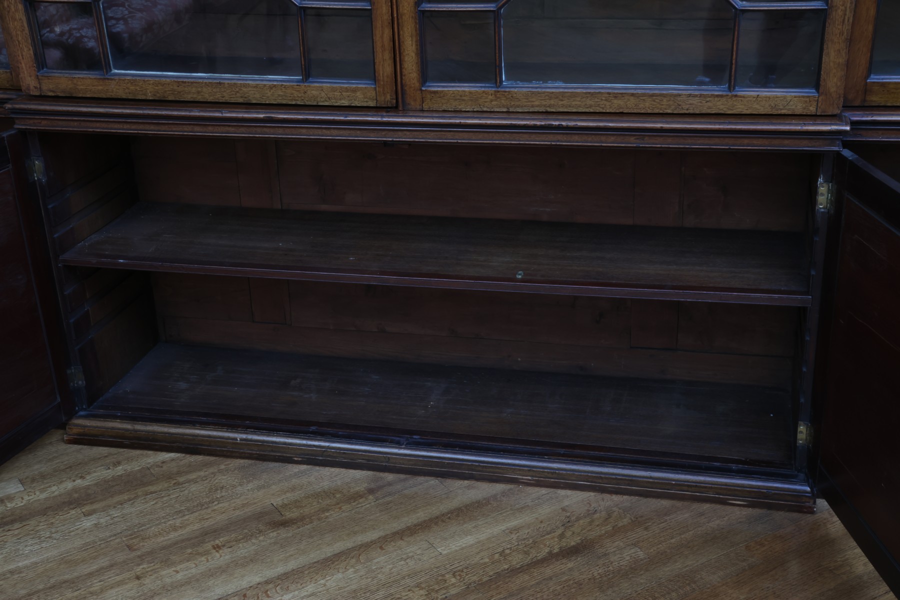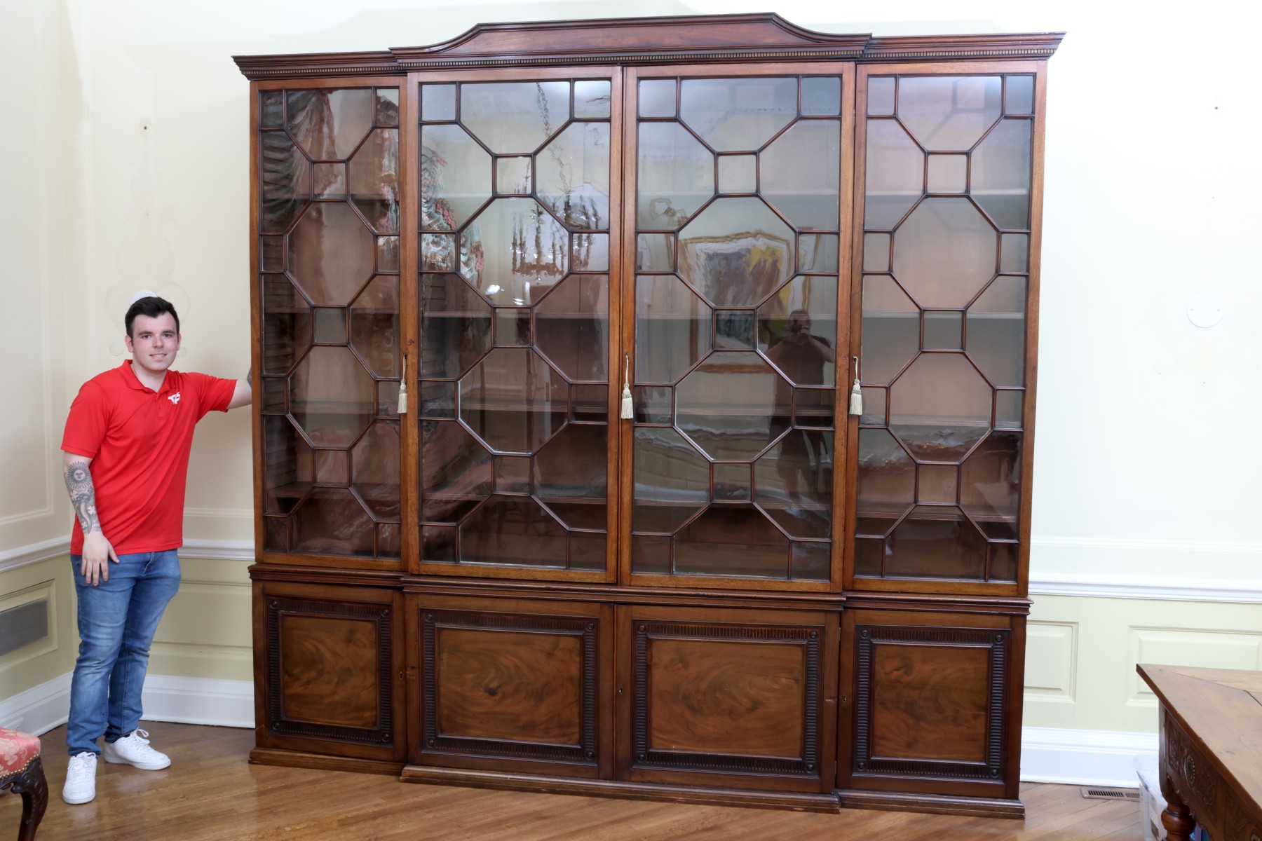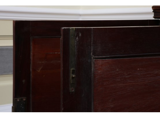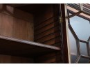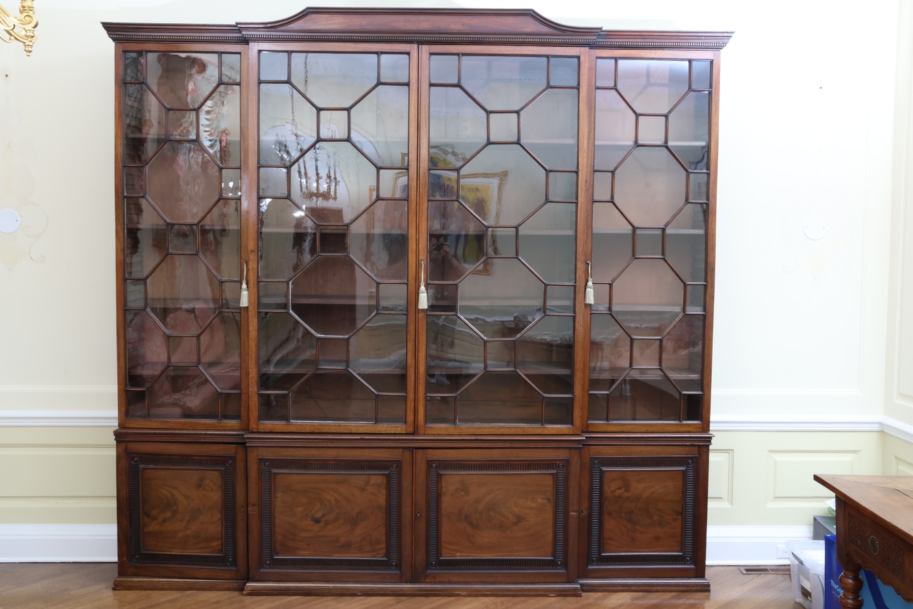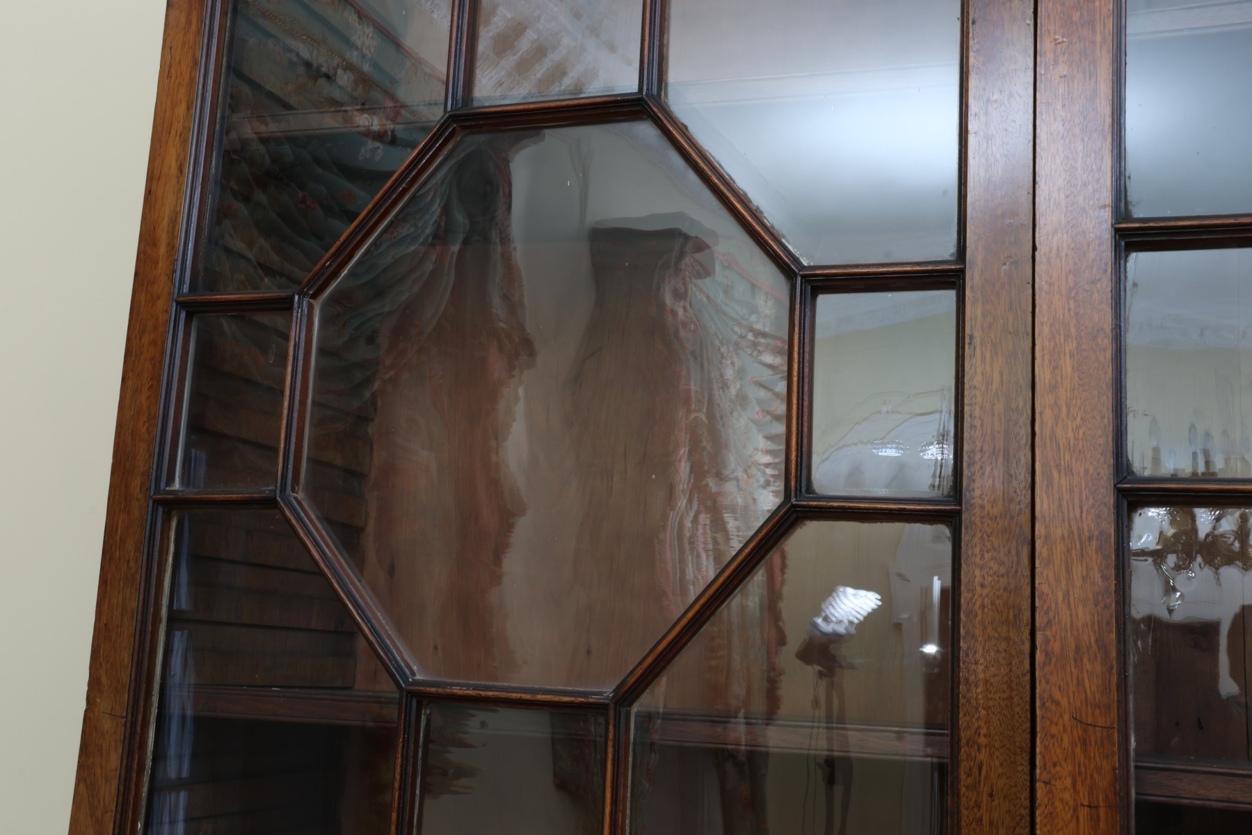 Antique wooden bookcase or display cabinet with original keys included. The wood grain is visible, and the warm tone adds to its charm. The table features four glass-paneled doors in the top section, each adorned with hexagonal mullions creating a honeycomb effect. Inside the top section, there are shelves where books or collectibles can be displayed. The bottom section of the cabinet has four wooden doors featuring panels with a wooden inlay, creating contrast and decorative appeal. Please note that 2 of the glass panels are broken and will need to be replaced