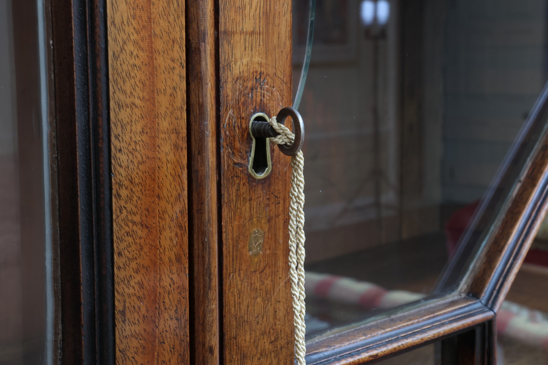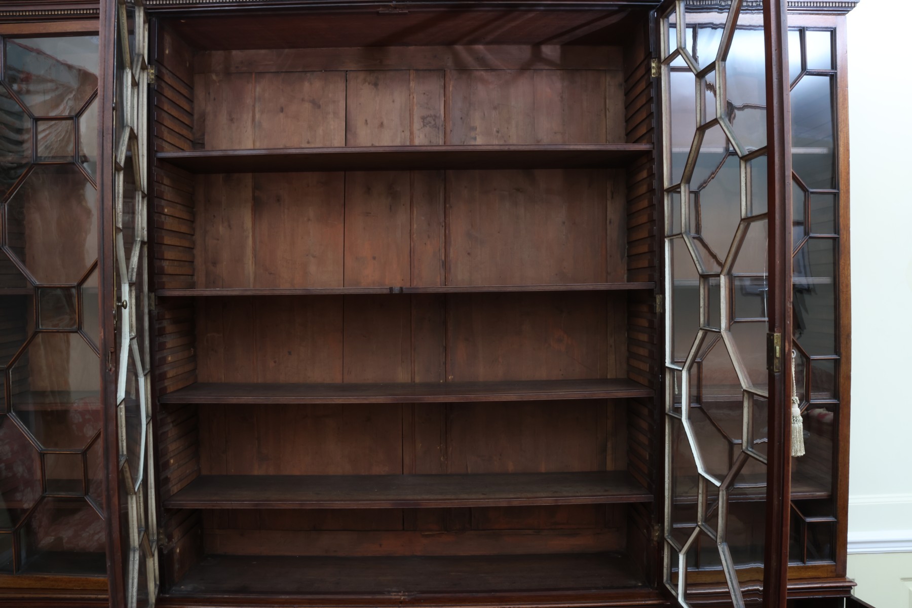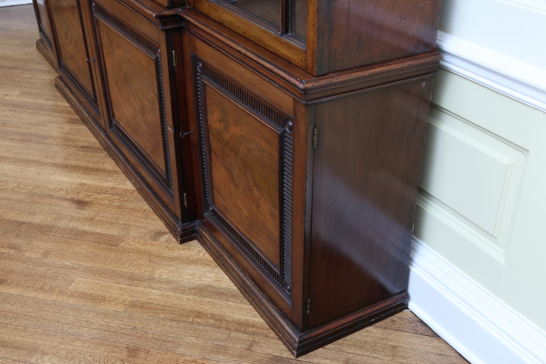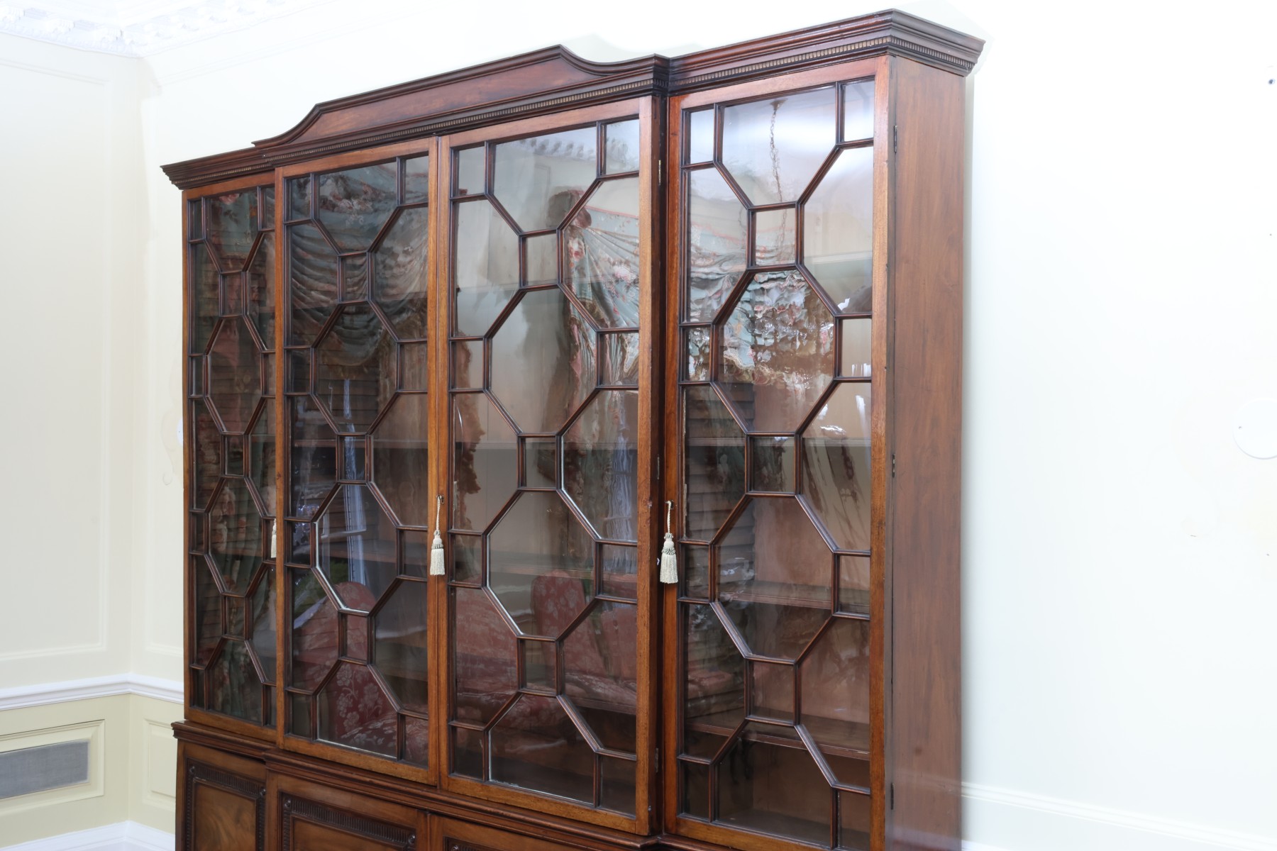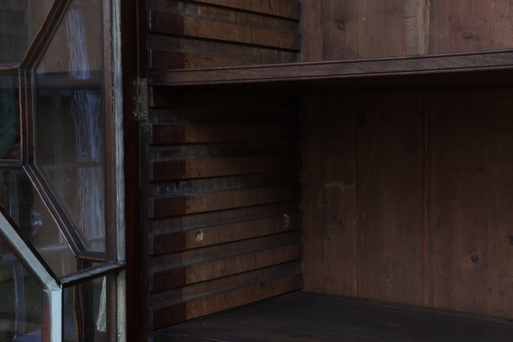 Antique wooden bookcase or display cabinet with original keys included. The wood grain is visible, and the warm tone adds to its charm. The table features four glass-paneled doors in the top section, each adorned with hexagonal mullions creating a honeycomb effect. Inside the top section, there are shelves where books or collectibles can be displayed. The bottom section of the cabinet has four wooden doors featuring panels with a wooden inlay, creating contrast and decorative appeal. Please note that 2 of the glass panels are broken and will need to be replaced