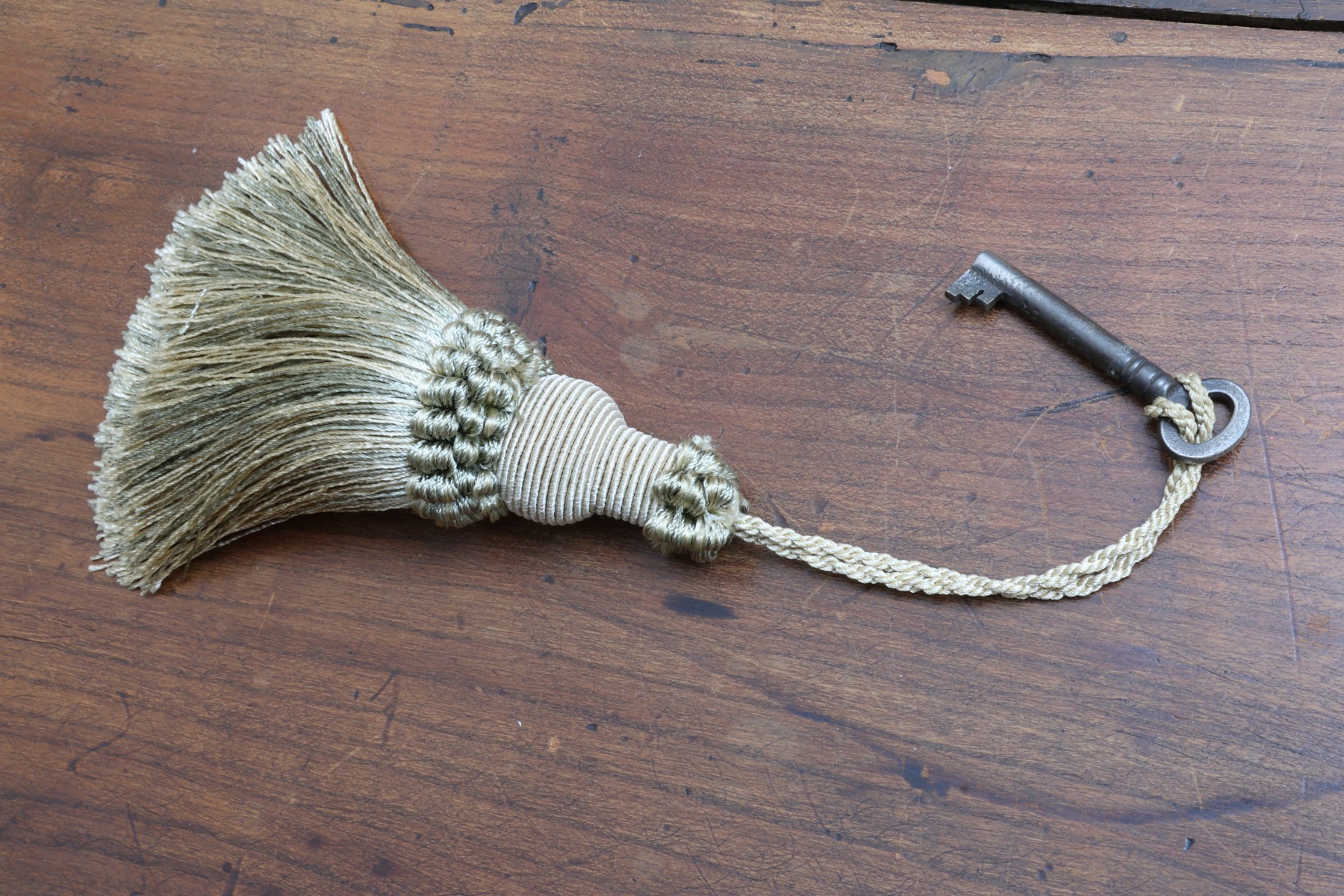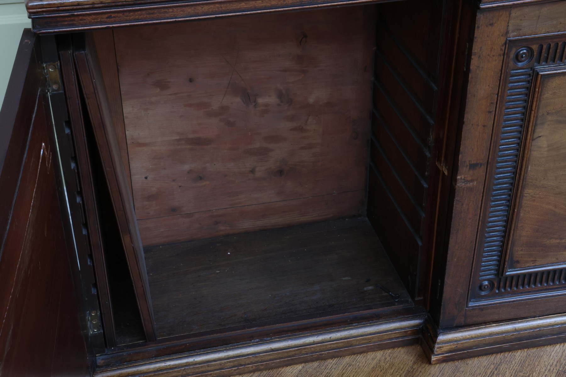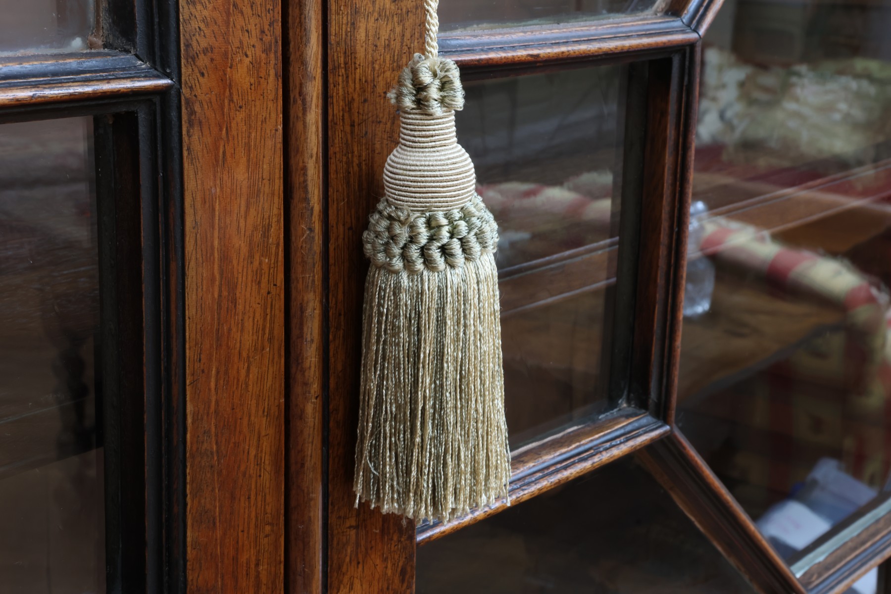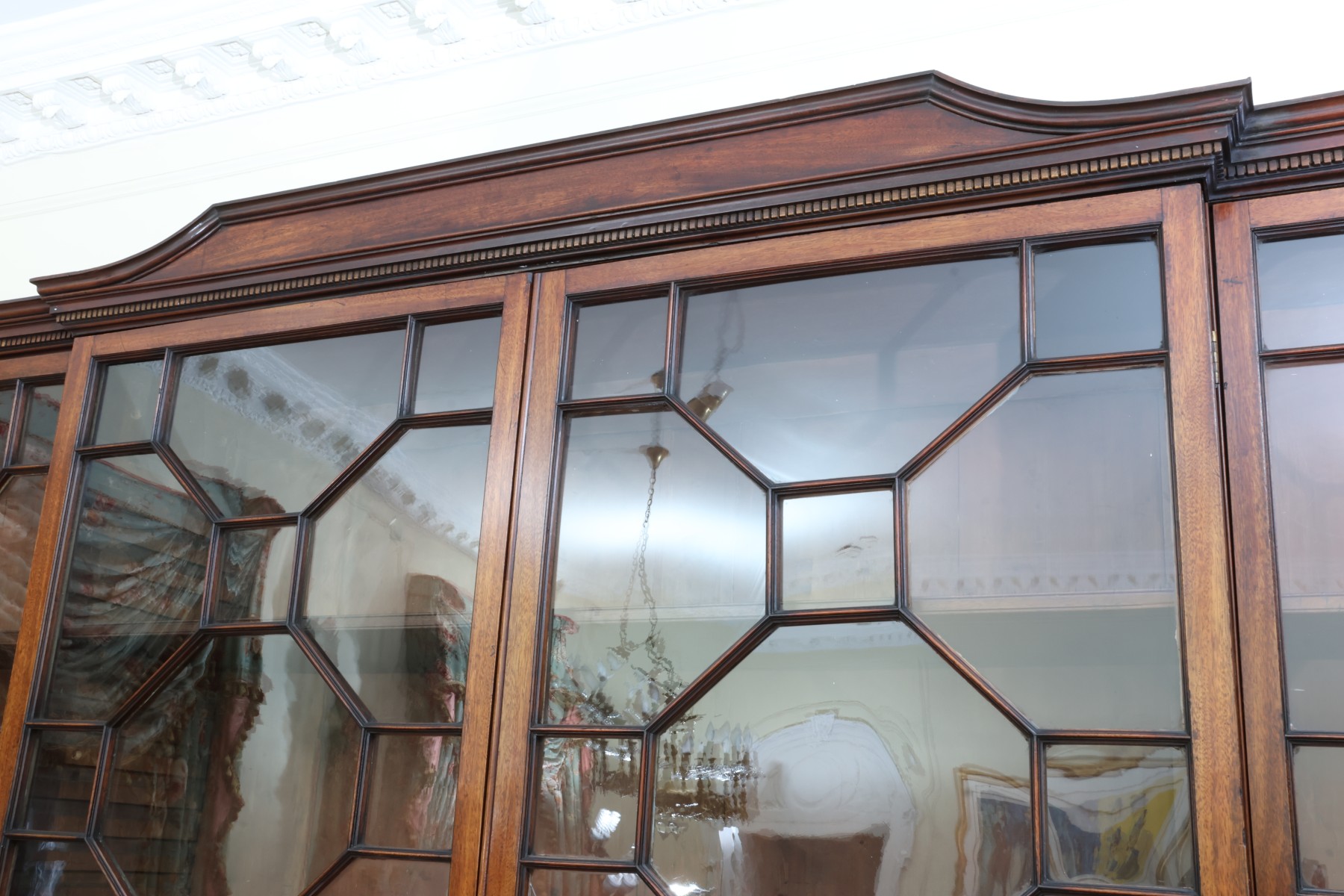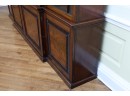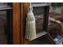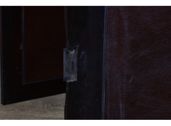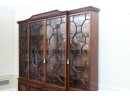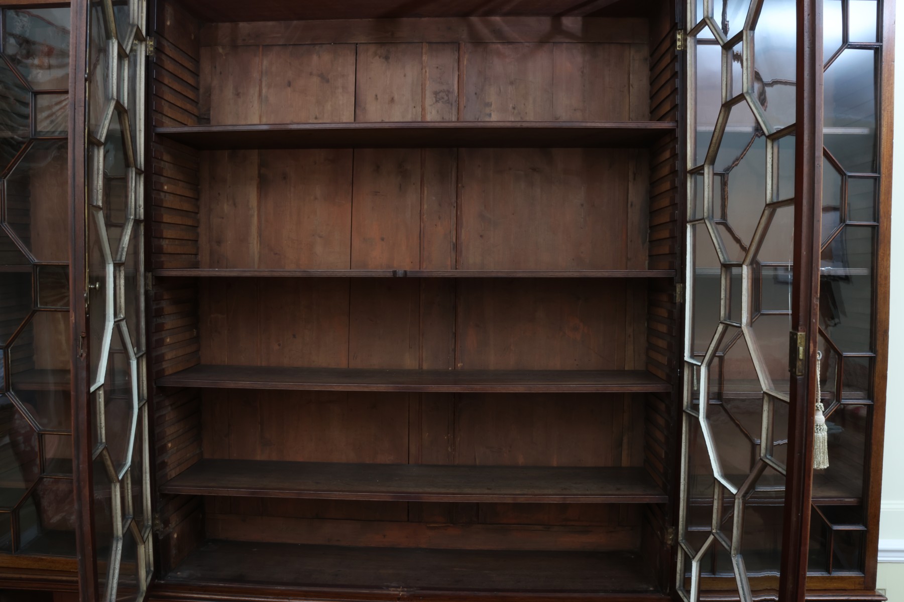 Antique wooden bookcase or display cabinet with original keys included. The wood grain is visible, and the warm tone adds to its charm. The table features four glass-paneled doors in the top section, each adorned with hexagonal mullions creating a honeycomb effect. Inside the top section, there are shelves where books or collectibles can be displayed. The bottom section of the cabinet has four wooden doors featuring panels with a wooden inlay, creating contrast and decorative appeal. Please note that 2 of the glass panels are broken and will need to be replaced