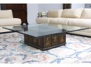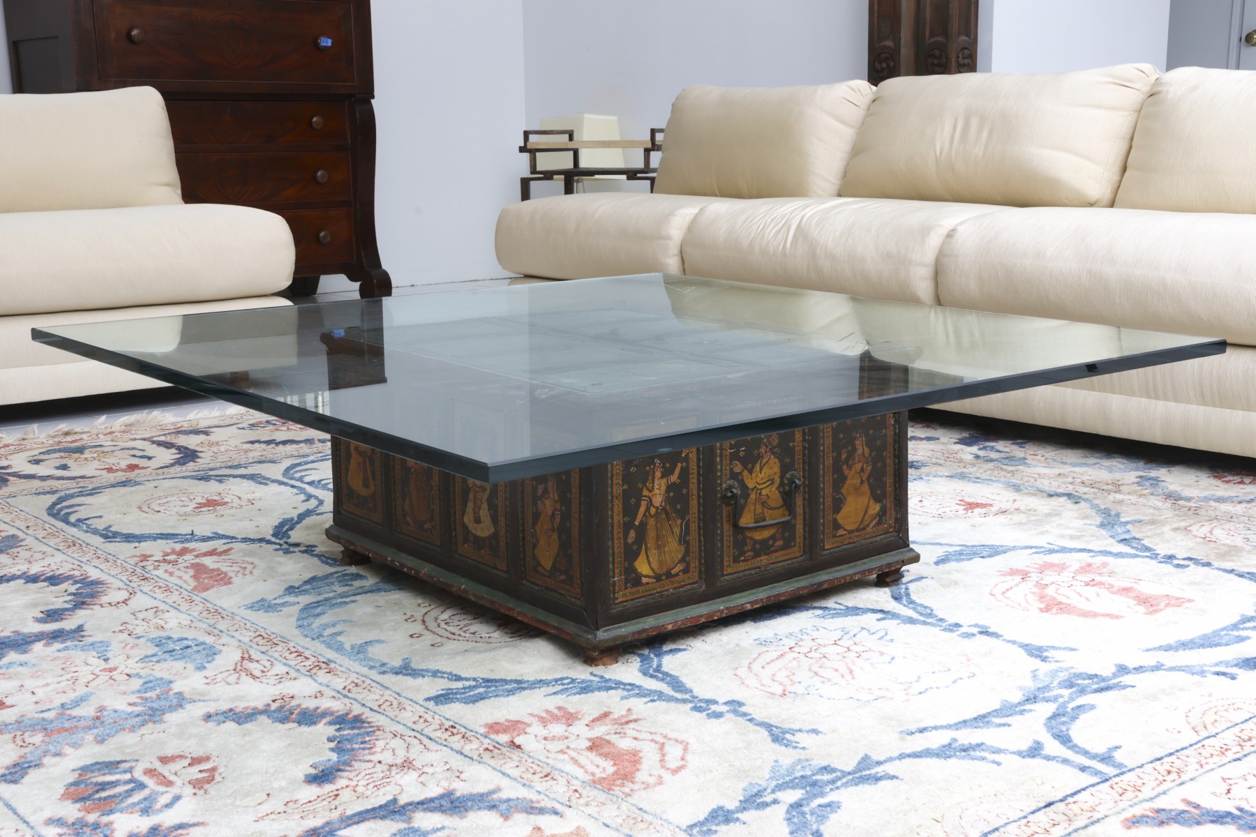 Amazing find. Here we have an antique treasure chest/strongbox that can double as a coffee table. Offered in this listing is the strongbox itself with the removable glass topping. The chest is adorned with ancient Hindu artwork. Chest has significant patina.