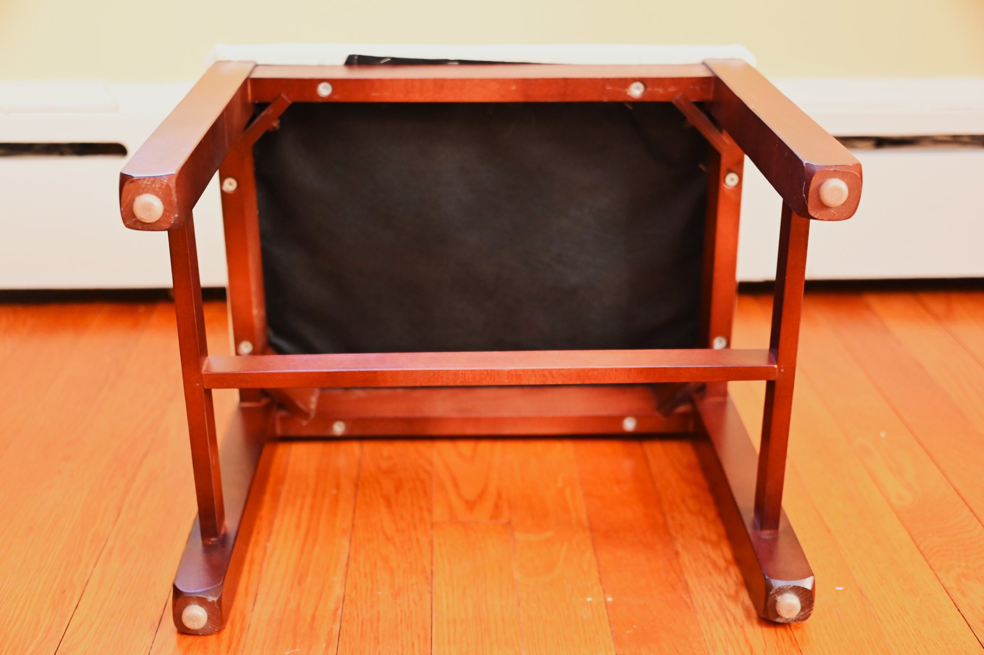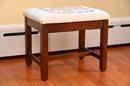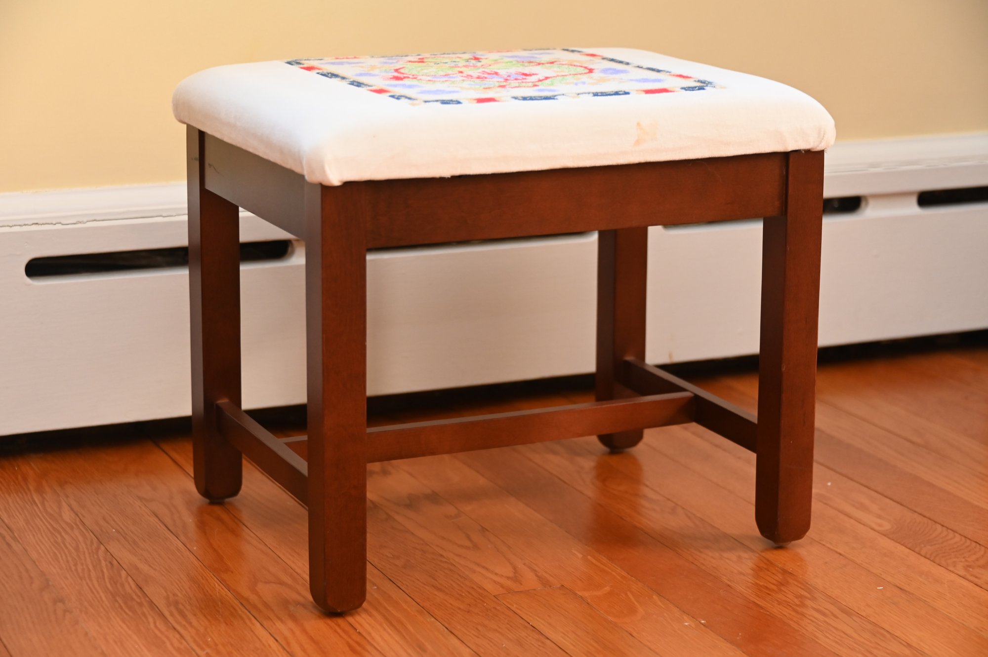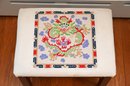 This is a charming wooden stool featuring a cushioned seat with a white fabric cover that has an embroidered decorative design in vibrant colors. The sturdy frame is crafted from warm-toned wood with a simple yet classic design, supported by four straight legs connected by horizontal stretchers for added stability.