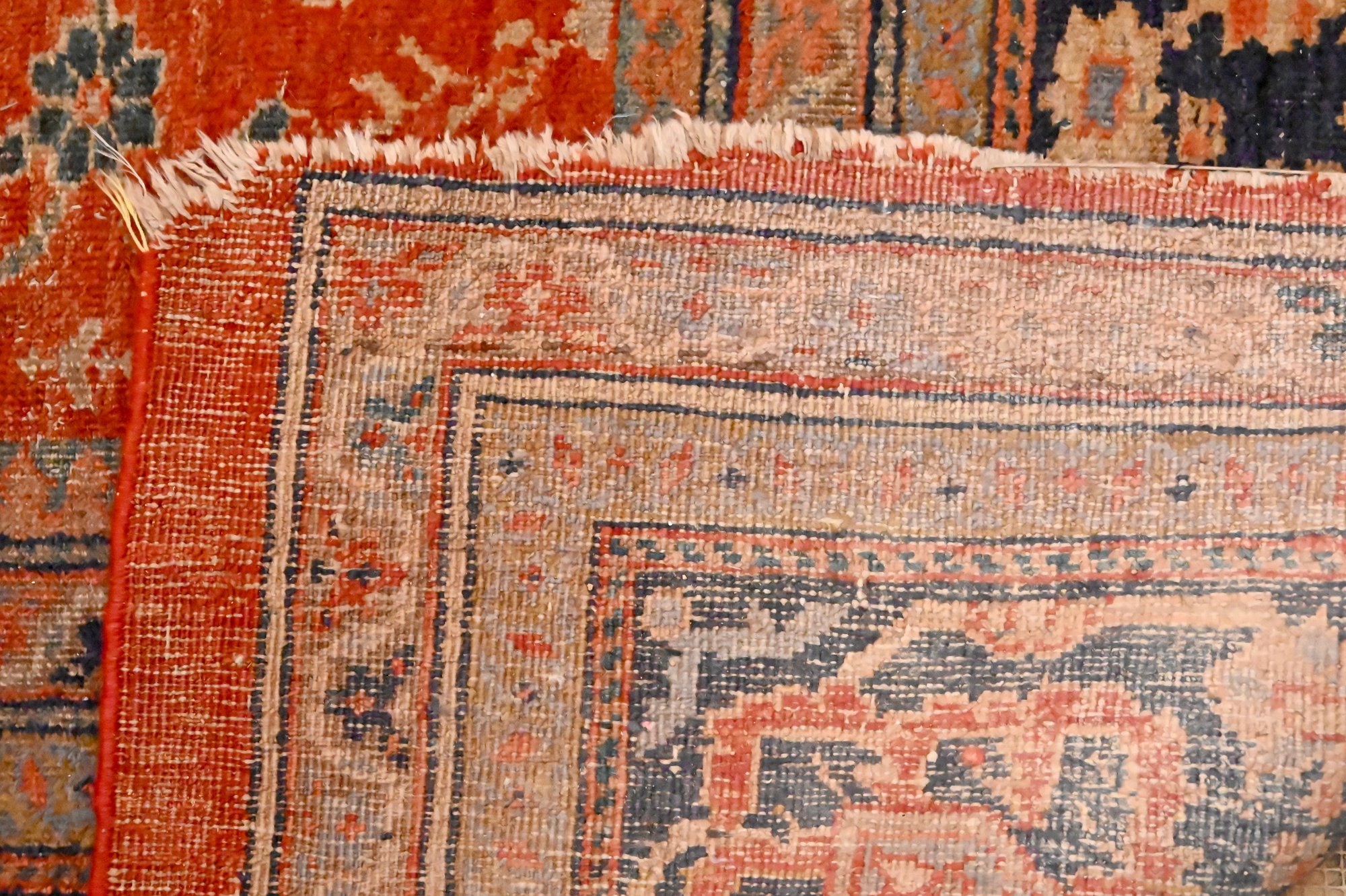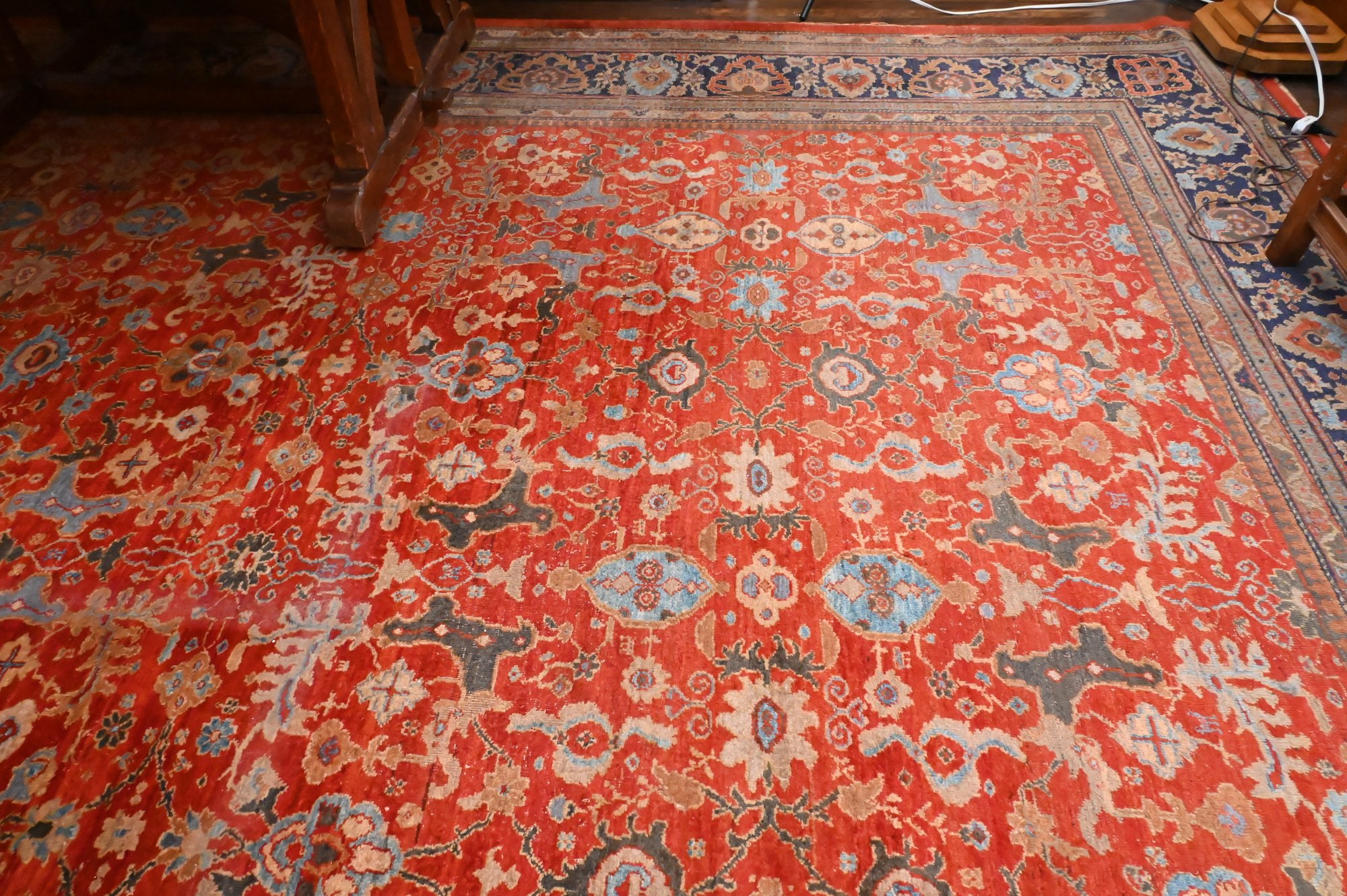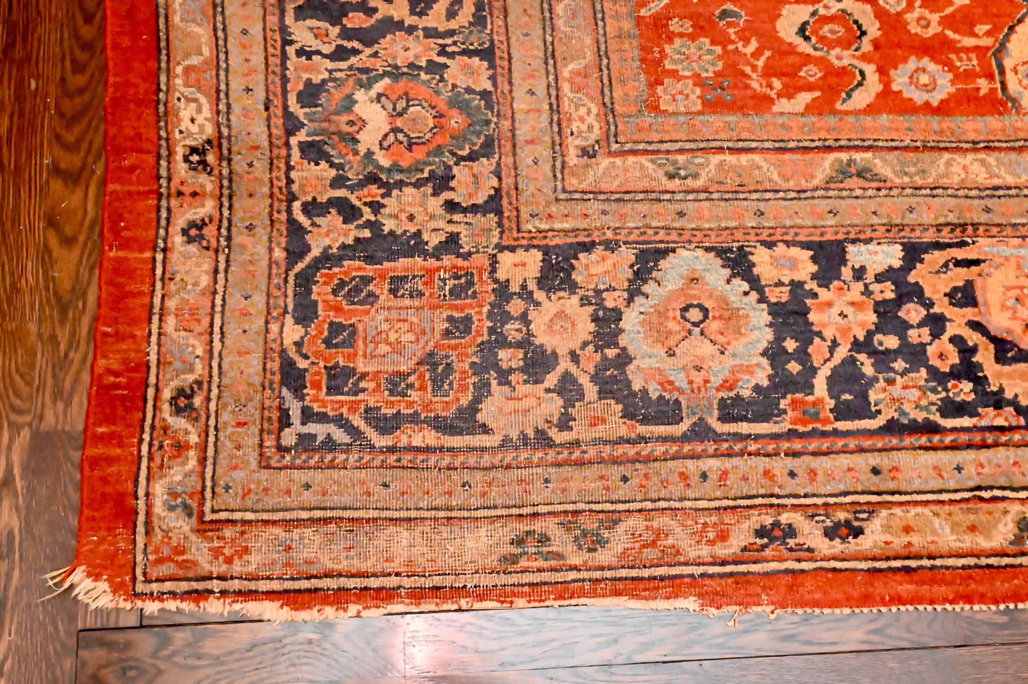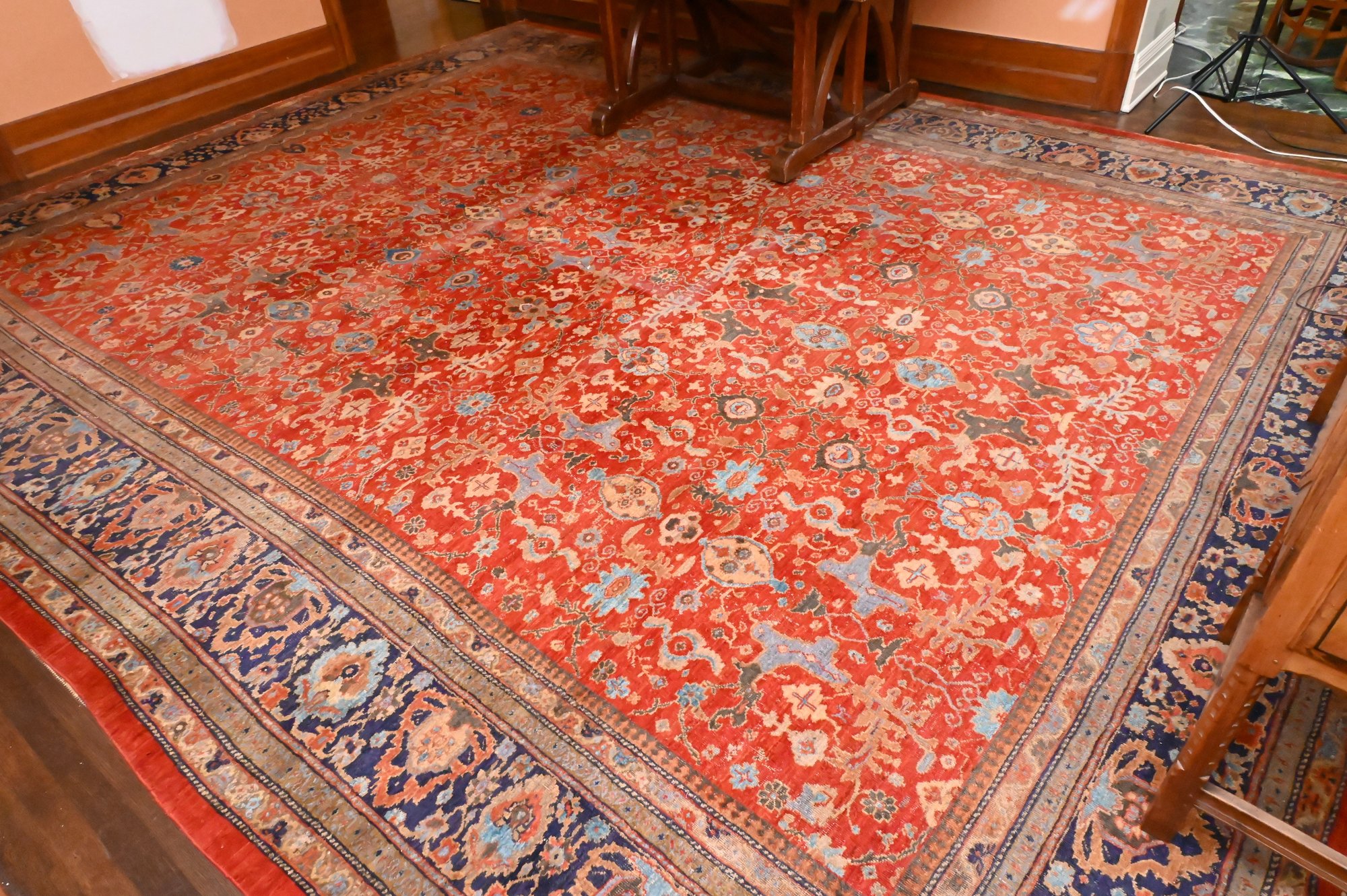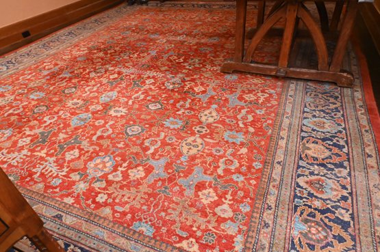 An antique Persian Sultanabad carpet of large rectangular form, handwoven in wool and featuring a richly decorated red field. The design is composed of stylized floral and geometric motifs in light blue, olive, tan, maize, and navy tones, arranged in a balanced, repeating pattern. The field is enclosed by a navy palmette border with multiple guard borders, creating strong visual definition. The scale and drawing are characteristic of Sultanabad weavings, known for their decorative versatility and soft palette variations within a structured design.