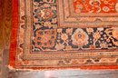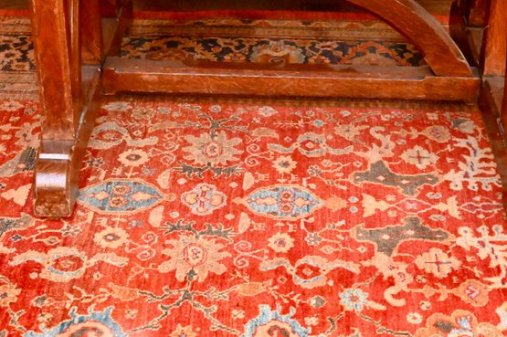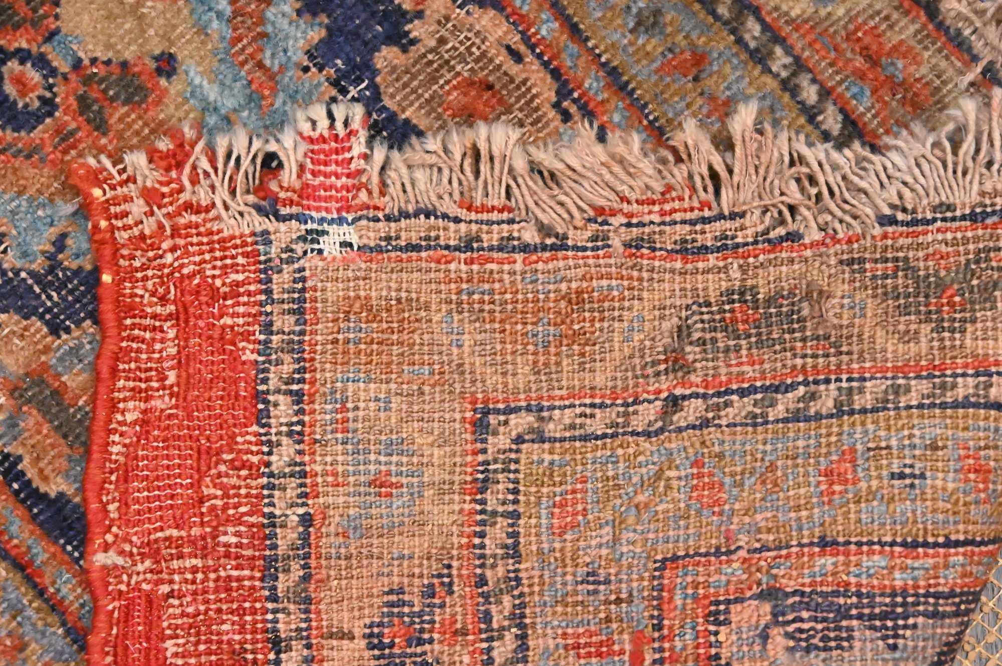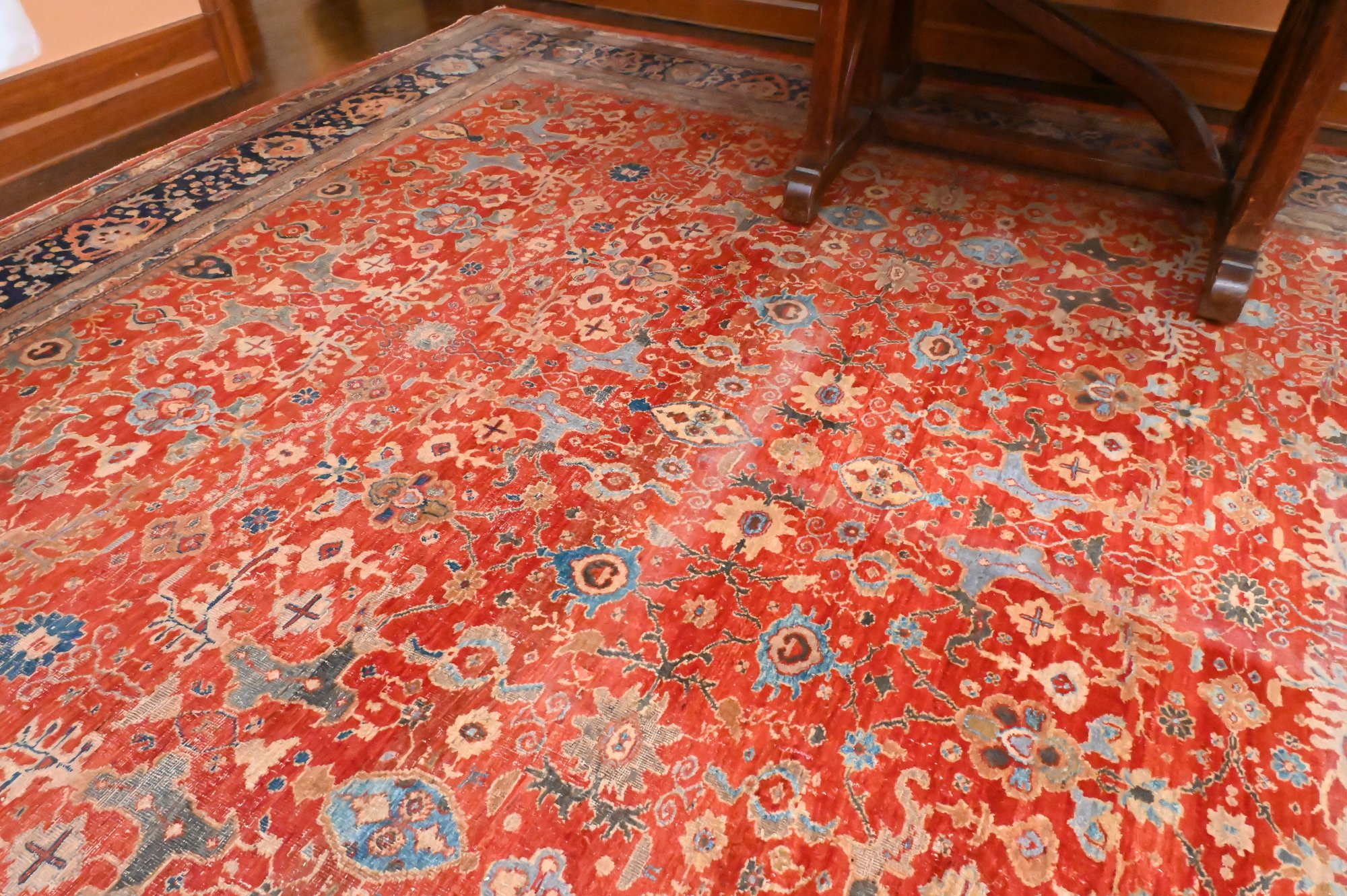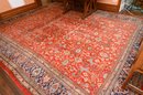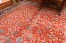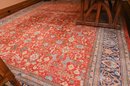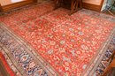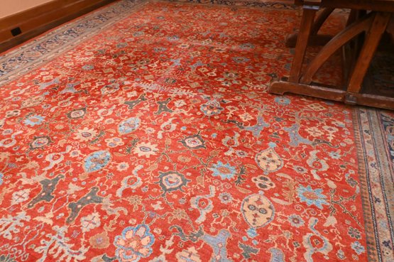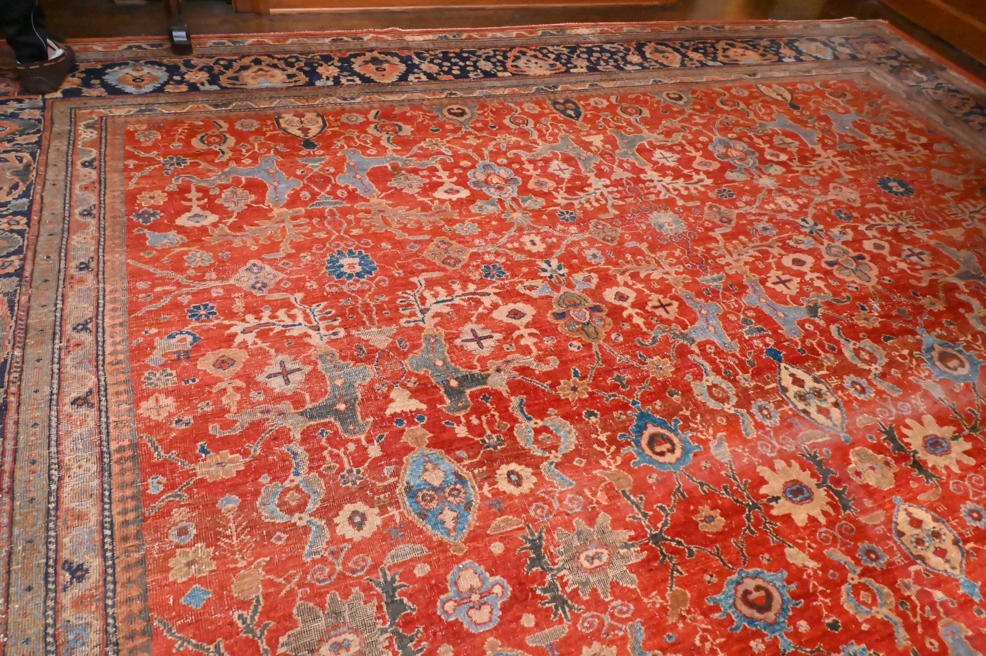 An antique Persian Sultanabad carpet of large rectangular form, handwoven in wool and featuring a richly decorated red field. The design is composed of stylized floral and geometric motifs in light blue, olive, tan, maize, and navy tones, arranged in a balanced, repeating pattern. The field is enclosed by a navy palmette border with multiple guard borders, creating strong visual definition. The scale and drawing are characteristic of Sultanabad weavings, known for their decorative versatility and soft palette variations within a structured design.