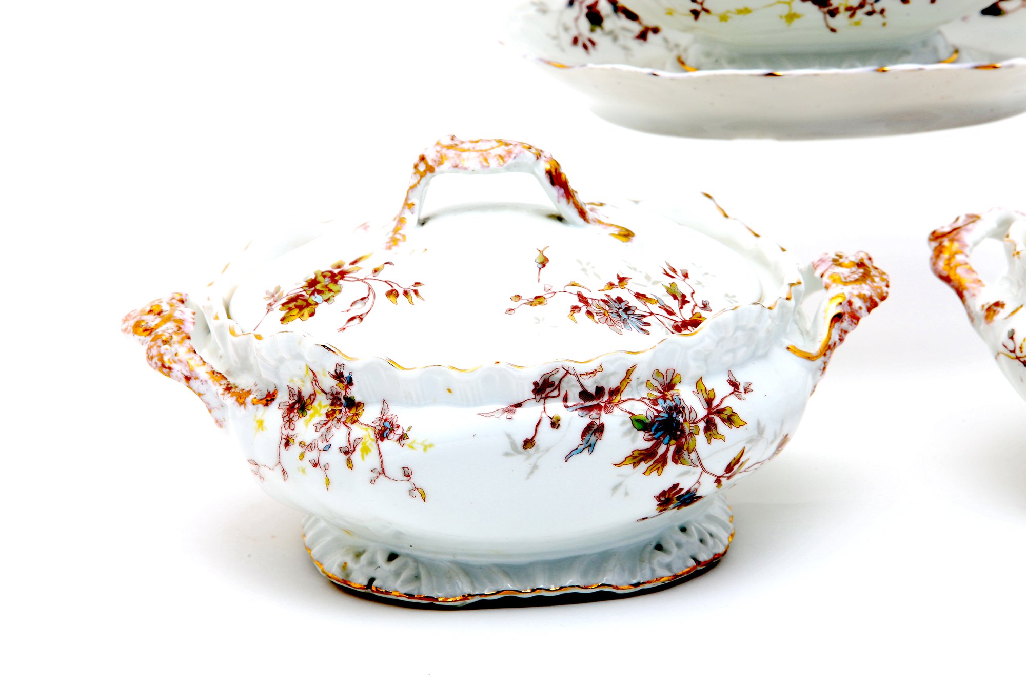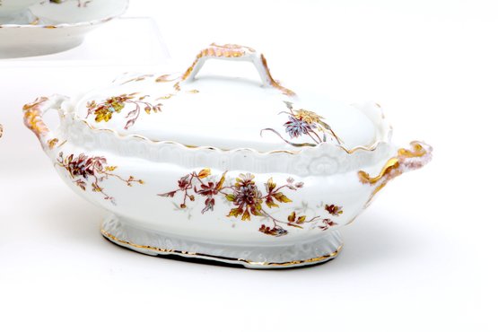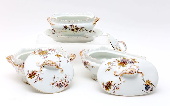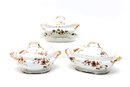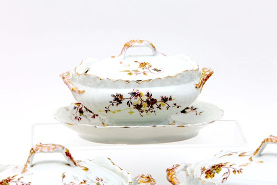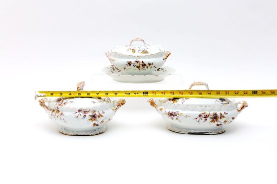 3pc Antique S & S Limoges France covered casserole dishes, excellent condition. Rare pieces with lovely flowers, leaves & gold trim.