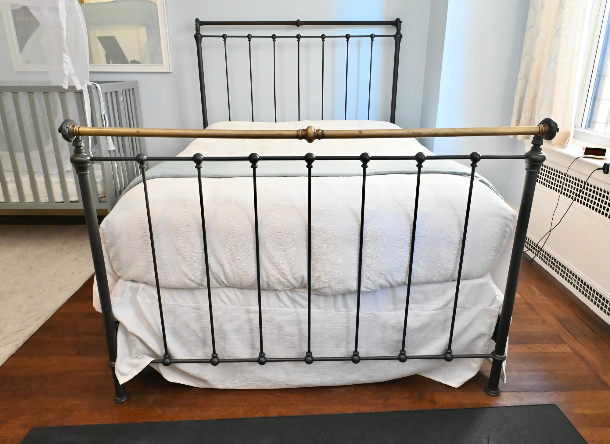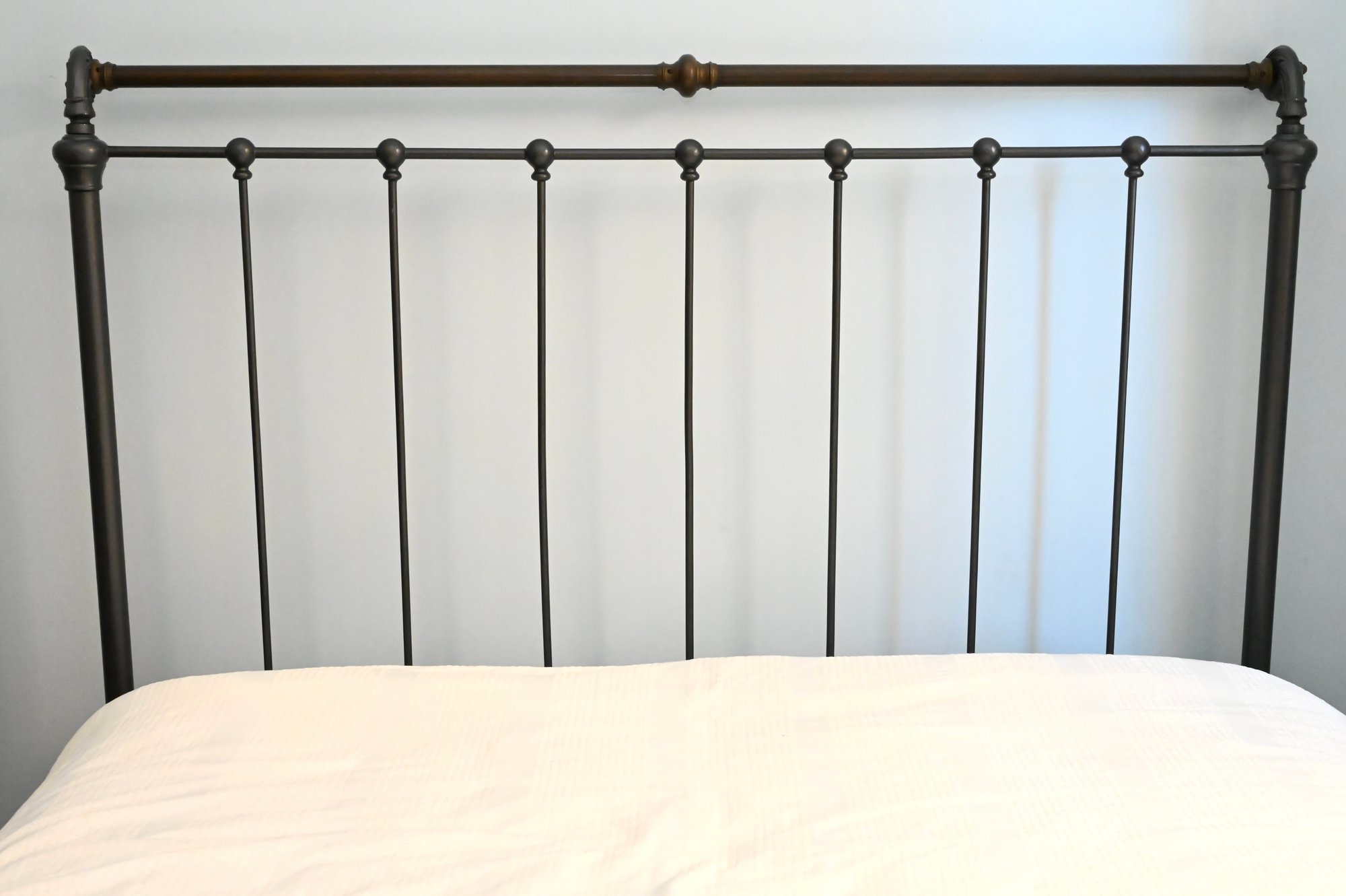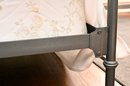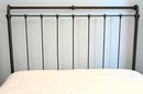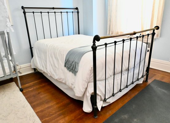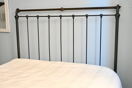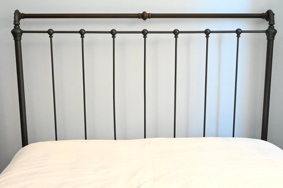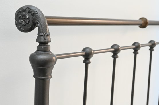Metal bed frame with tall rectangular headboard and lower matching footboard, constructed with vertical spindle bars and rounded corner posts. The frame features a dark finish with contrasting warmer-toned metal on the top rail of the footboard. Decorative cast elements appear at the corners and joints, with simple finial-style detailing. Clean, linear design with traditional proportions.