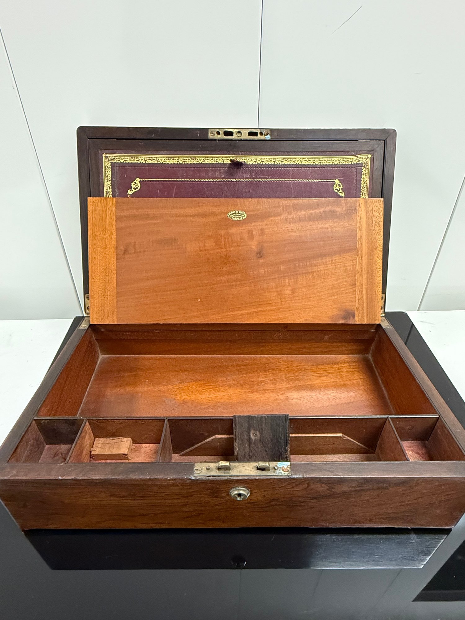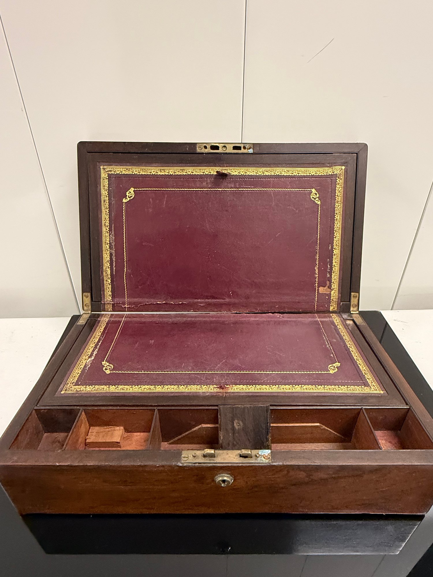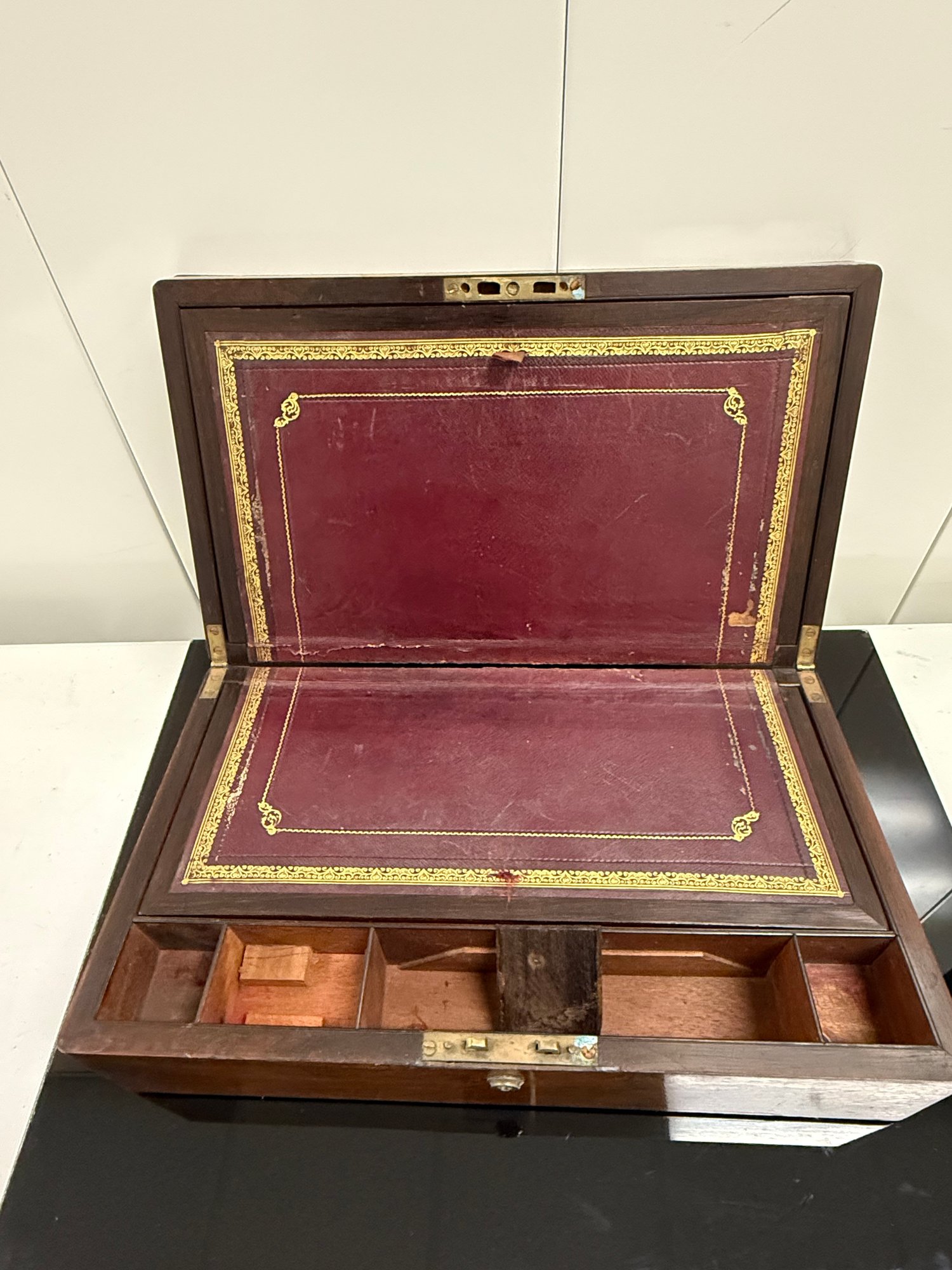 Antique (18th to early 20th c.) portable writing box with a hinged lid opening to a leather-covered writing surface and interior compartments for pens, ink, and paper.