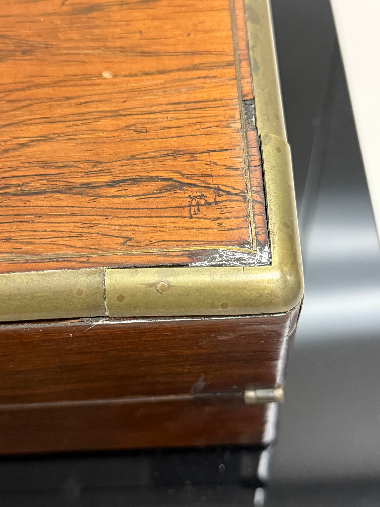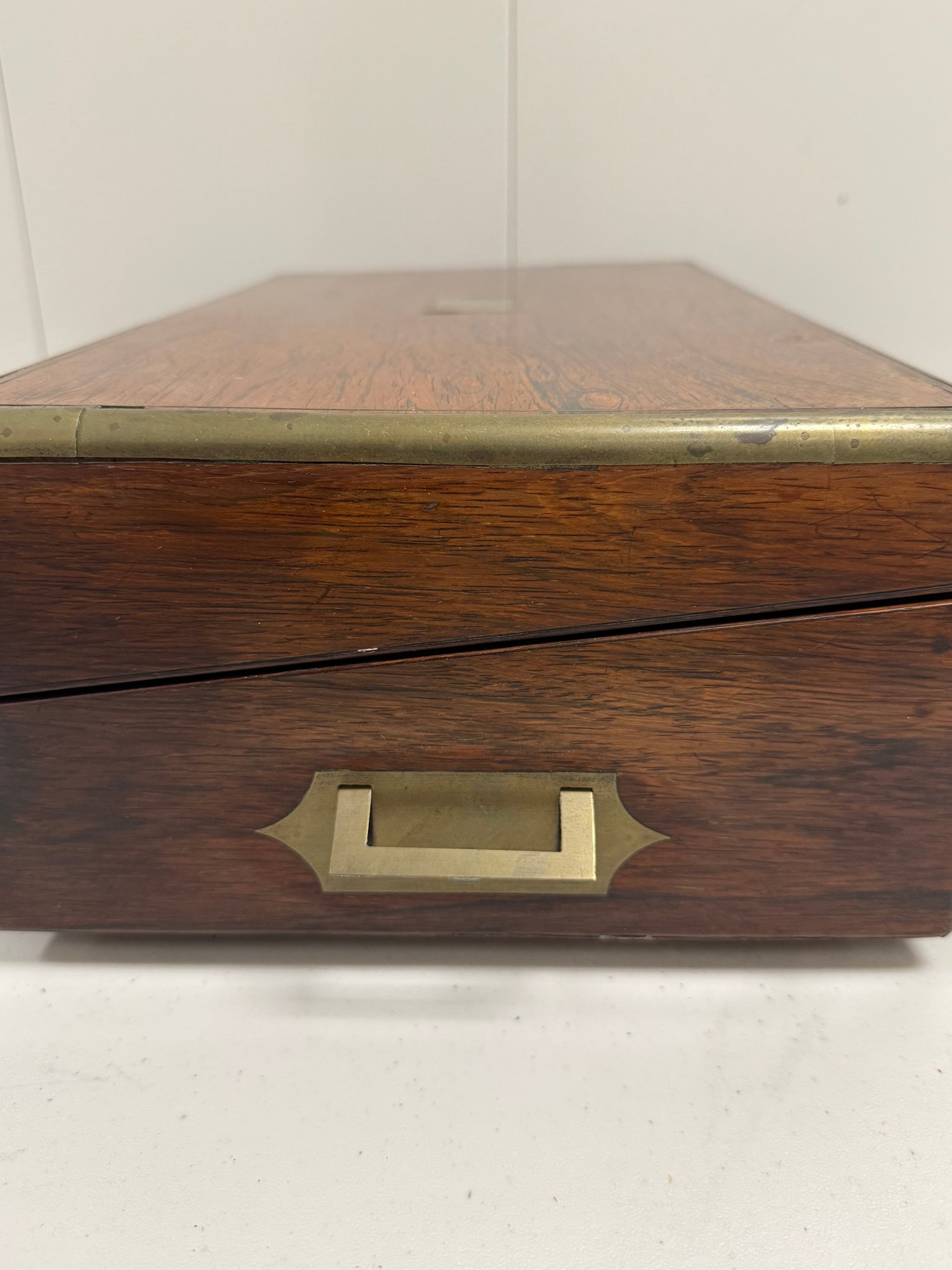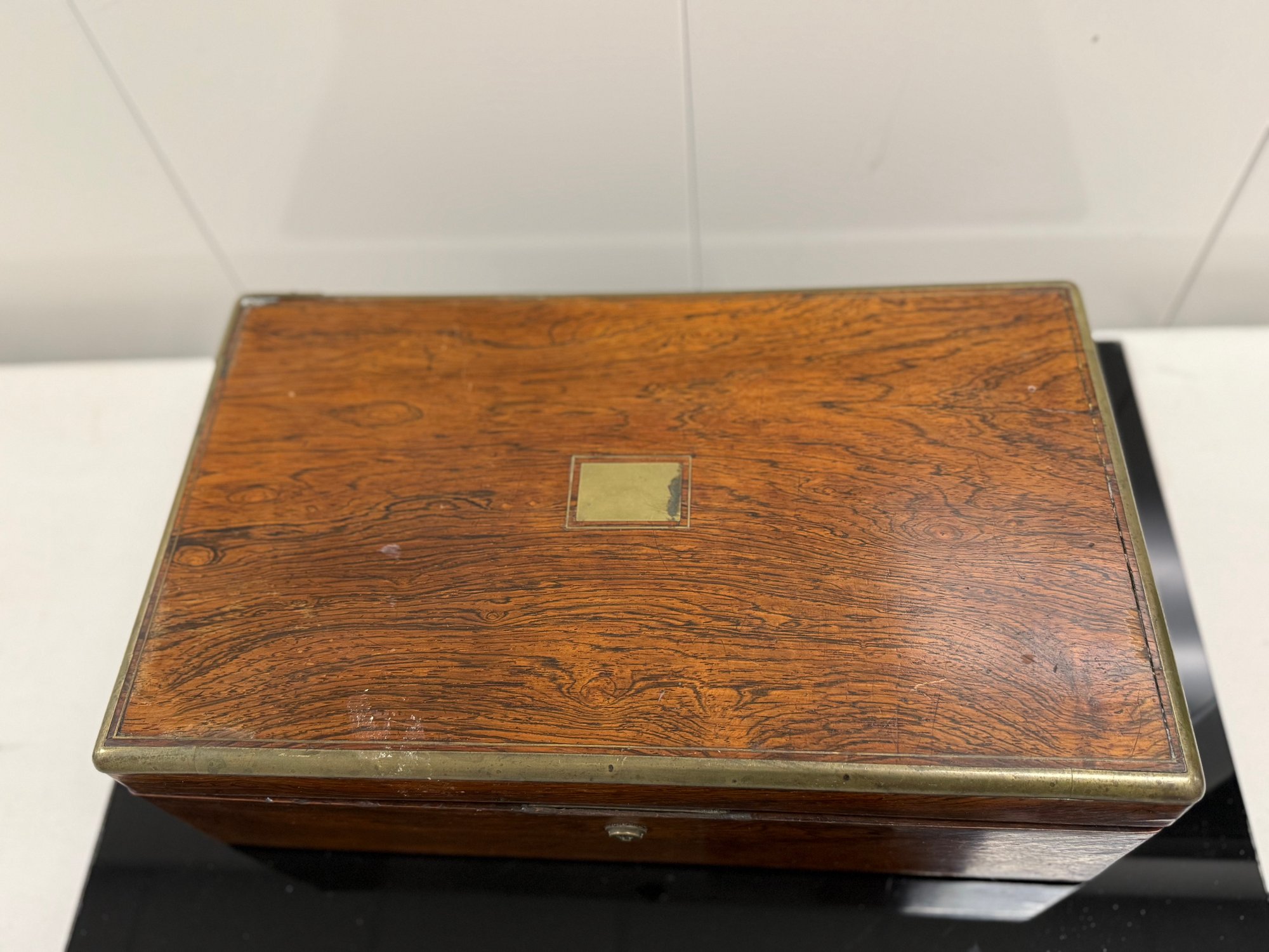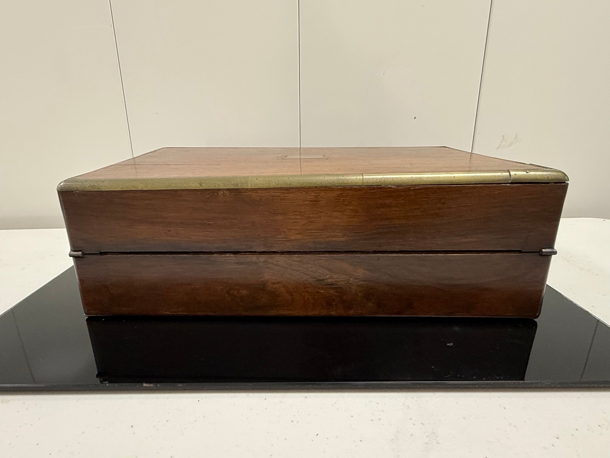 Antique (18th to early 20th c.) portable writing box with a hinged lid opening to a leather-covered writing surface and interior compartments for pens, ink, and paper.