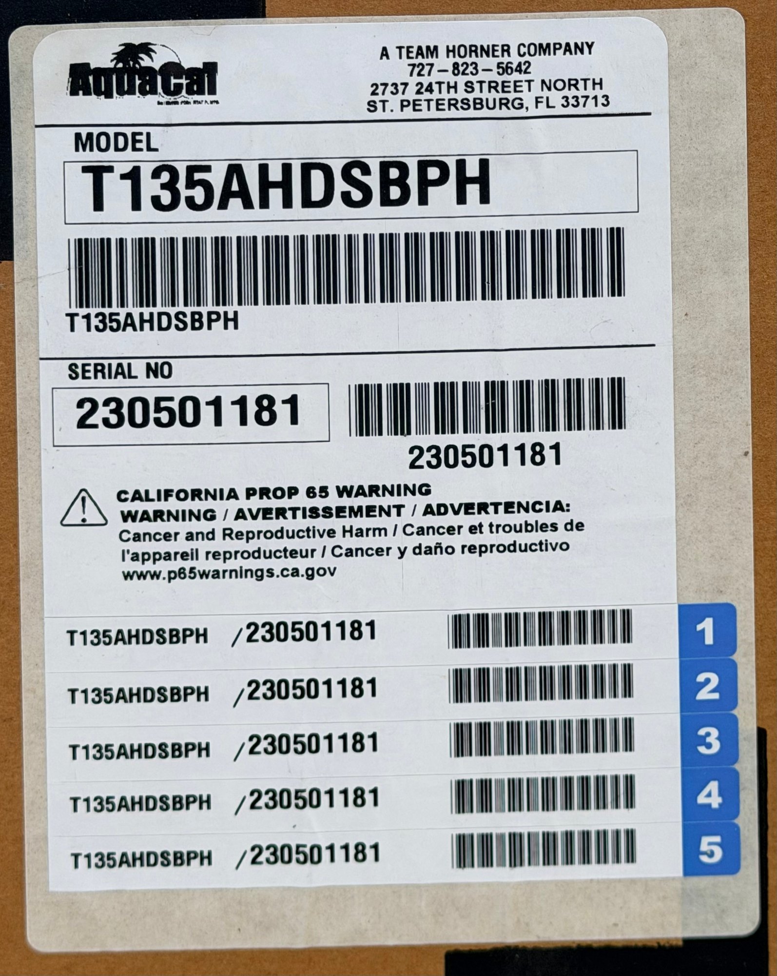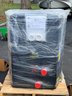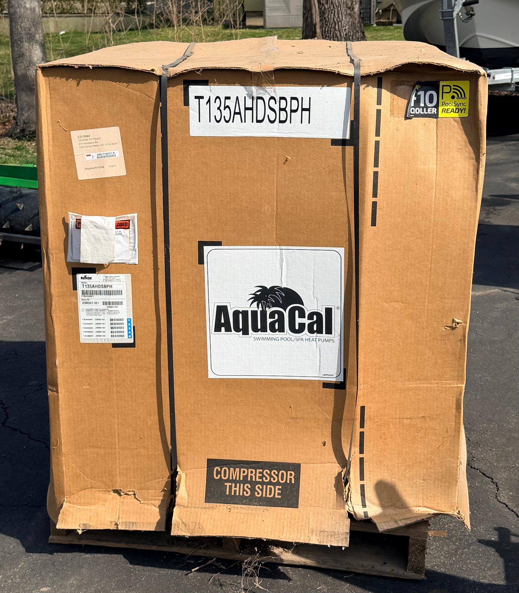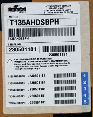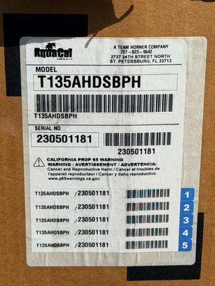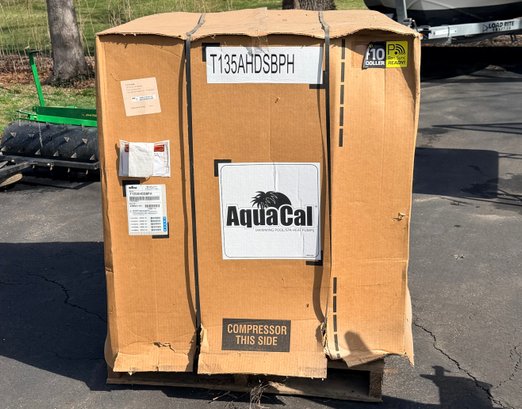 AquaCal TropiCal swimming pool heat pump, model T135AHDSBPH, designed for efficient pool heating. Unit features a compact black composite housing with front access panel and plumbing connections. Intended for residential pool use, providing energy-efficient temperature control. Appears to be new or unused, still wrapped in protective plastic and mounted on a pallet, with manufacturer labeling and documentation attached.