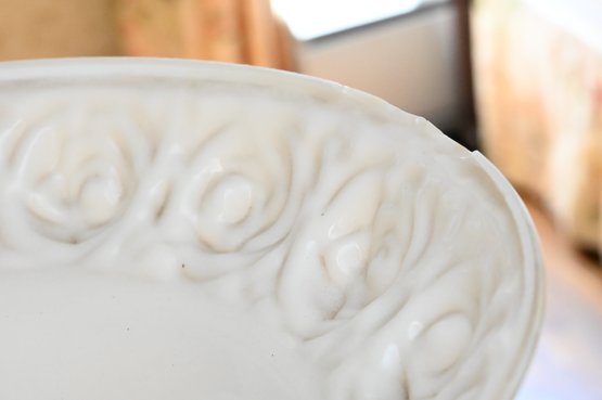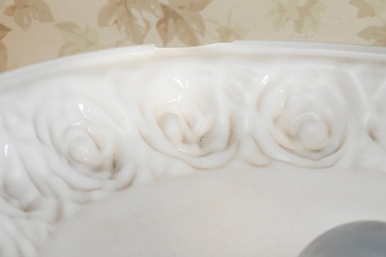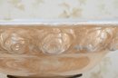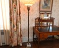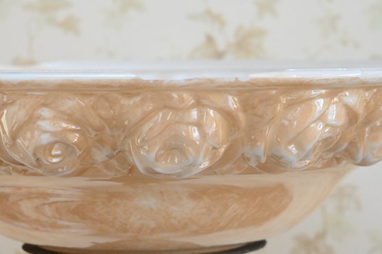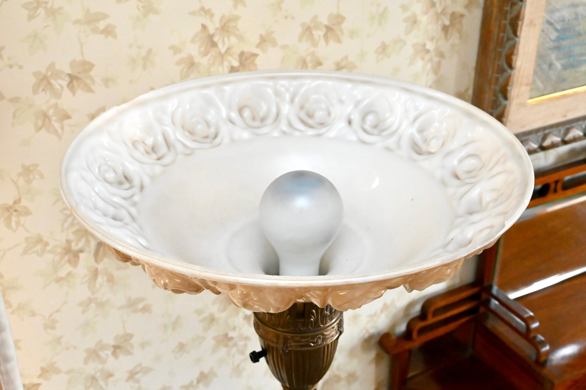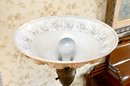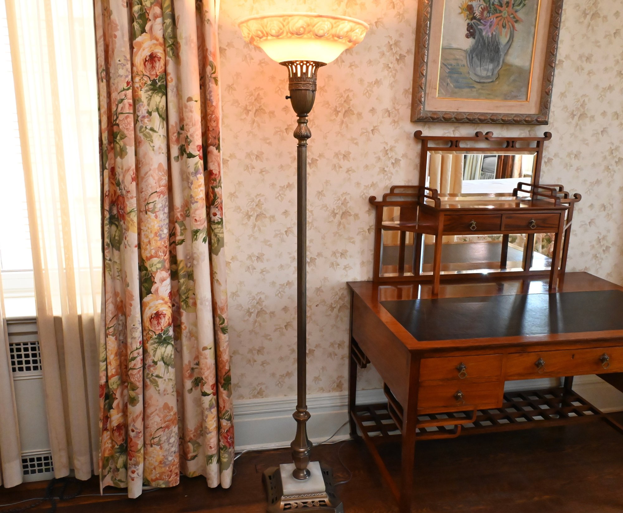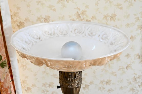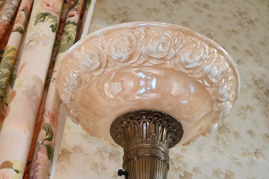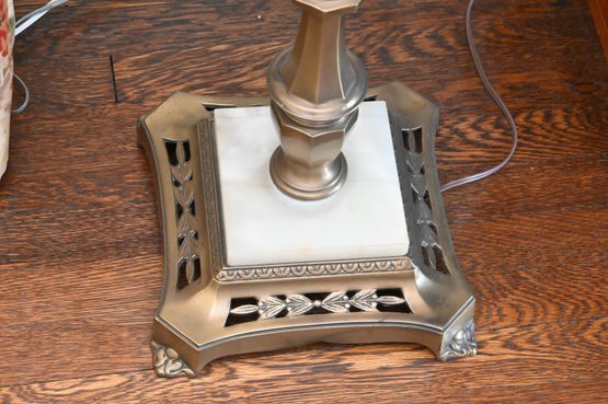 Good overall condition consistent with age and use. Minor surface wear and light marks to the brass and marble base. The glass shade appears intact with no visible damage. Electrified and functional.16” diameter shade, 3-way light. Damage to shade as shown in photos