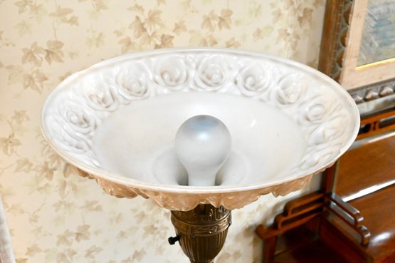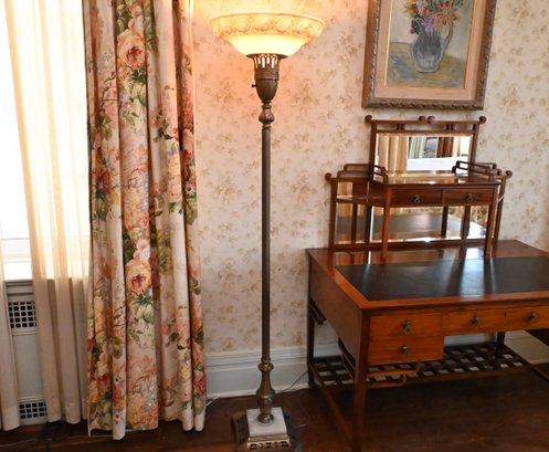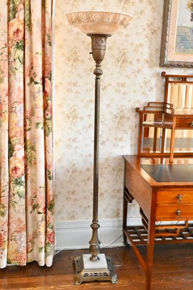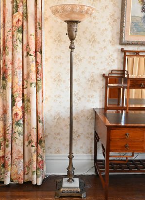An Art Deco torchiere floor lamp featuring a slender, fluted brass column rising to a decorative capital supporting an upward-facing frosted glass bowl shade with molded detail. The lamp is set on a shaped marble base, providing both contrast and stability. The design combines clean vertical lines with subtle classical ornament, characteristic of early 20th-century Art Deco lighting.
