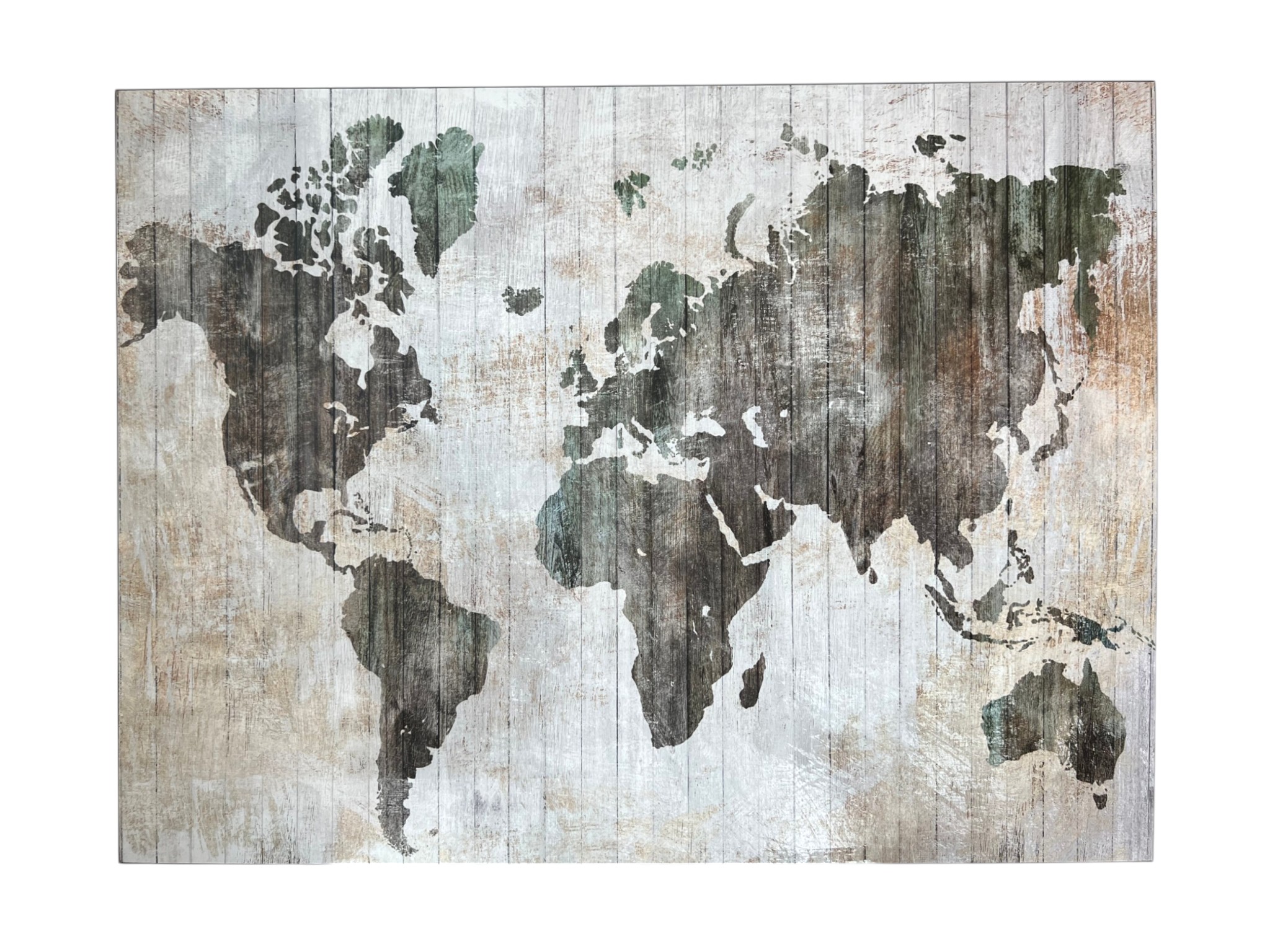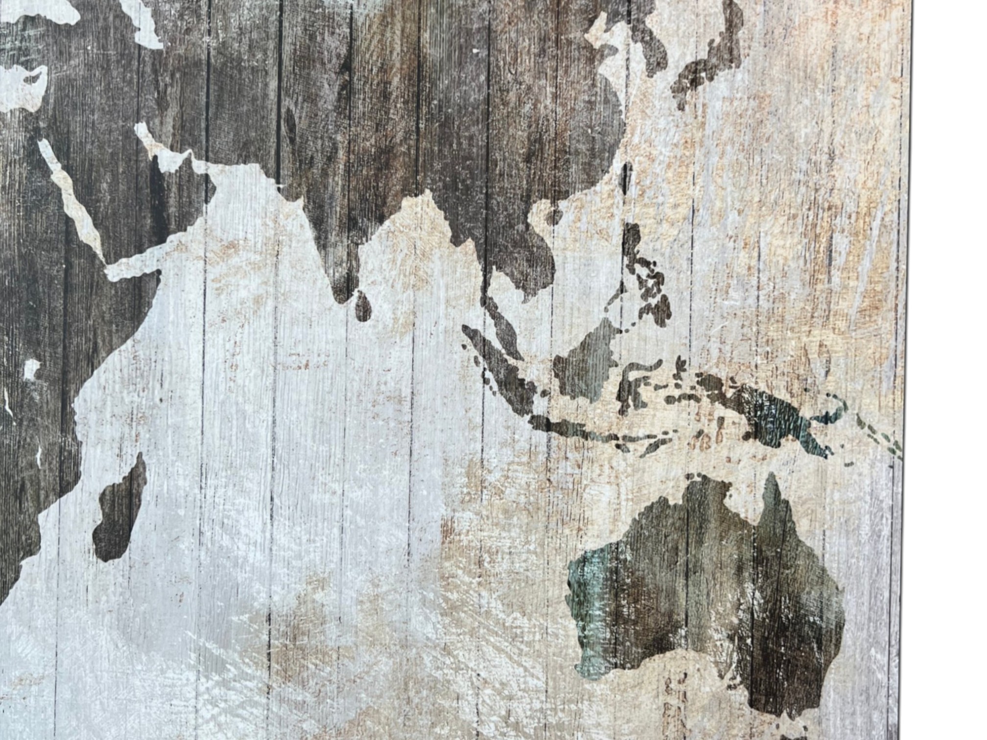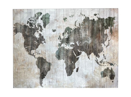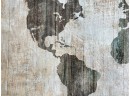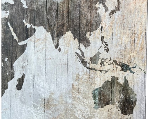 "World Map I" by Isabelle Z (American, 21st c.) canvas art print, featuring a vintage, weathered aesthetic with the world map overlaid on a background that resembles vertical wood planks.