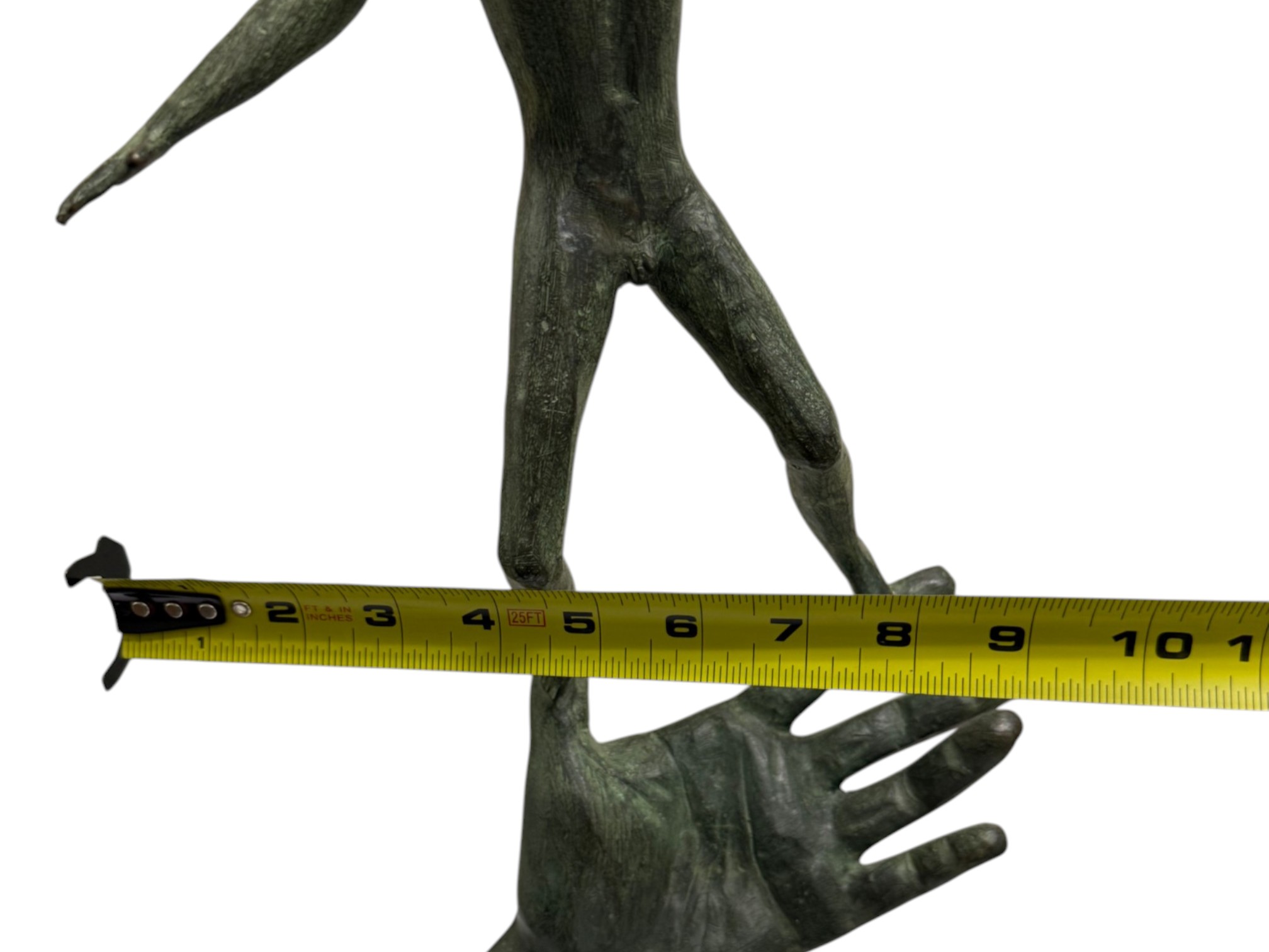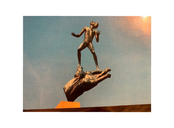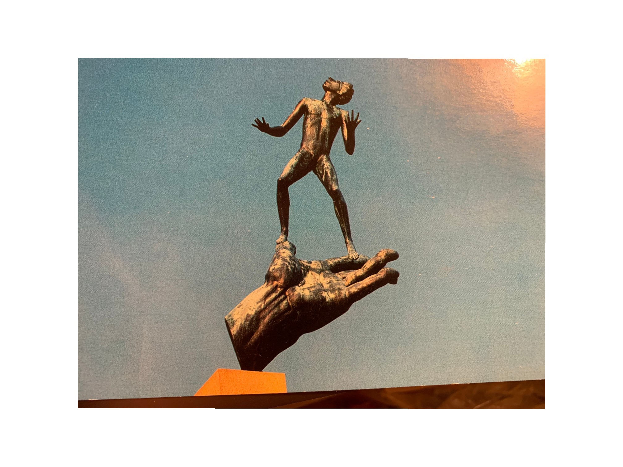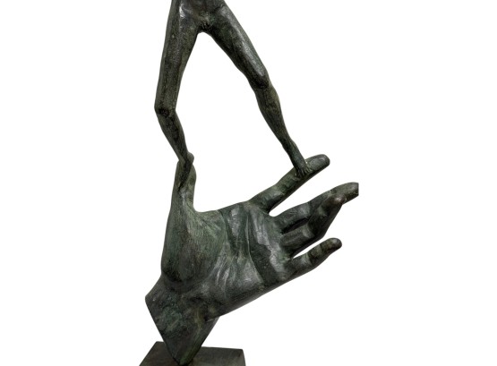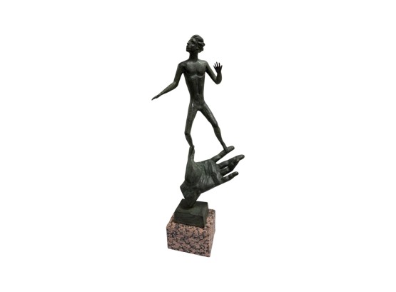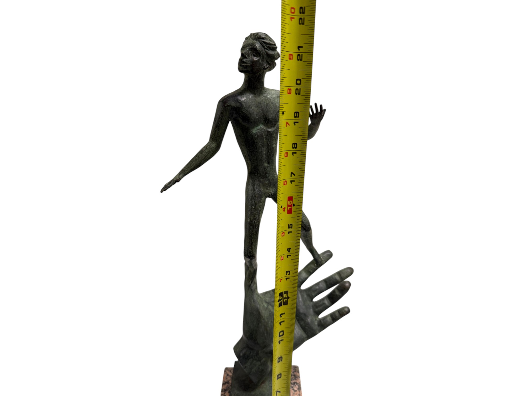 Green patinated bronze sculpture, mounted on stone plinth, depicting a rising human figure supported by an outstretched "divine" hand.