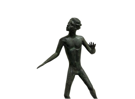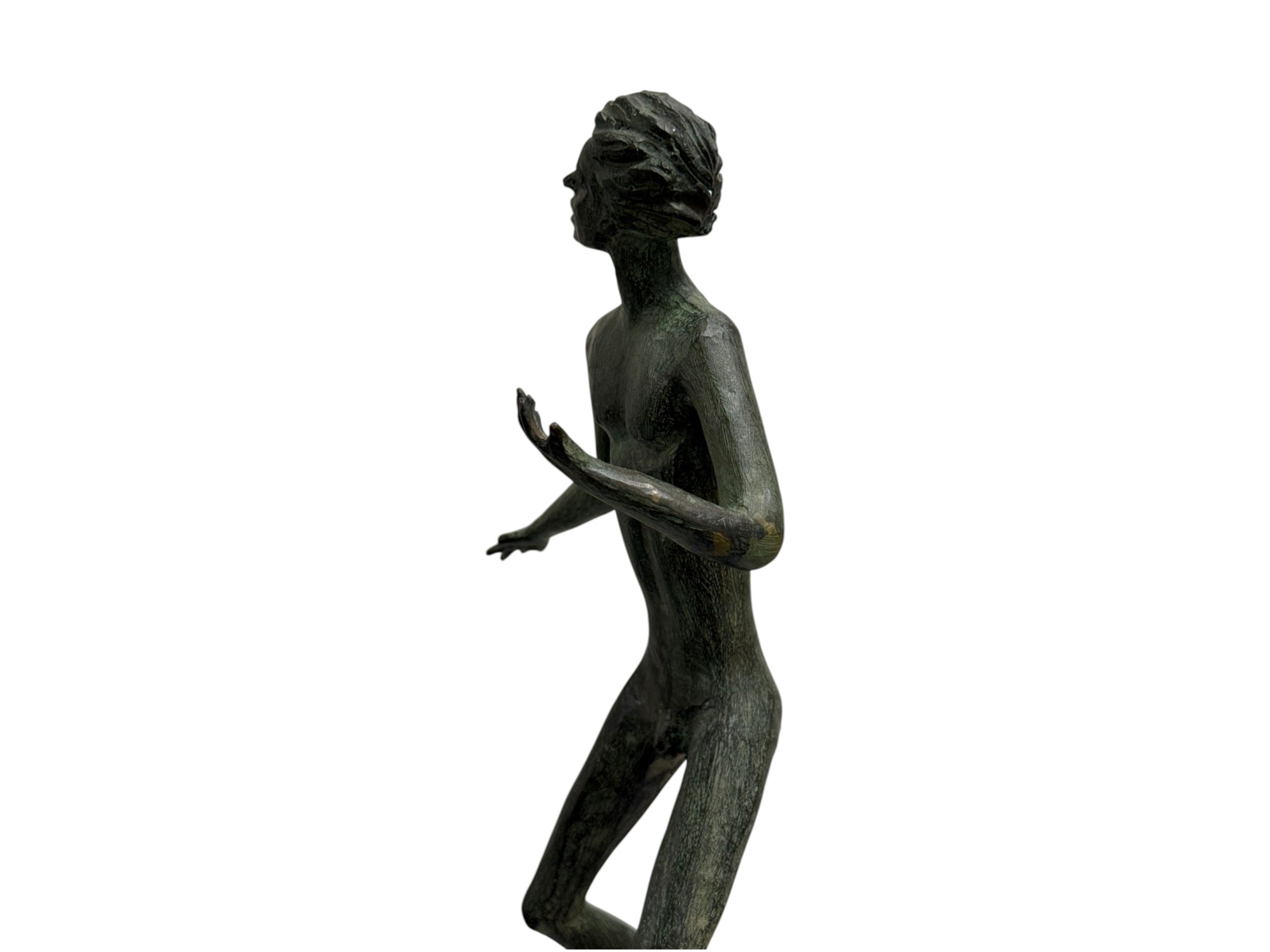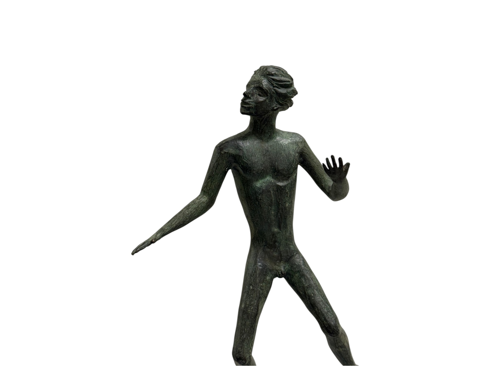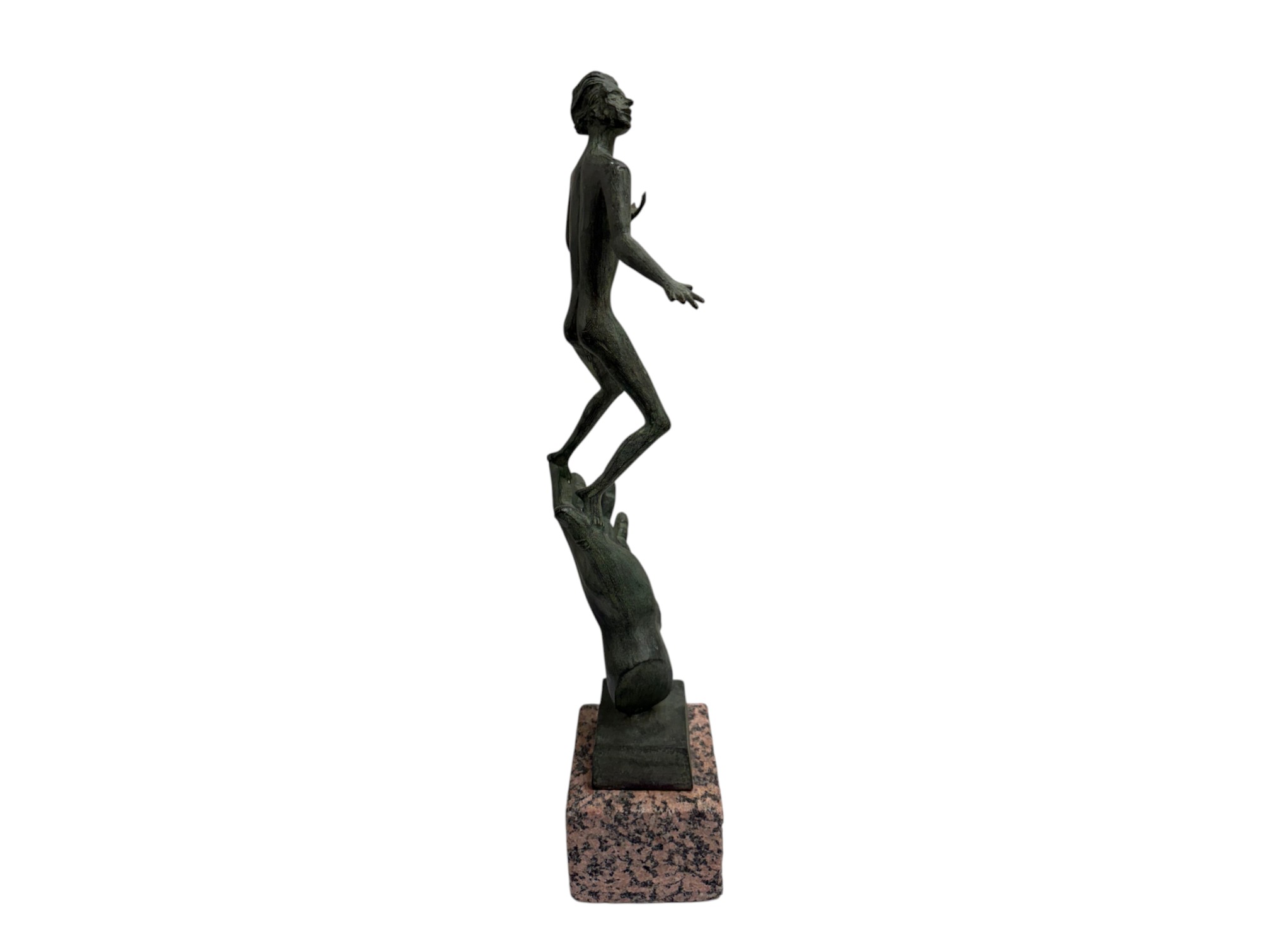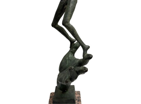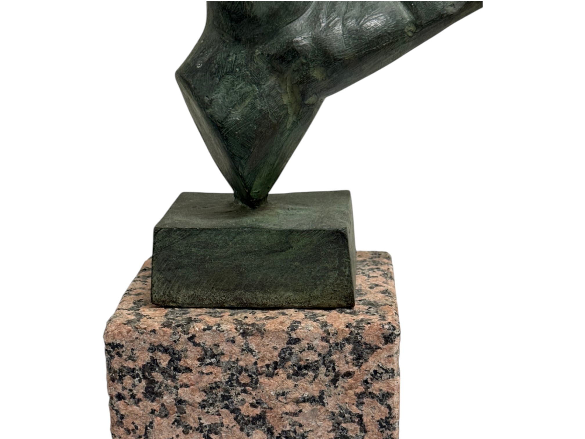 Green patinated bronze sculpture, mounted on stone plinth, depicting a rising human figure supported by an outstretched "divine" hand.